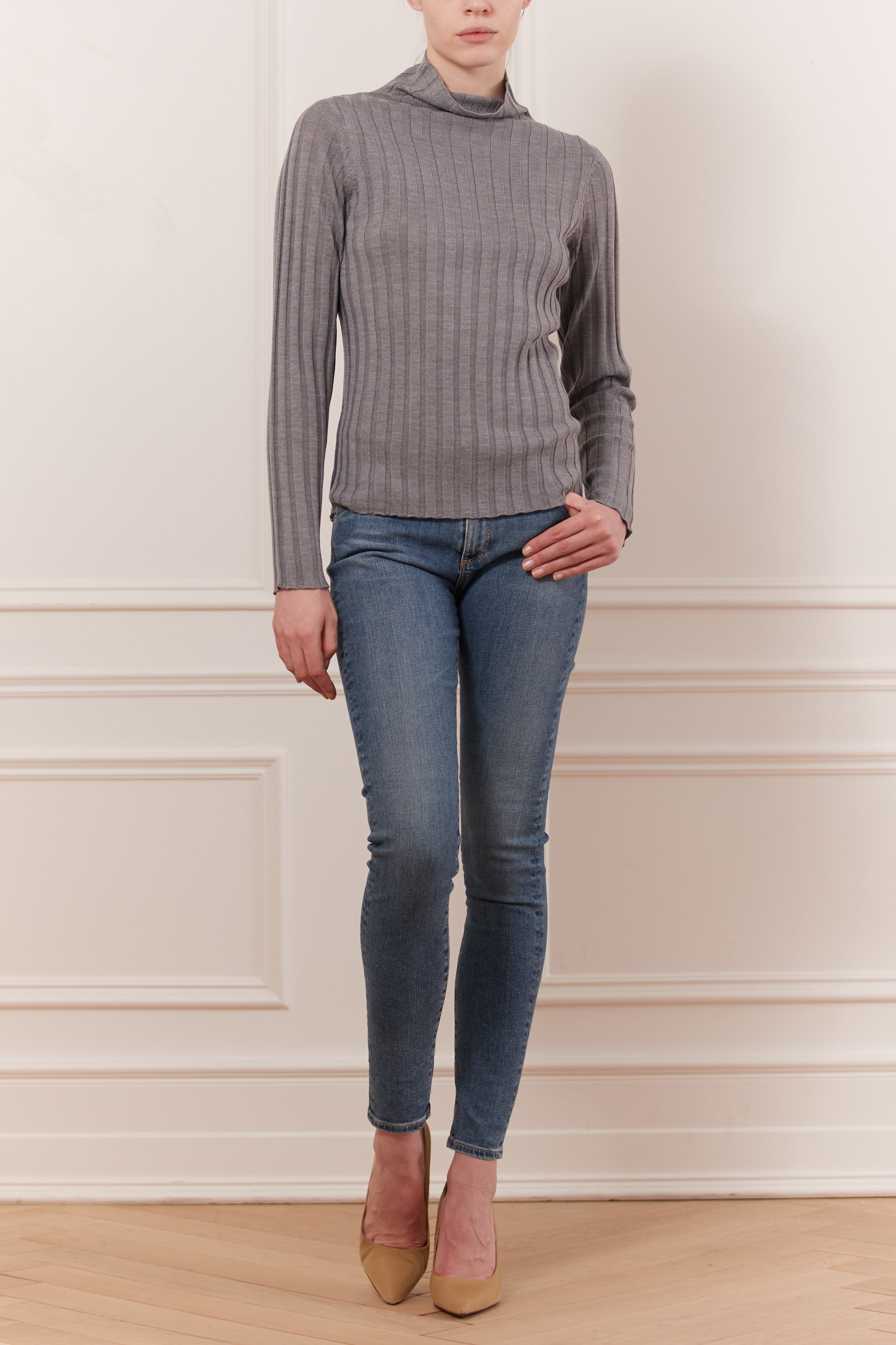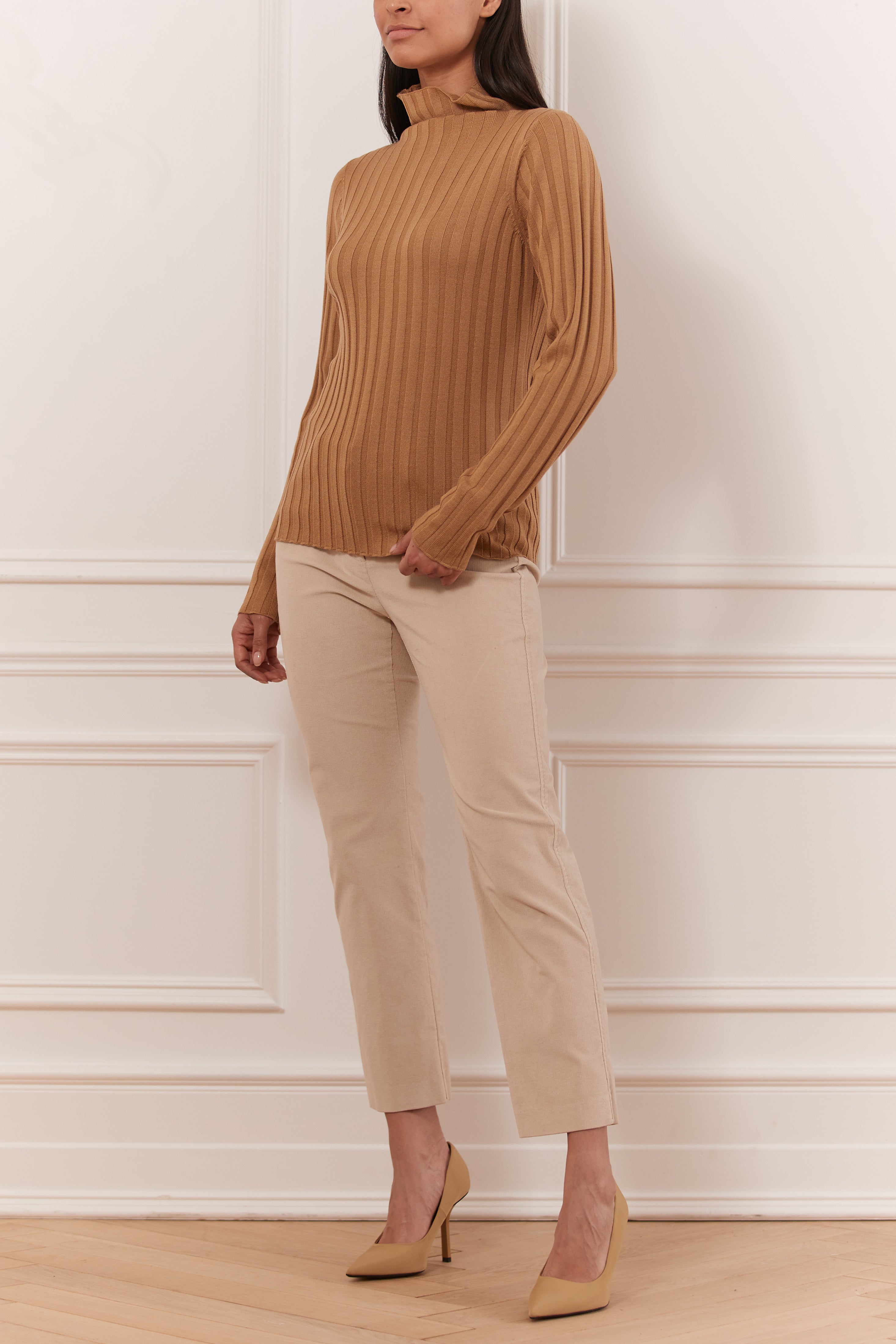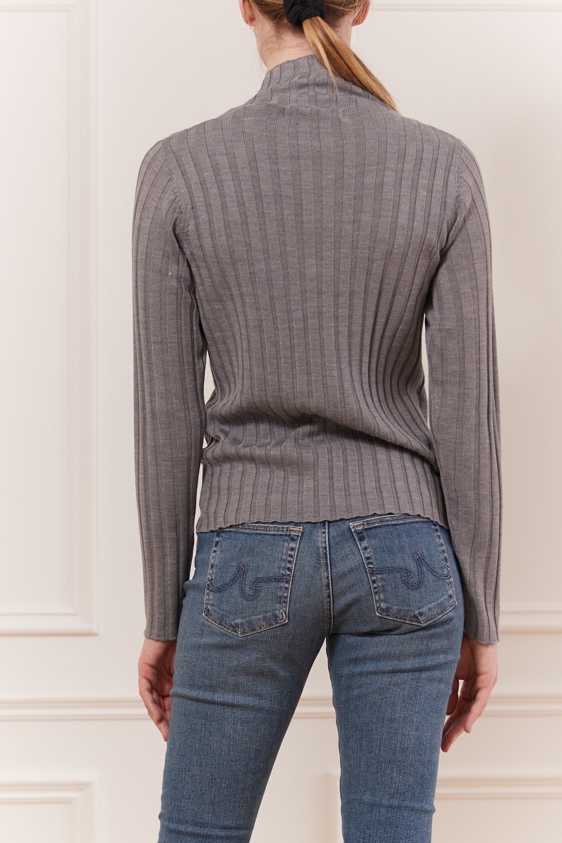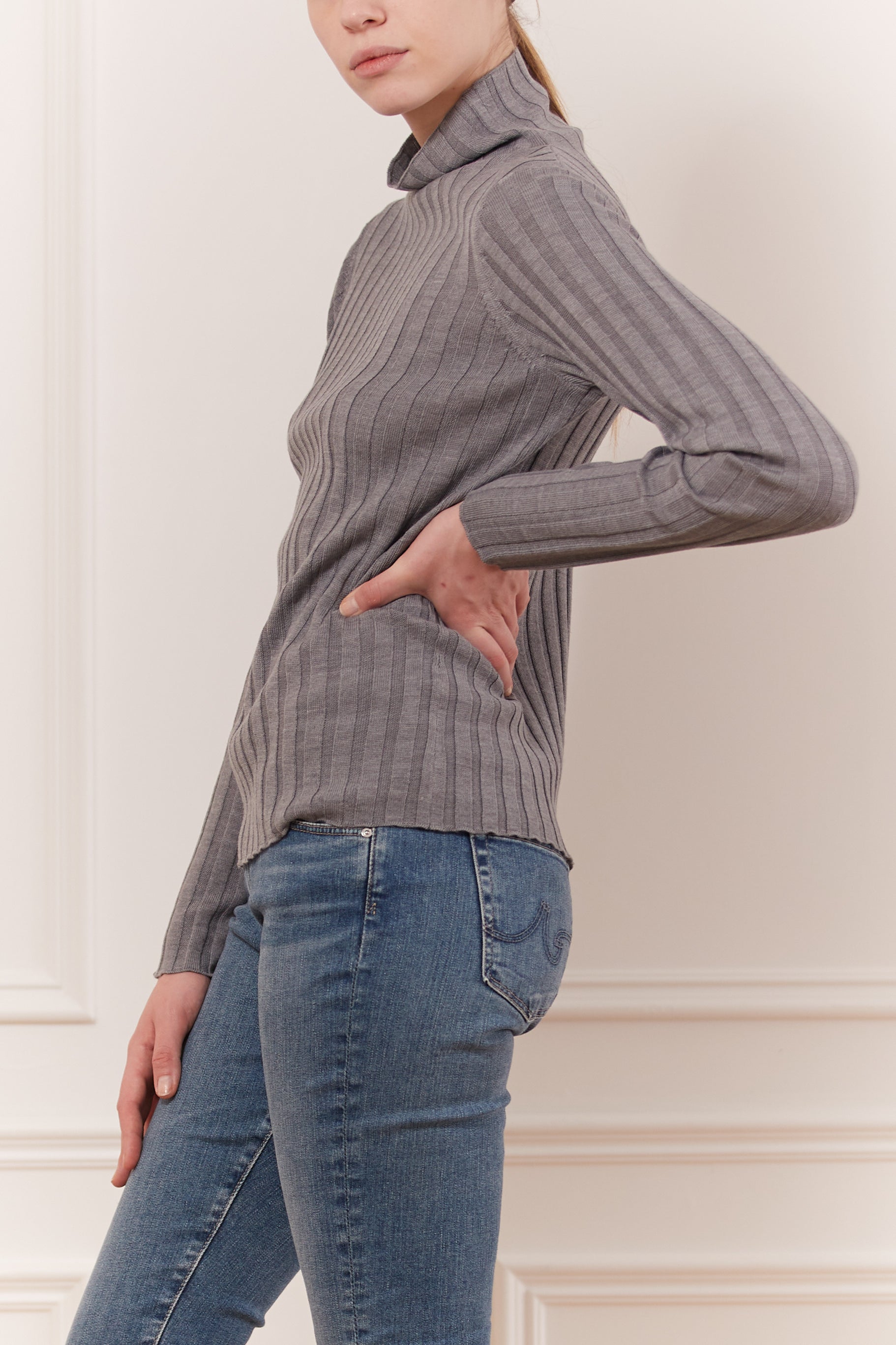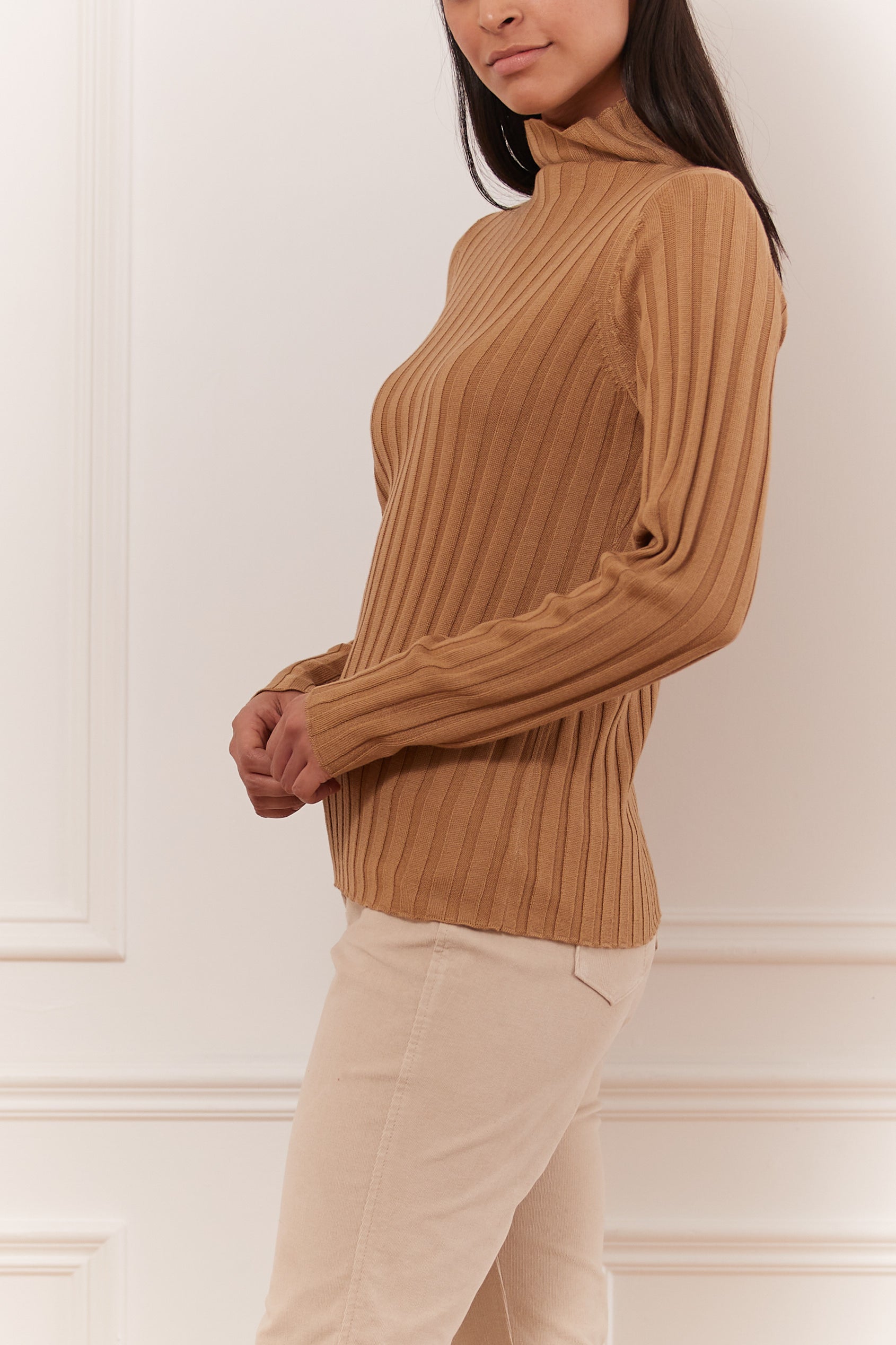 Laine douce mélangée avec des détails côtelés. Col roulé à manches longues avec col montant côtelé. Idéal pour un look décontracté et un désir de confort absolu.