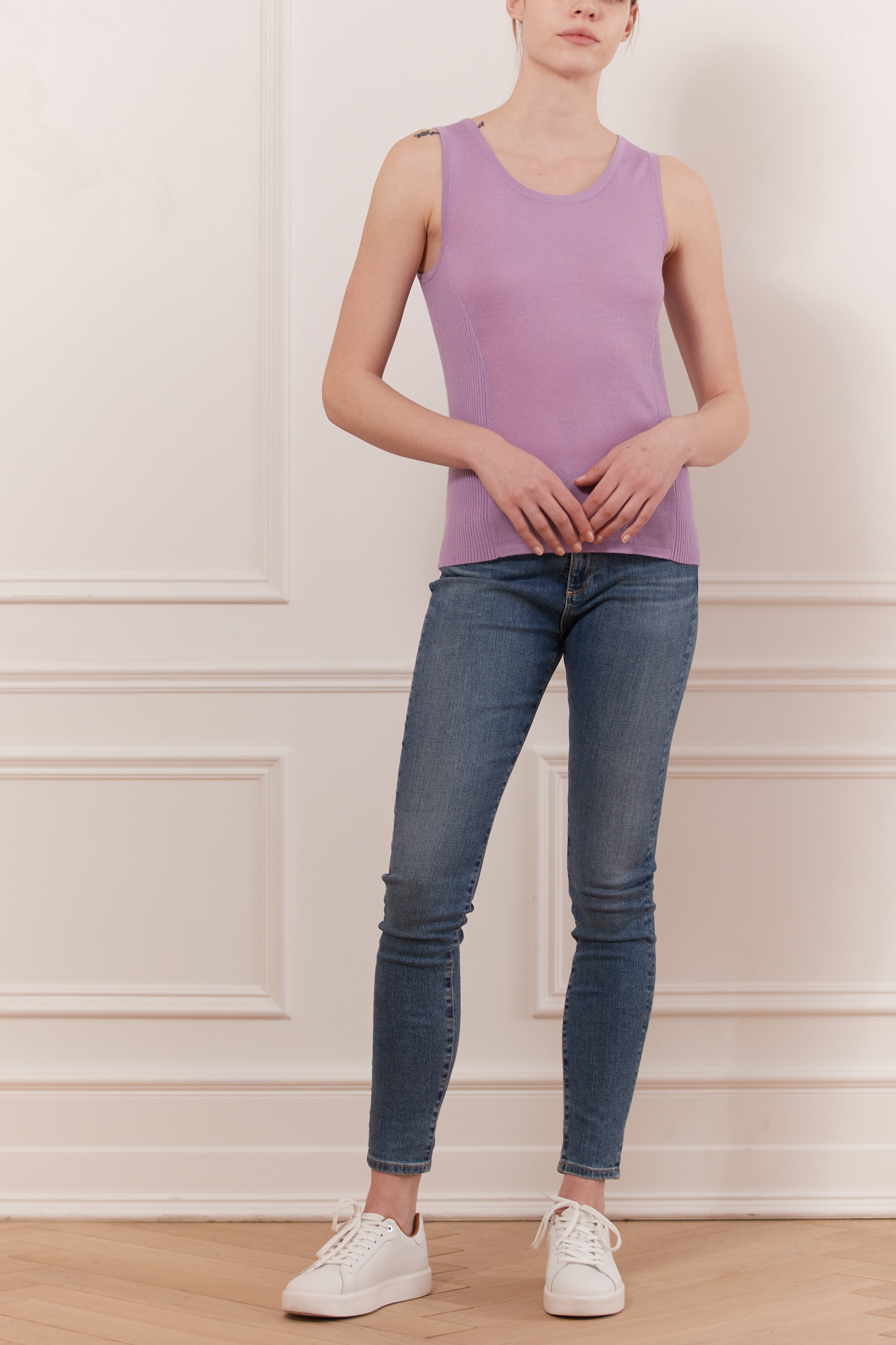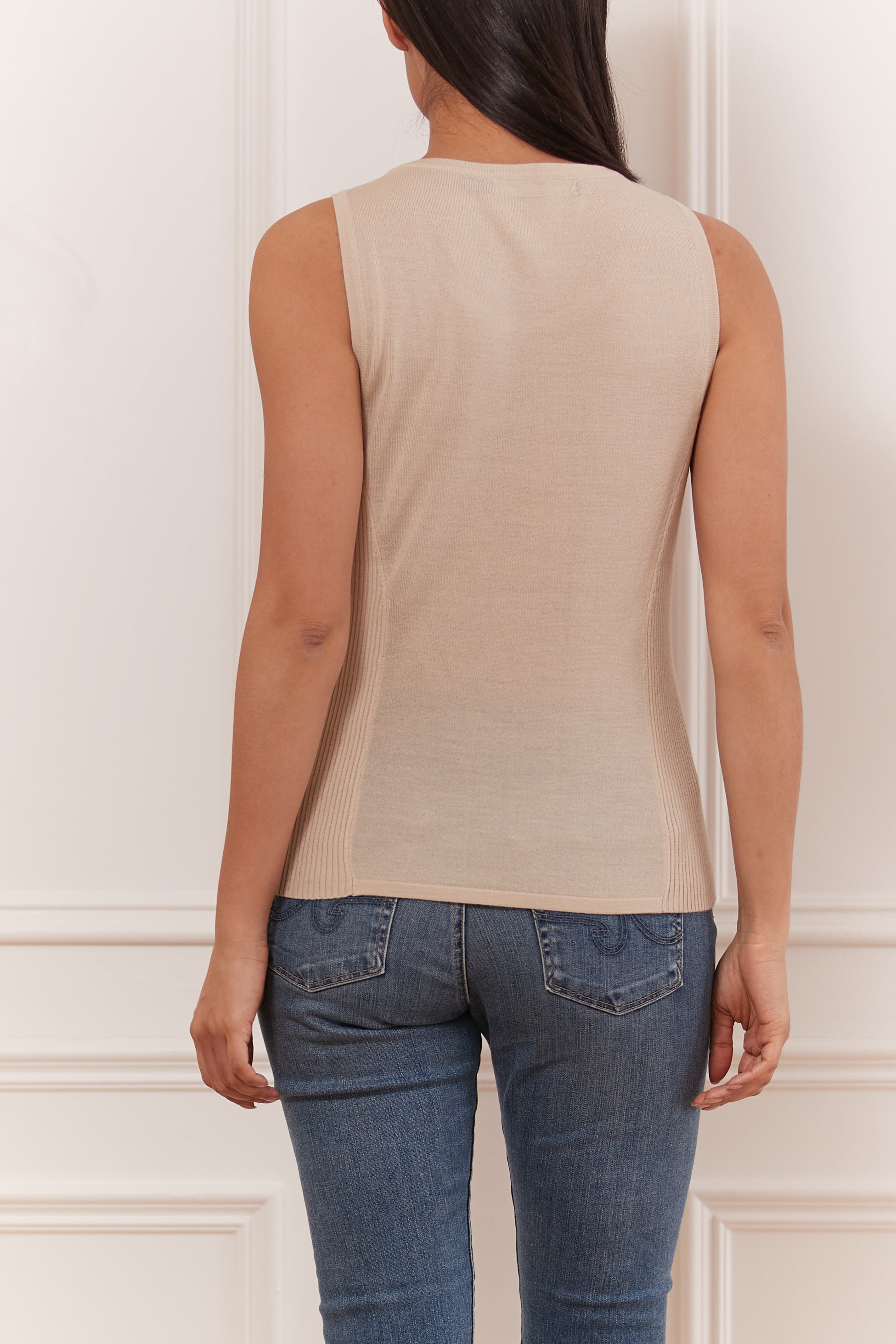 Ce doux tricot en laine mérinos est parfait sous un blazer ou un manteau. léger et confortable. Une très bonne base pour porter sous vos vestons cet hiver. Ce haut sans manches à encolure dégagée, au toucher tricoté, est un basique dont vous avez besoin dans votre garde-robe.