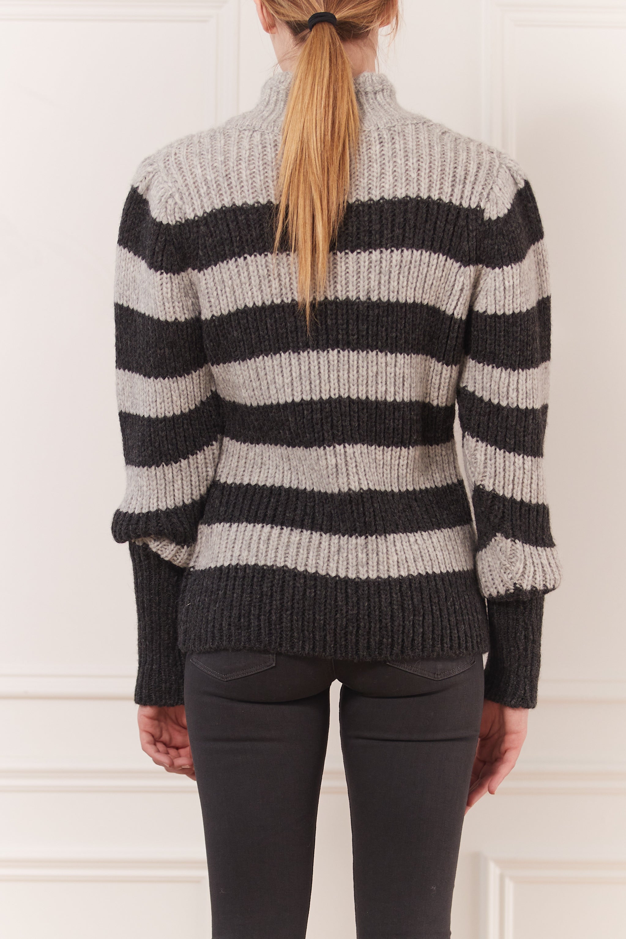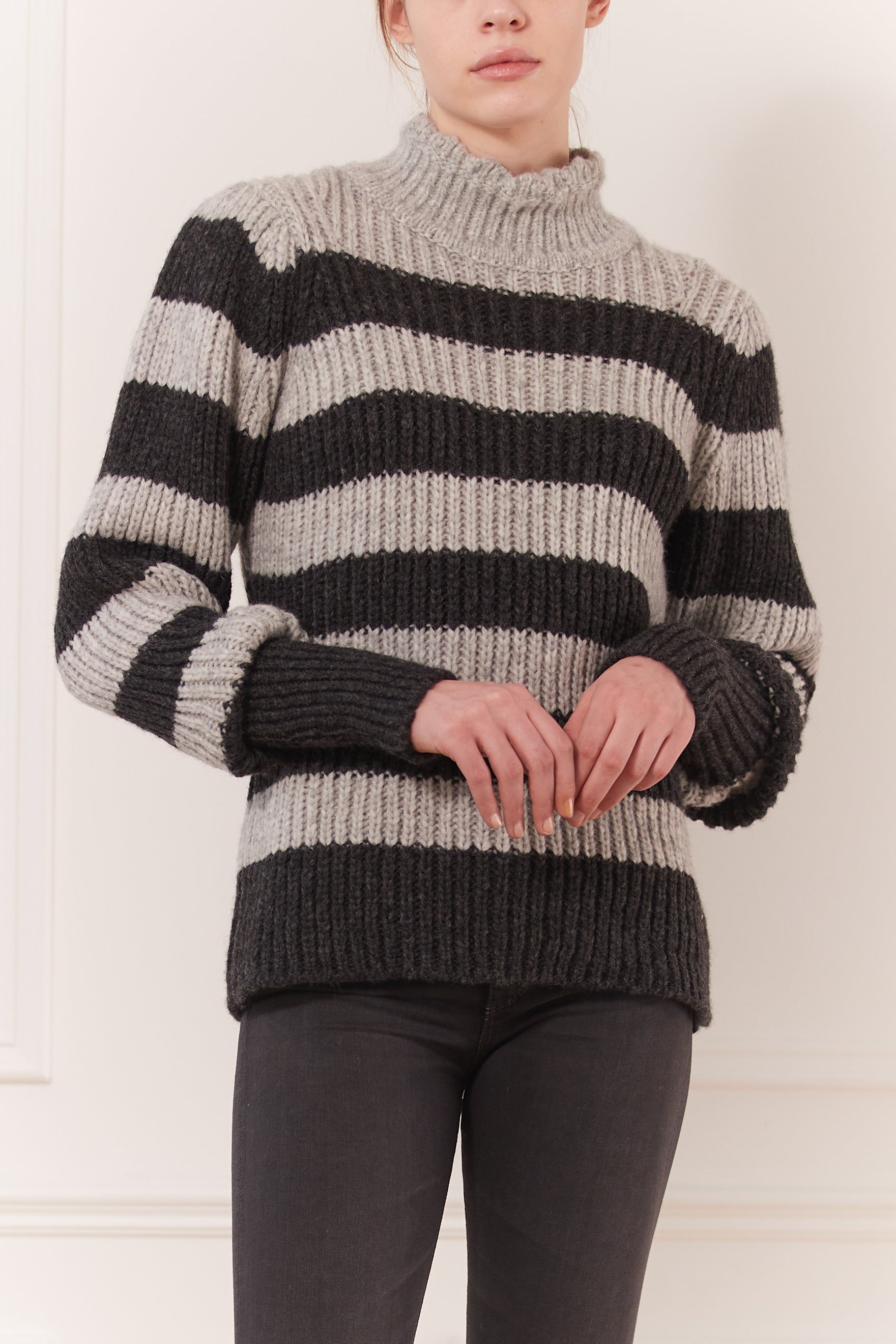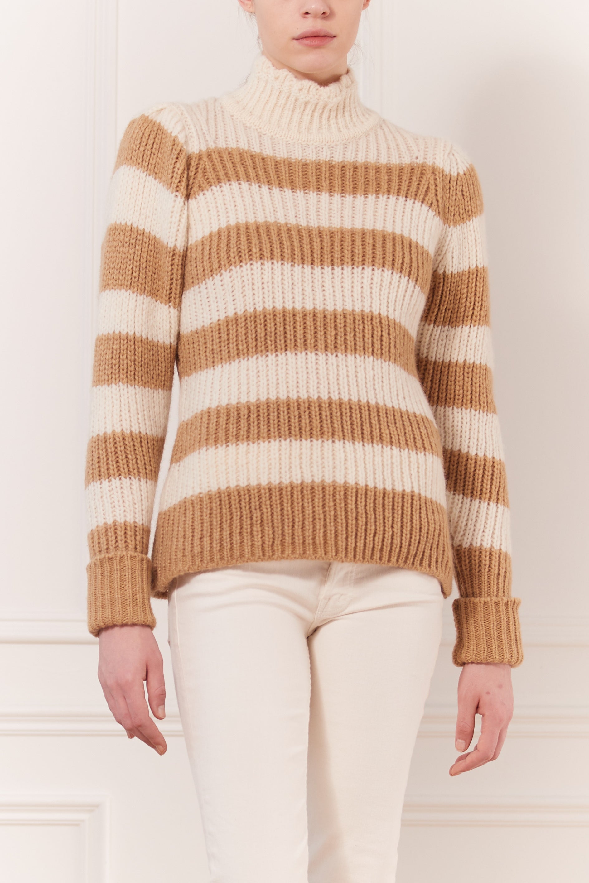 Notre pull en laine mélangée alpaga. Un pull rayé avec un petit détail sur l'épaule qui donne un look plus chic au pull.