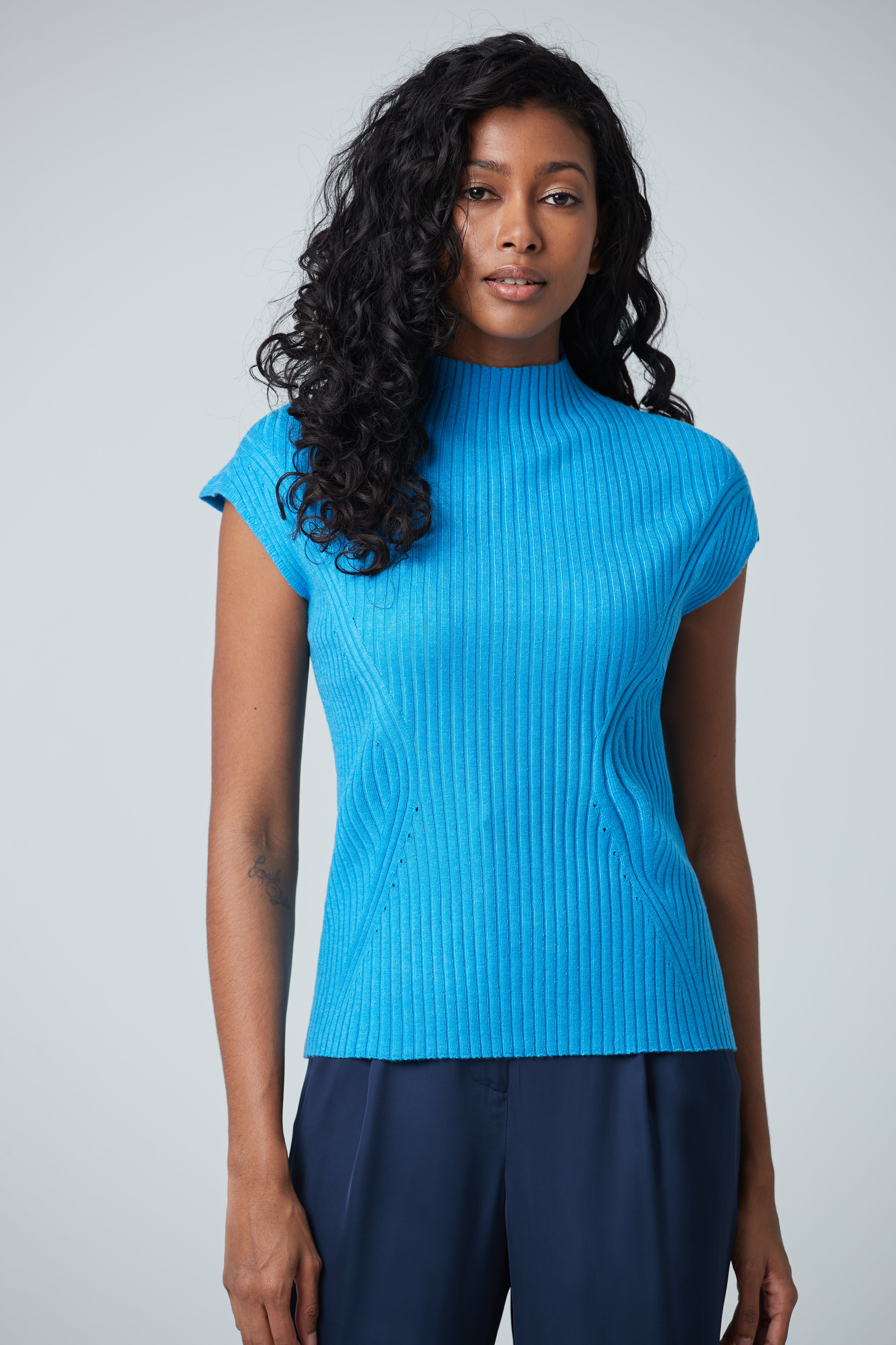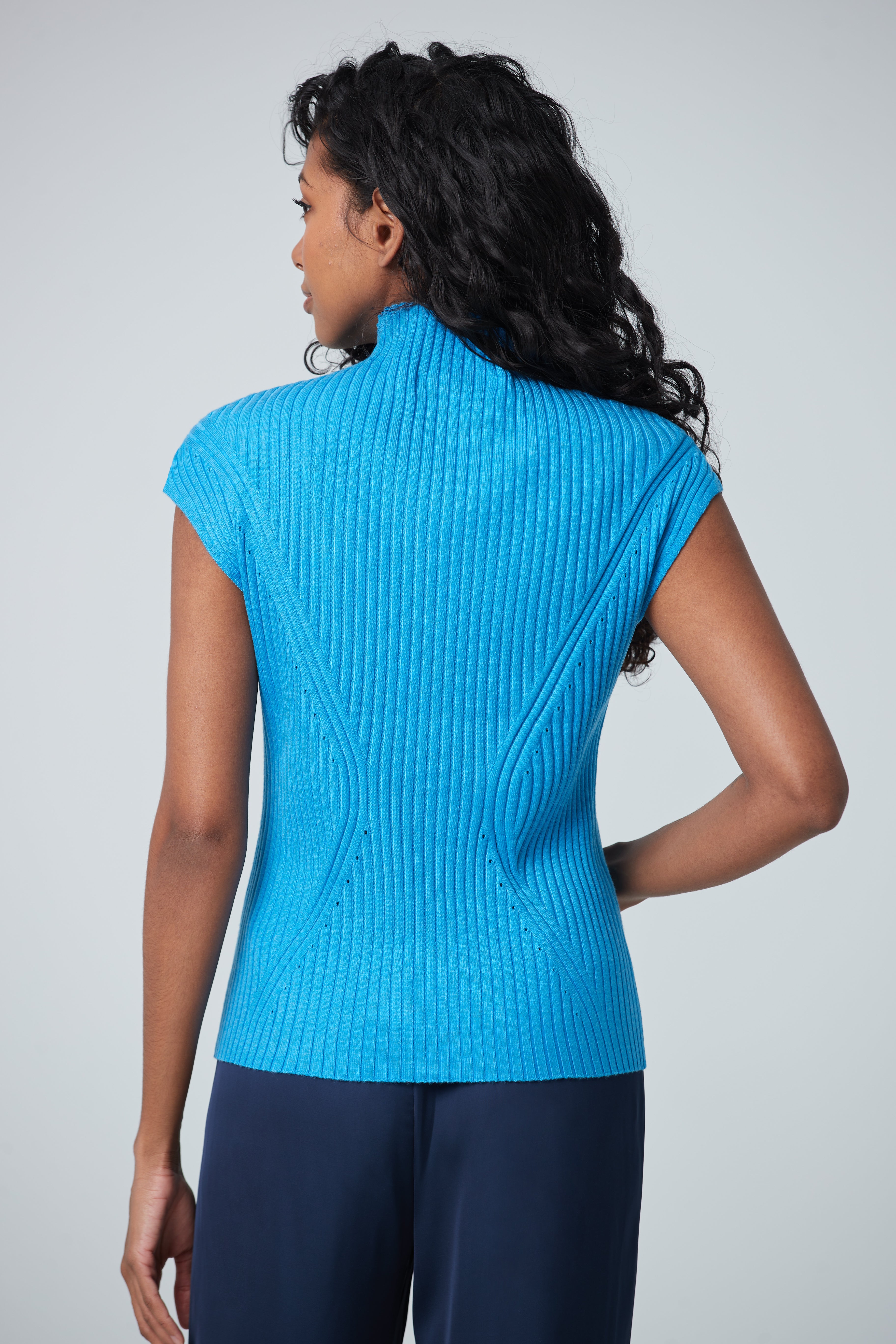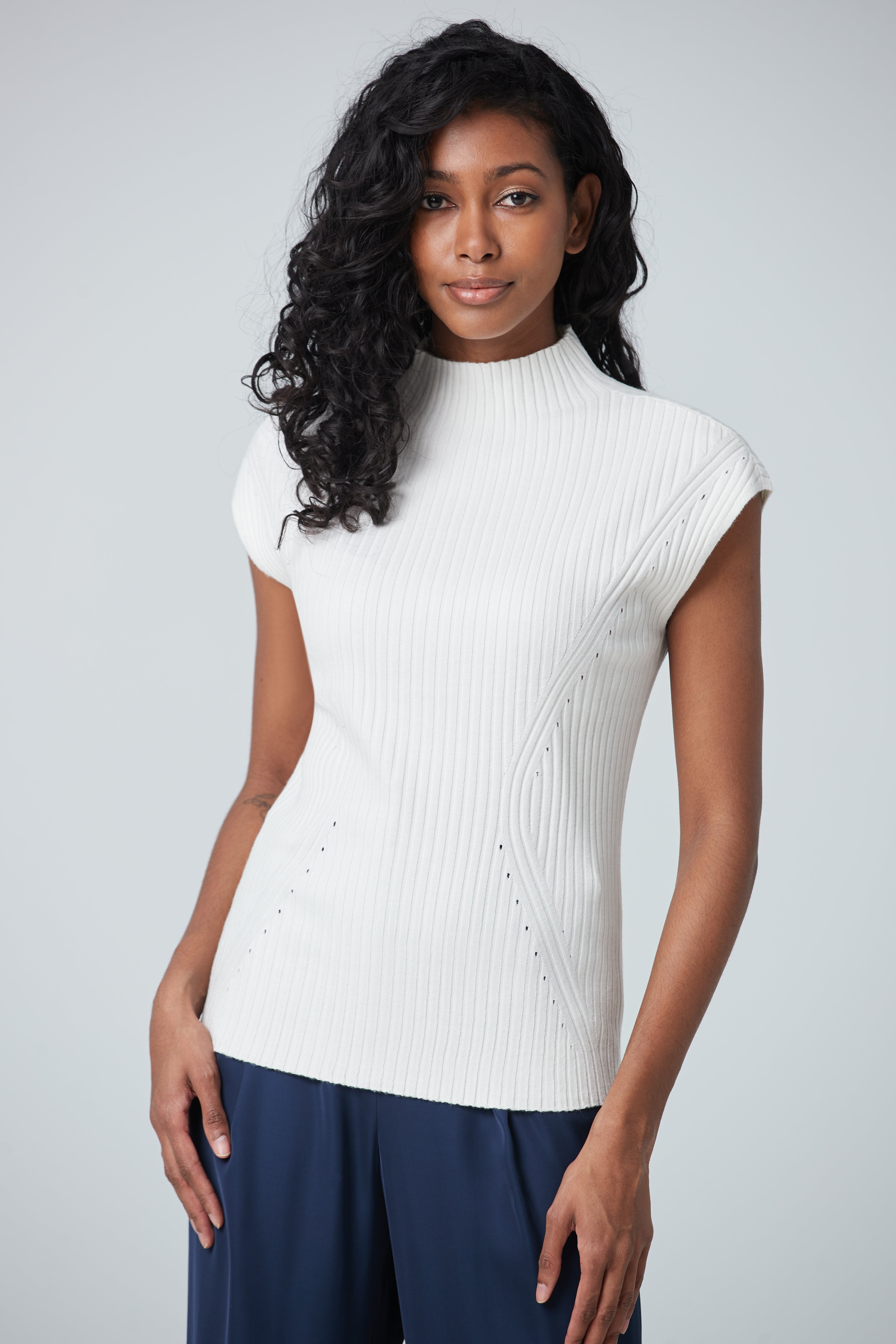 Ce haut côtelé sans manche au col montant est parfait pour l'arrivée des temps plus frais. Sous un veston ou avec une simple paire de jeans, les détails de ce pull compléteront n’importe quel look.