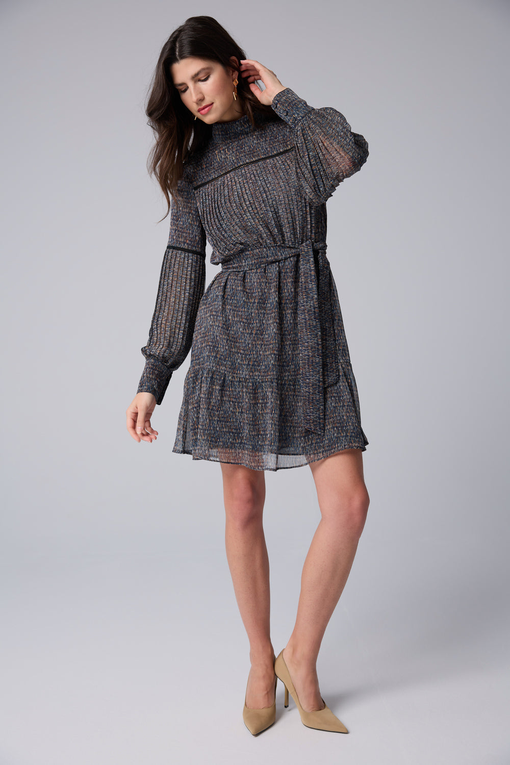 Cette robe plissée en mousseline métallique est un incontournable. Pour le bureau ou vos sorties, elle apportera de la couleur à votre garde-robe cet automne.