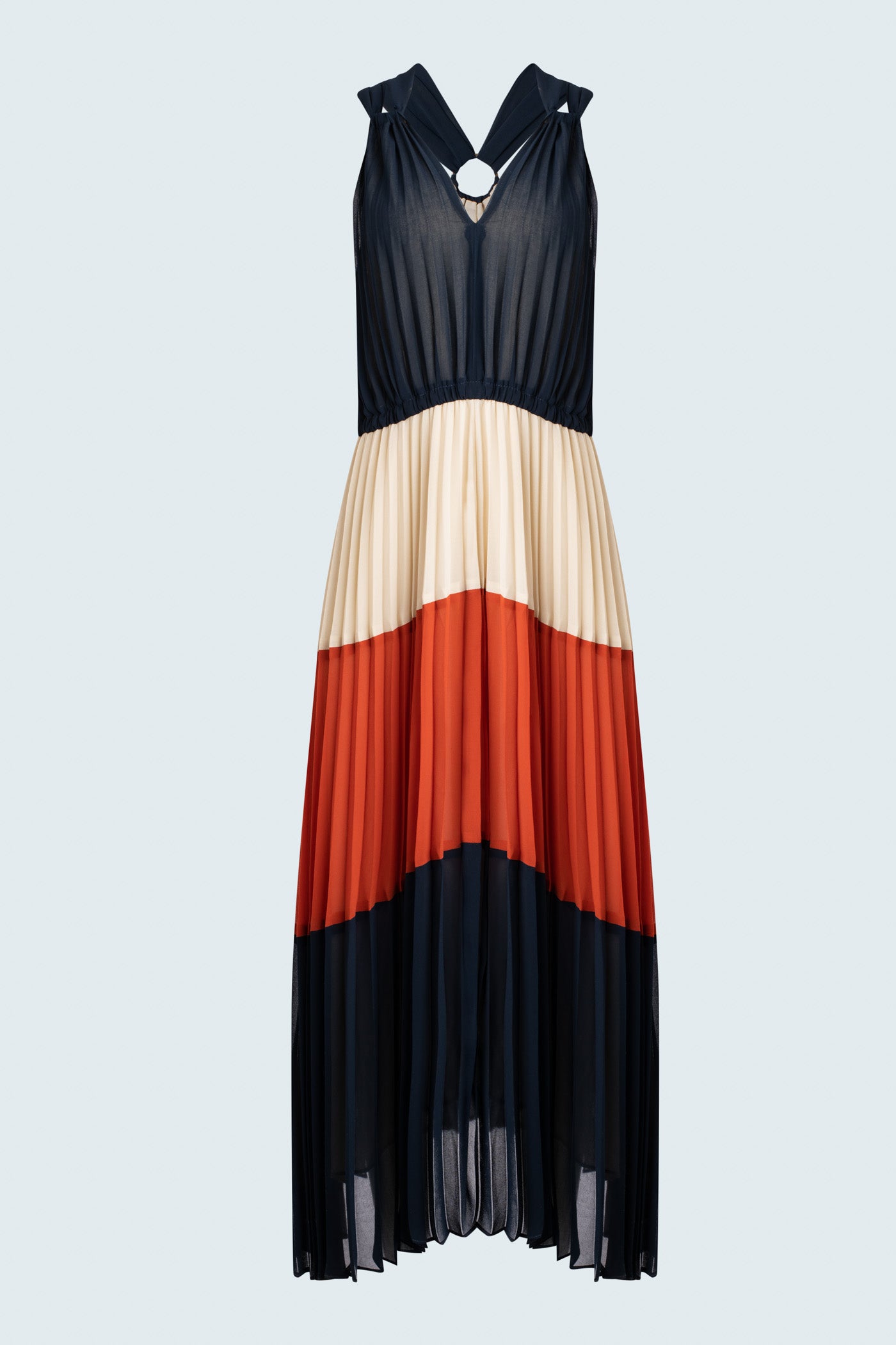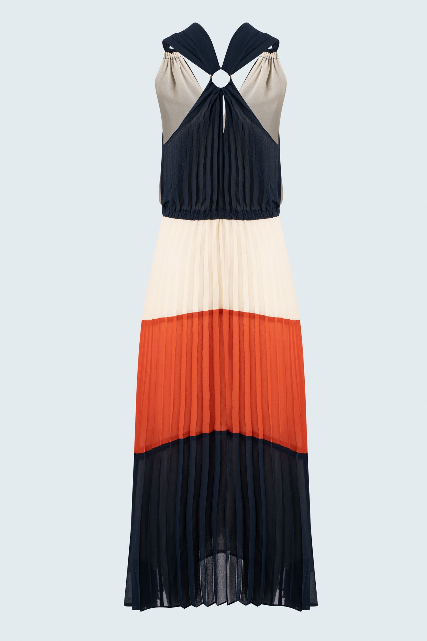 Adoptez un look somptueux avec cette robe plissée en trois couleurs. Cette robe à coupe en biais ajoutera de l'élégance à votre garde-robe. Vous tomberez amoureuse des détails de l'encolure.