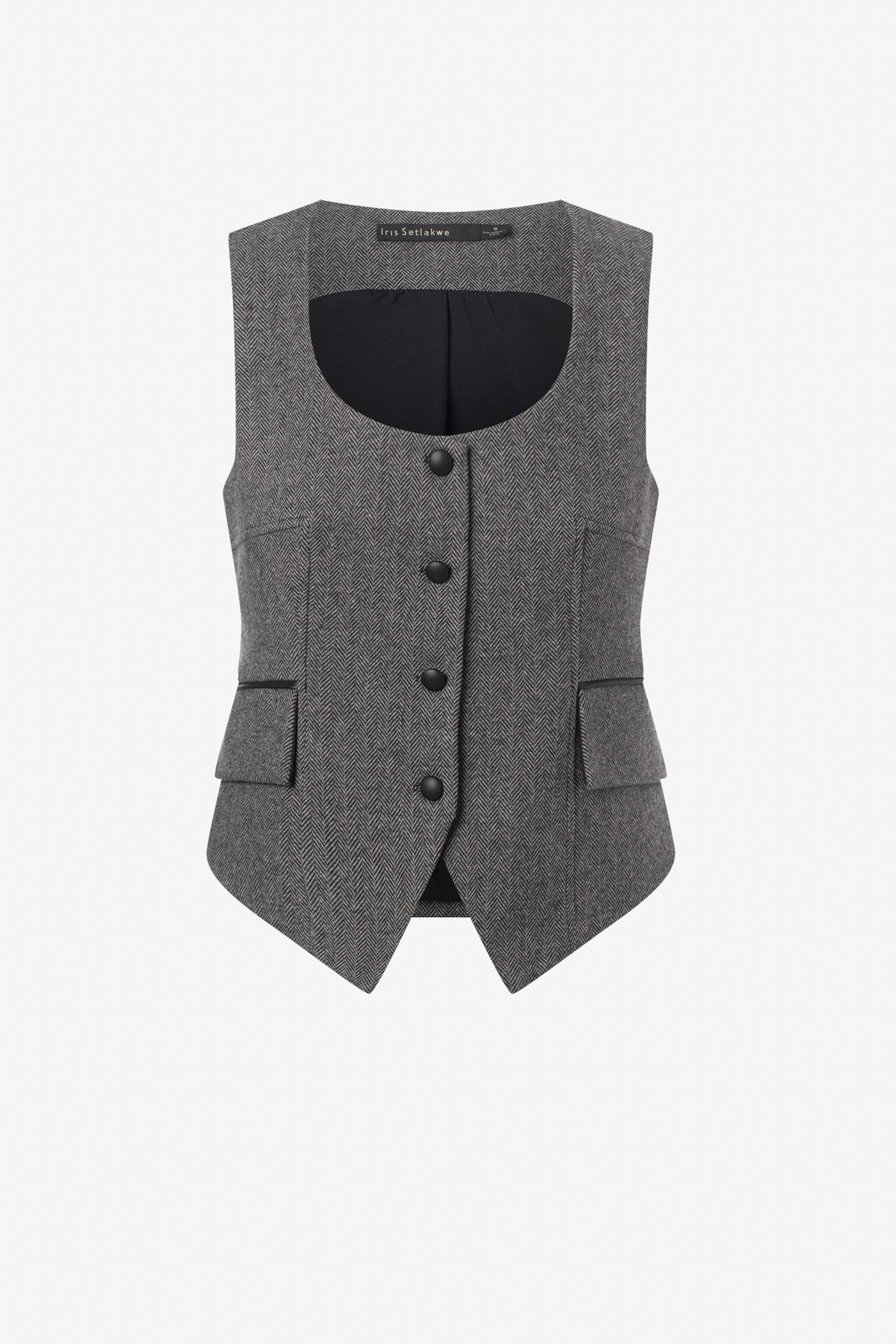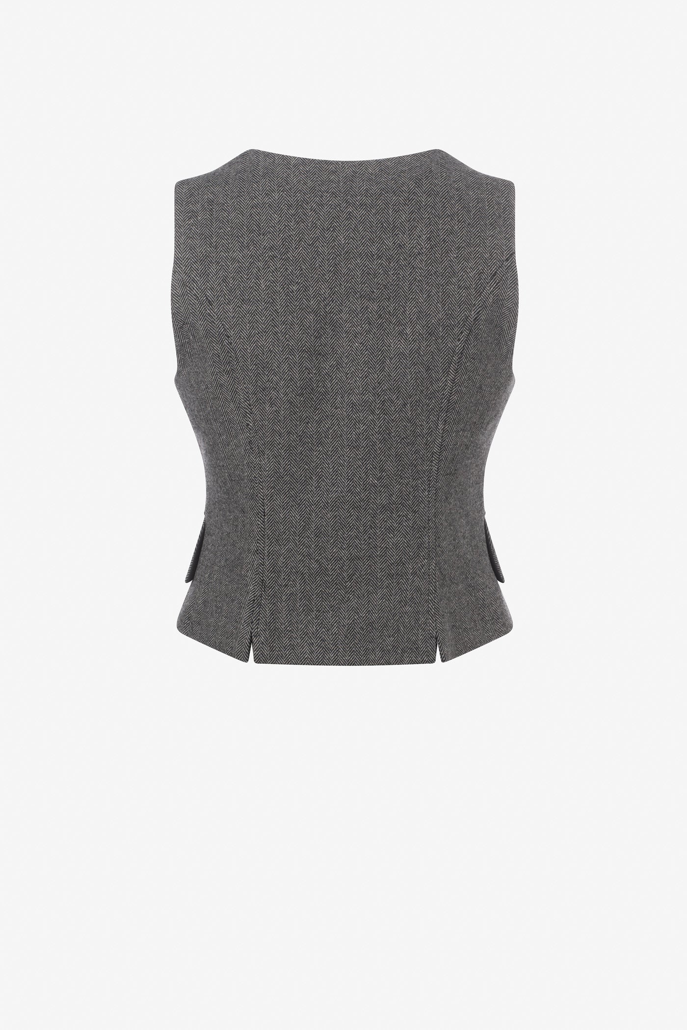 Veste à chevron sans manches cintrée au col rond, rehaussée de boutons en cuir. Une pièce structurée au charme raffiné, parfaite pour superposer avec style.
