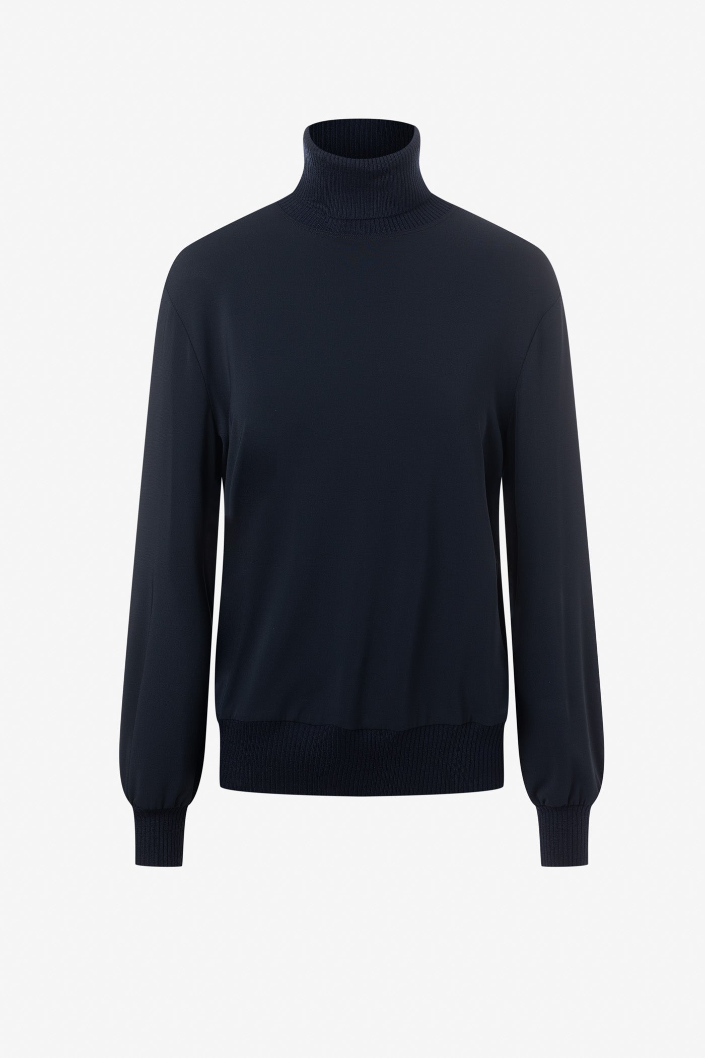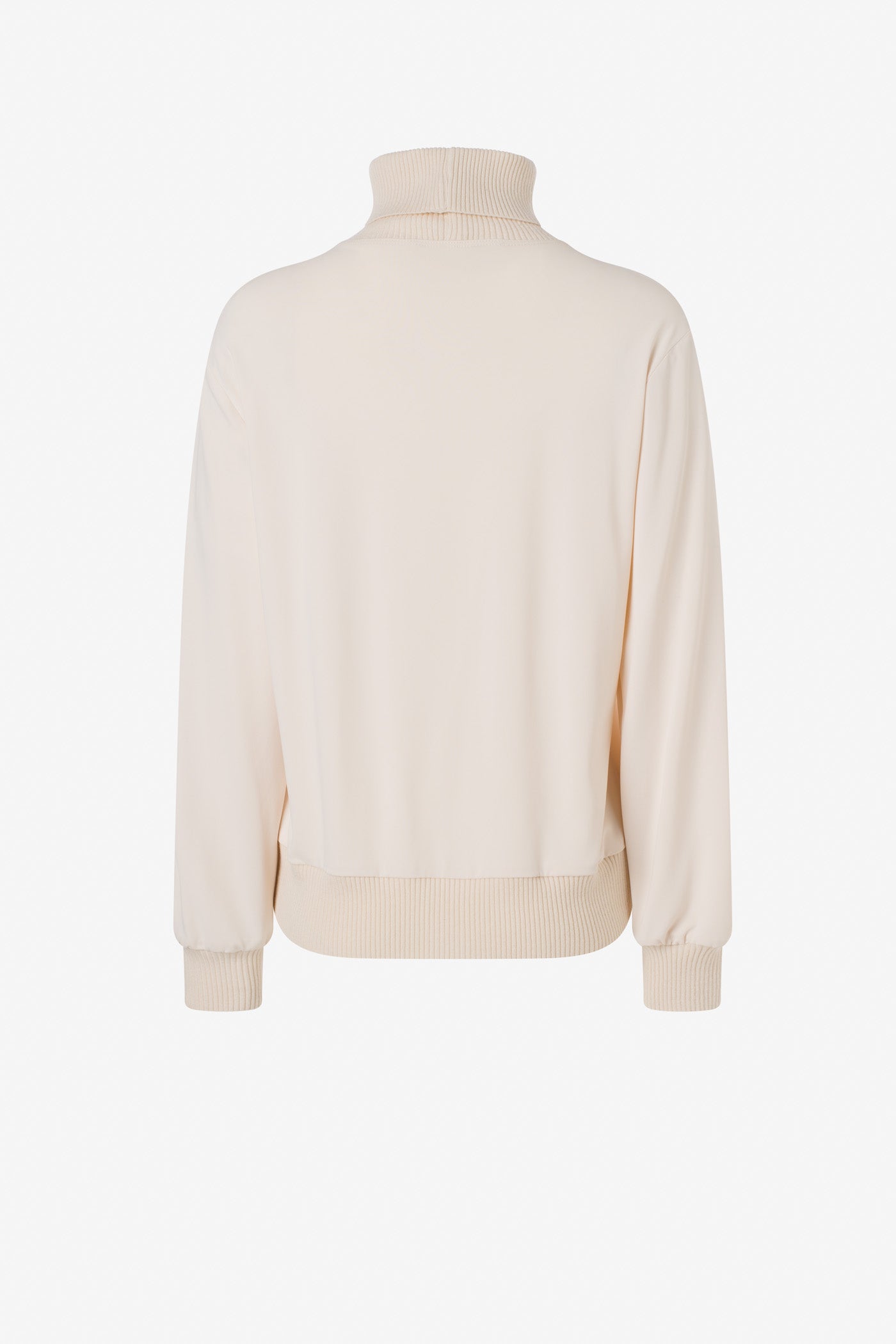Col roulé en jersey mat, agrémenté de finitions en tricot au col, aux poignets et à la taille. Une pièce douce et structurée, parfaite pour un look chic et confortable.