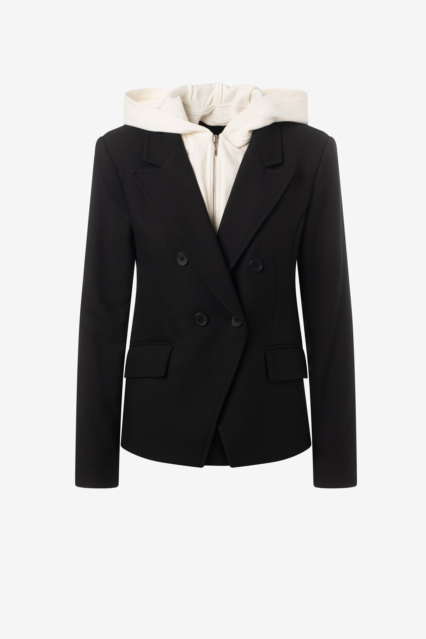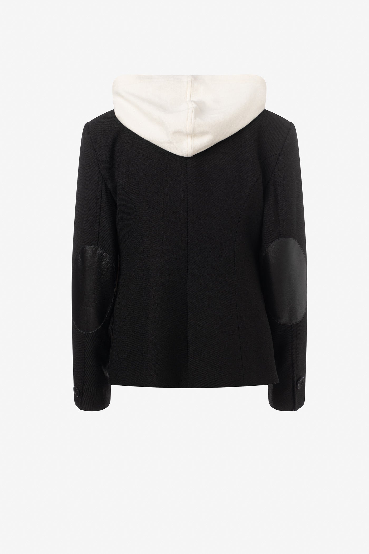 Veston cintré à double boutonnage, rehaussé de patches en cuir sur les coudes pour une touche utilitaire chic. Doté d’un capuchon amovible à l’aide d’un zipper dissimulé à l’intérieur, il allie élégance structurée et fonctionnalité moderne.
