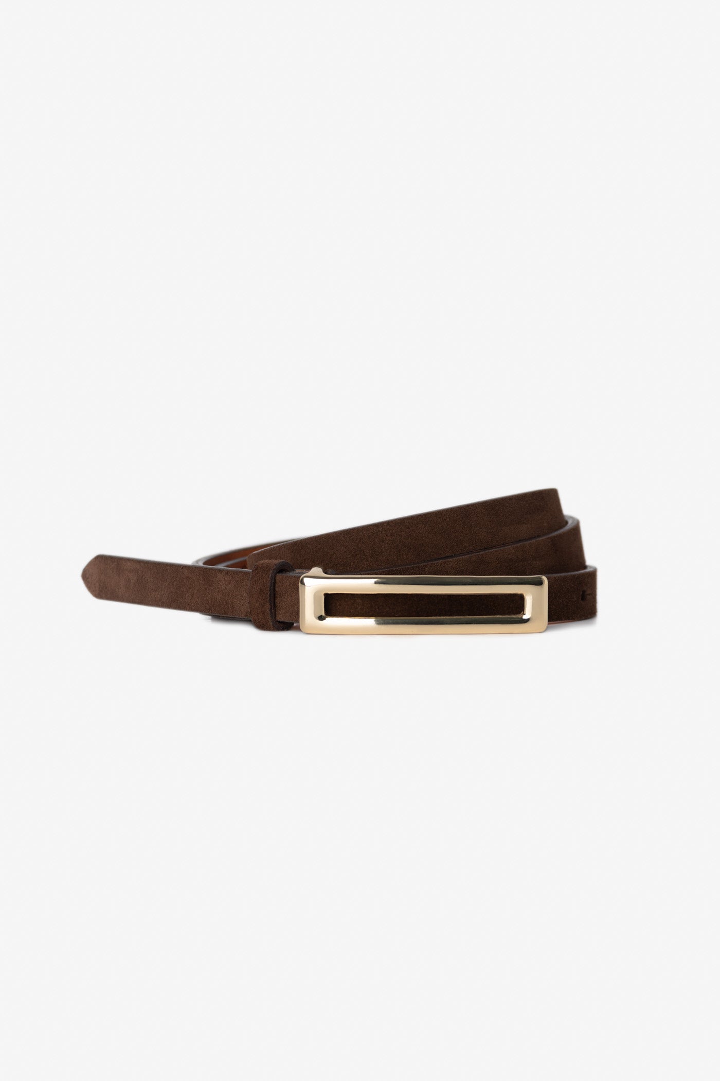 Cette ceinture mince en suède se distingue par sa texture douce et sa boucle rectangulaire épurée. Un accessoire chic et discret, parfait pour rehausser vos looks avec finesse.