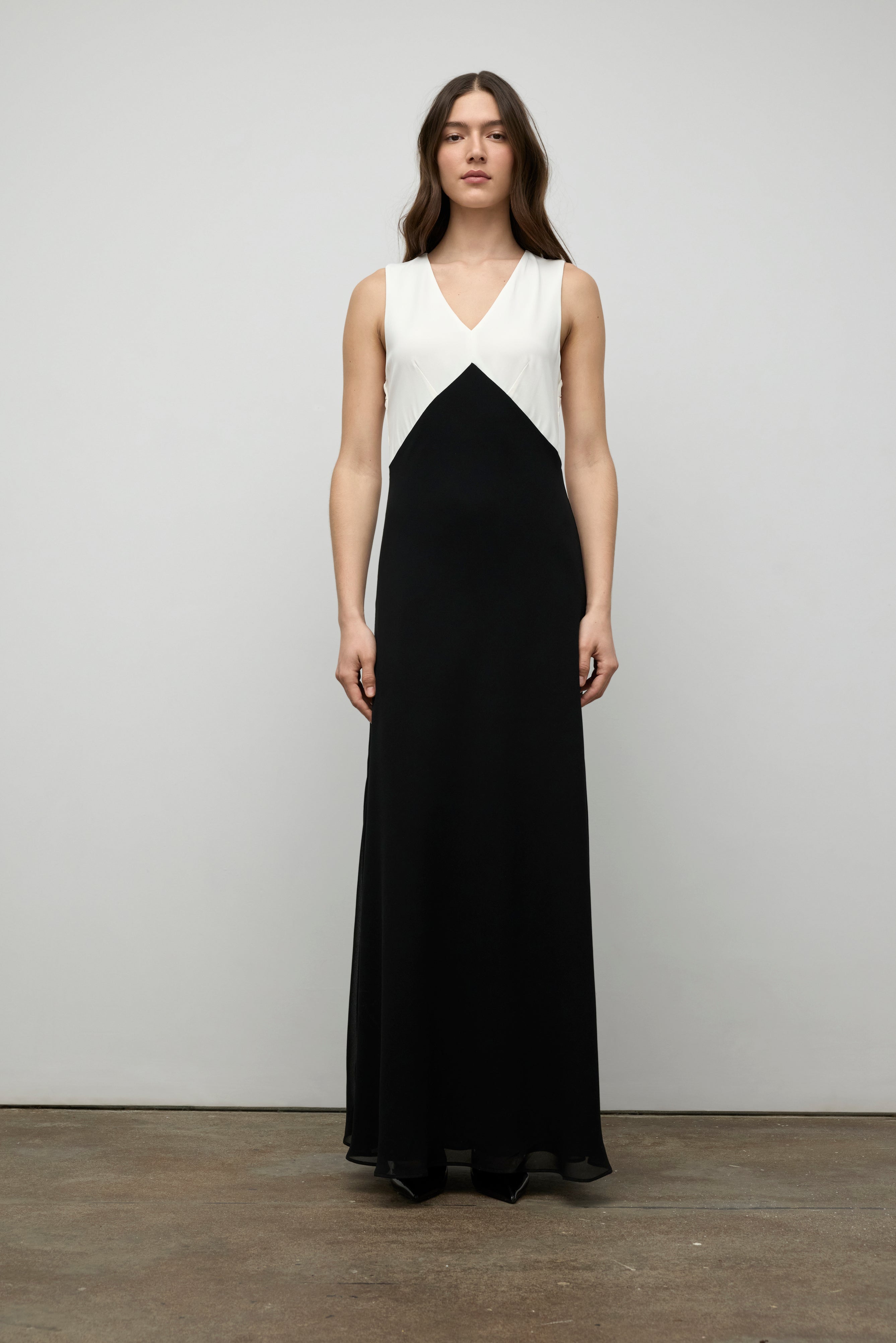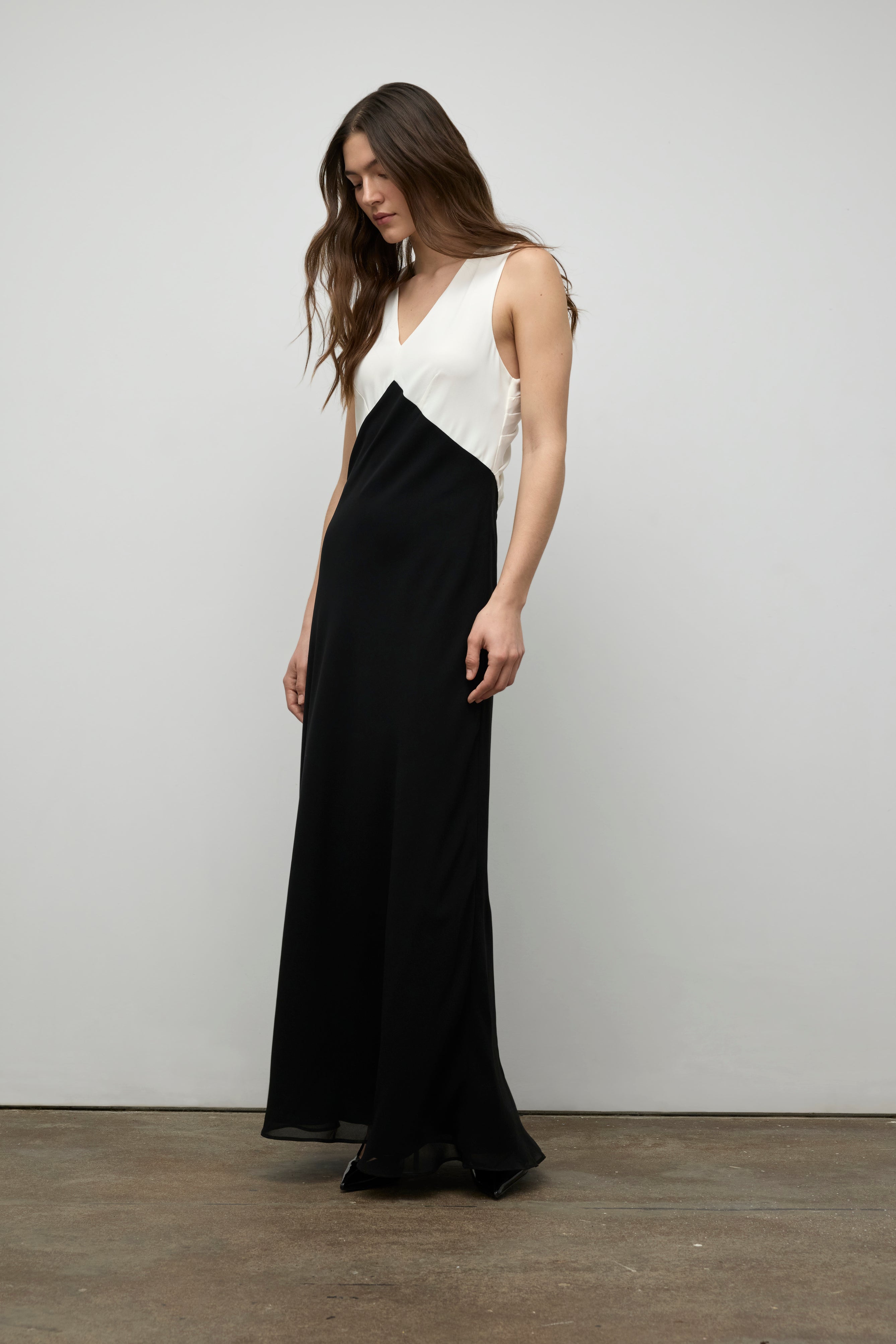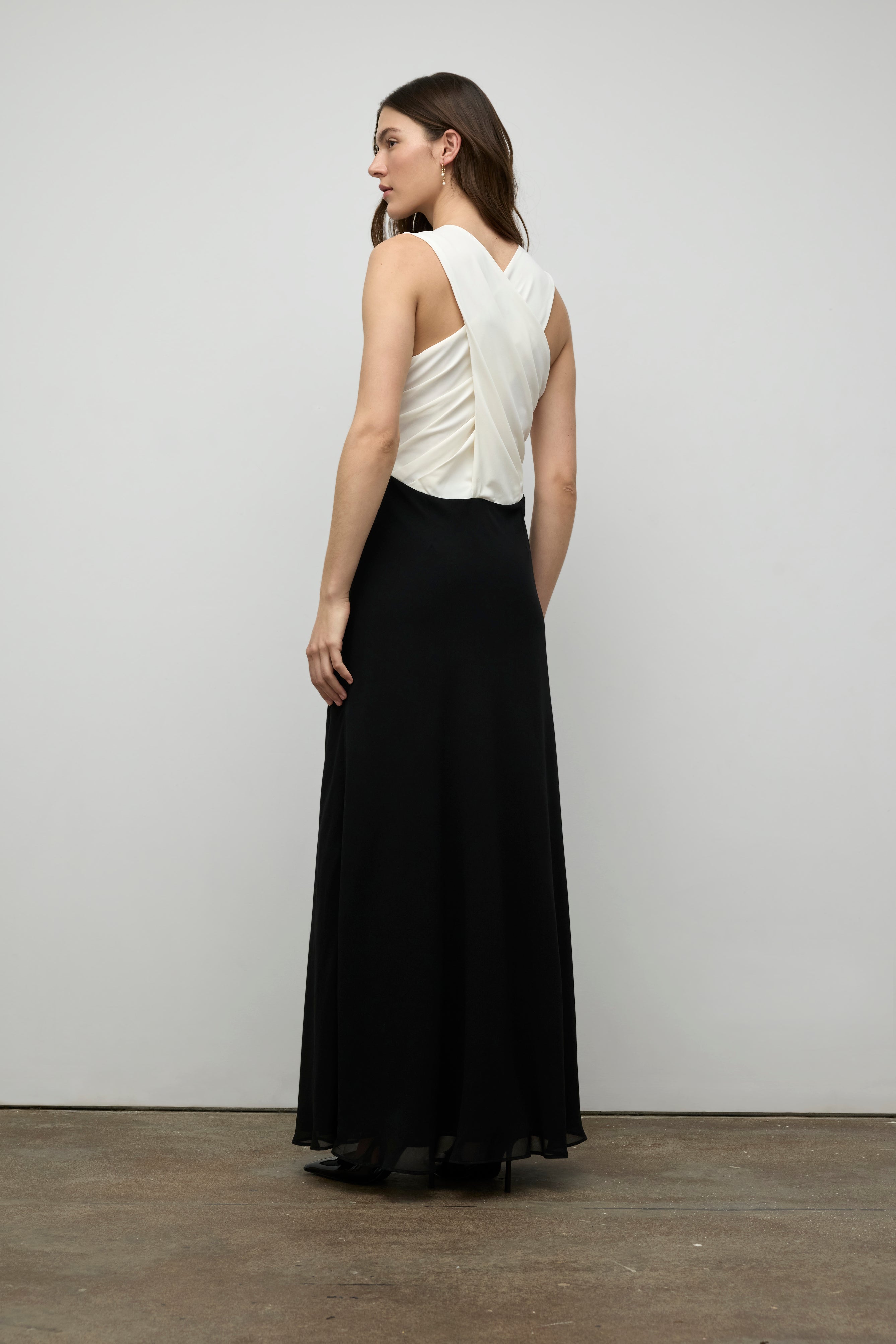 Cette robe longue de soirée marie avec finesse le confort du jersey et la légèreté du chiffon pour un effet à la fois fluide et structuré. Le drapé croisé dans le dos crée un jeu de lignes séduisant et raffiné, dévoilant subtilement la peau tout en assurant un maintien élégant. La silhouette s’allonge naturellement grâce à la coupe épurée, tandis que le mélange des matières offre un contraste délicat.
