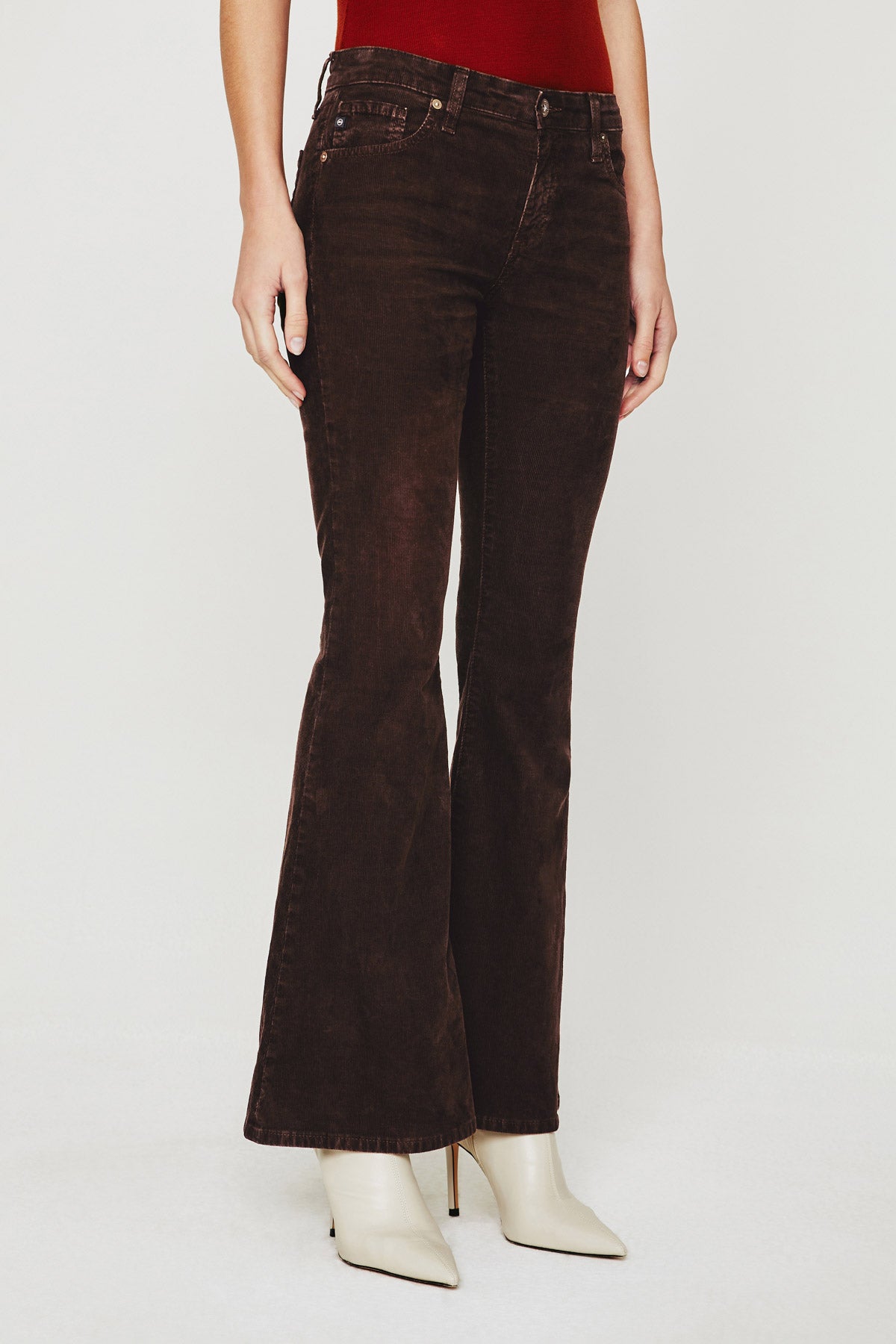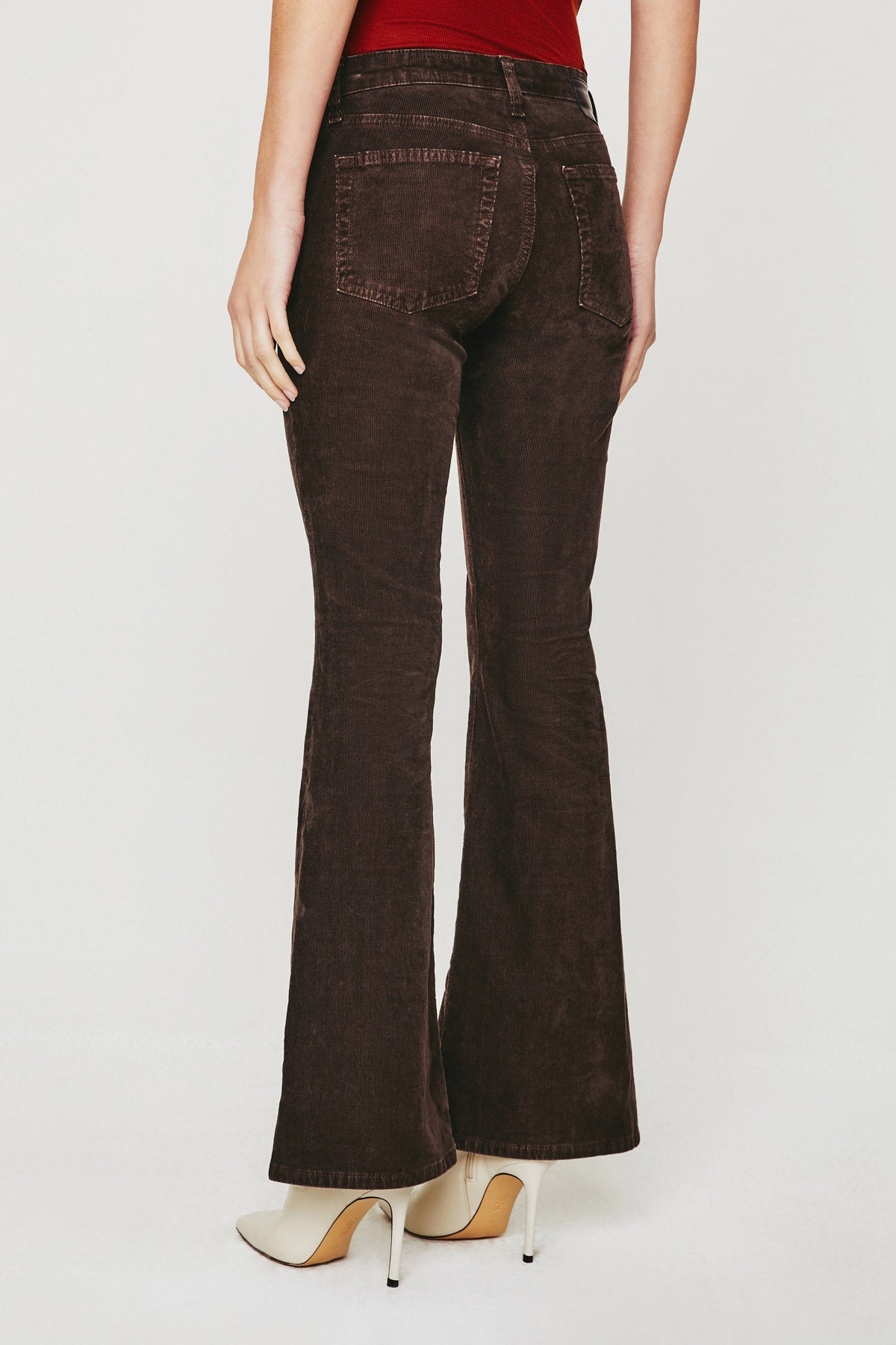 Angeline is a mid-rise corduroy jean in a dramatic flared silhouette. Sulfur-dyed to a rich brown shade, the style is made from 8.6 oz. Duty Stretch Cord fabric with a gently broken-in appearance and comfortable feel.