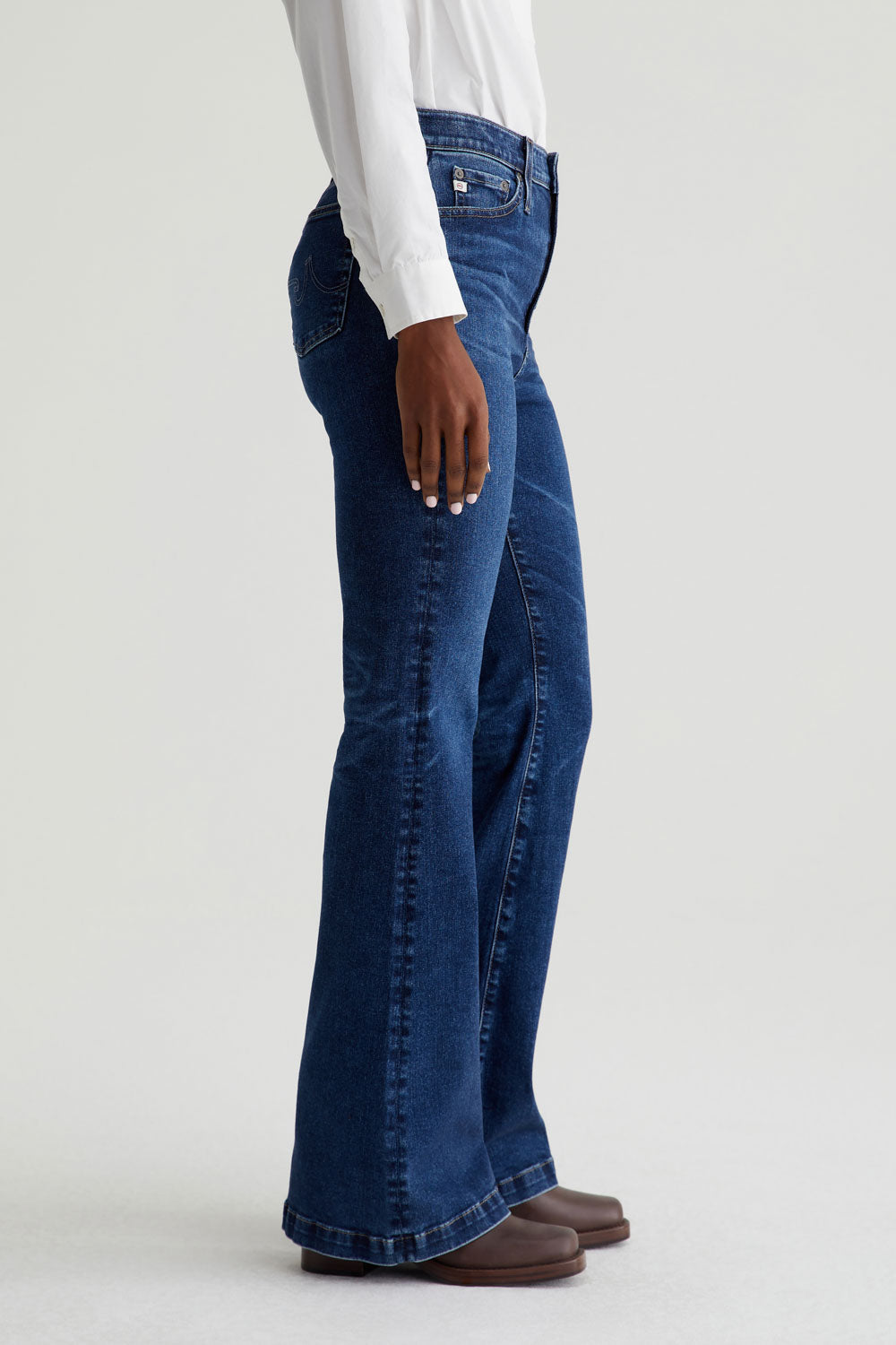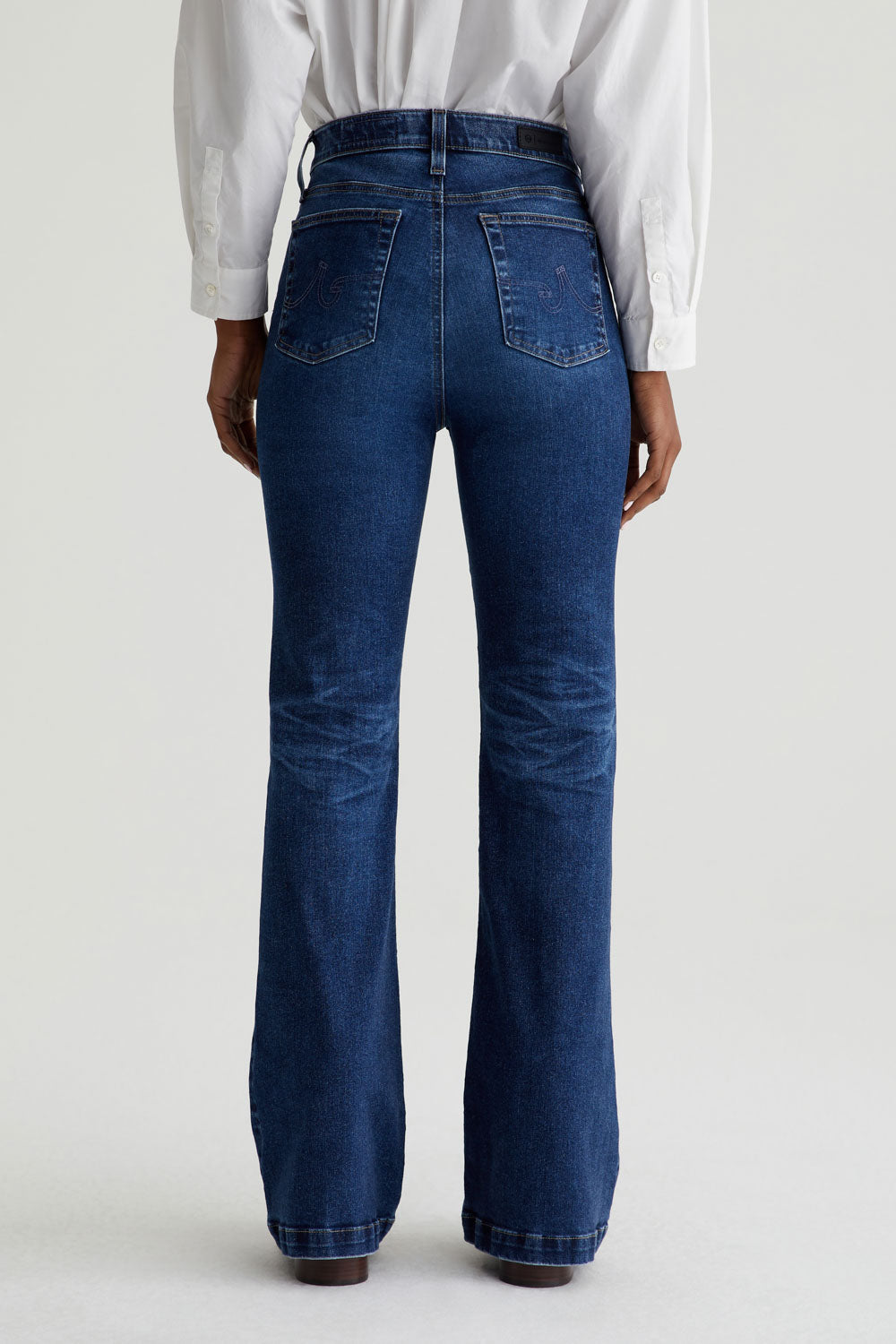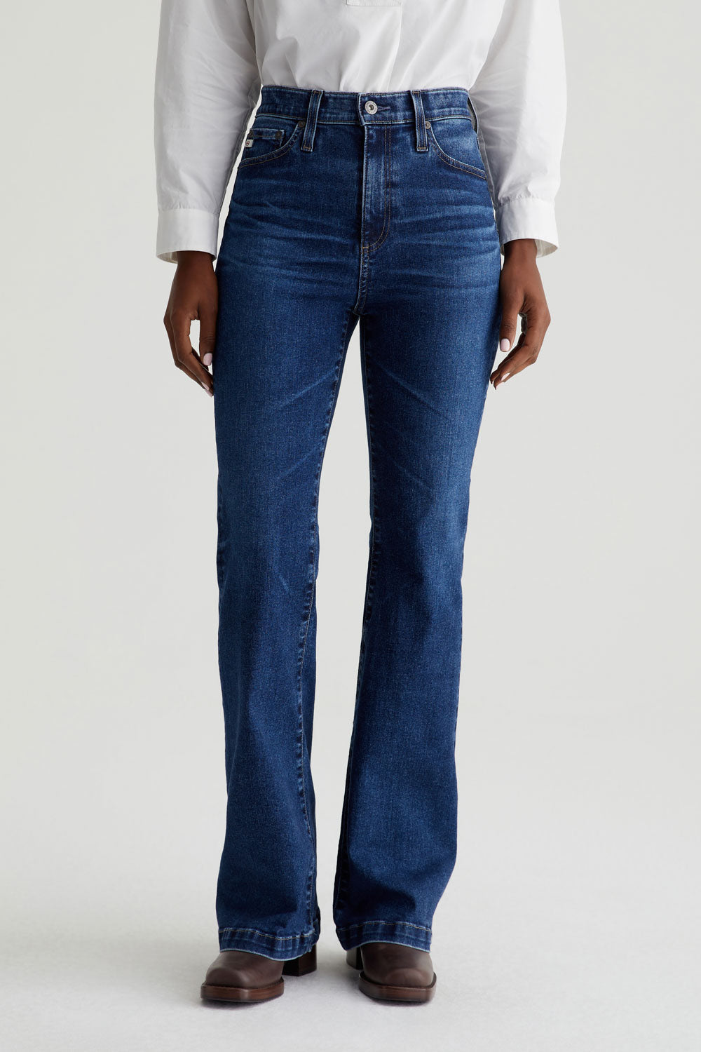 The Madi Vapor Wash jeans feature our high-rise flare in a 10-year AG-ed™ dark-blue wash that's been achieved using our eco-friendly AG Vapor Wash™ technology. This '70s-inspired silhouette is designed to hug the hips and elongate the legs in a curve-tracing hourglass silhouette with kicked-out hems. Crafted from 10 oz. superstretch Empower Denim from Japan, the pair offers premium comfort and advanced recovery. Our AG Vapor Wash™ process significantly reduces the use of water, chemicals, and energy to lessen environmental impact. Finished with a vegan and 100% biodegradable cellulose patch at the back waistband.
