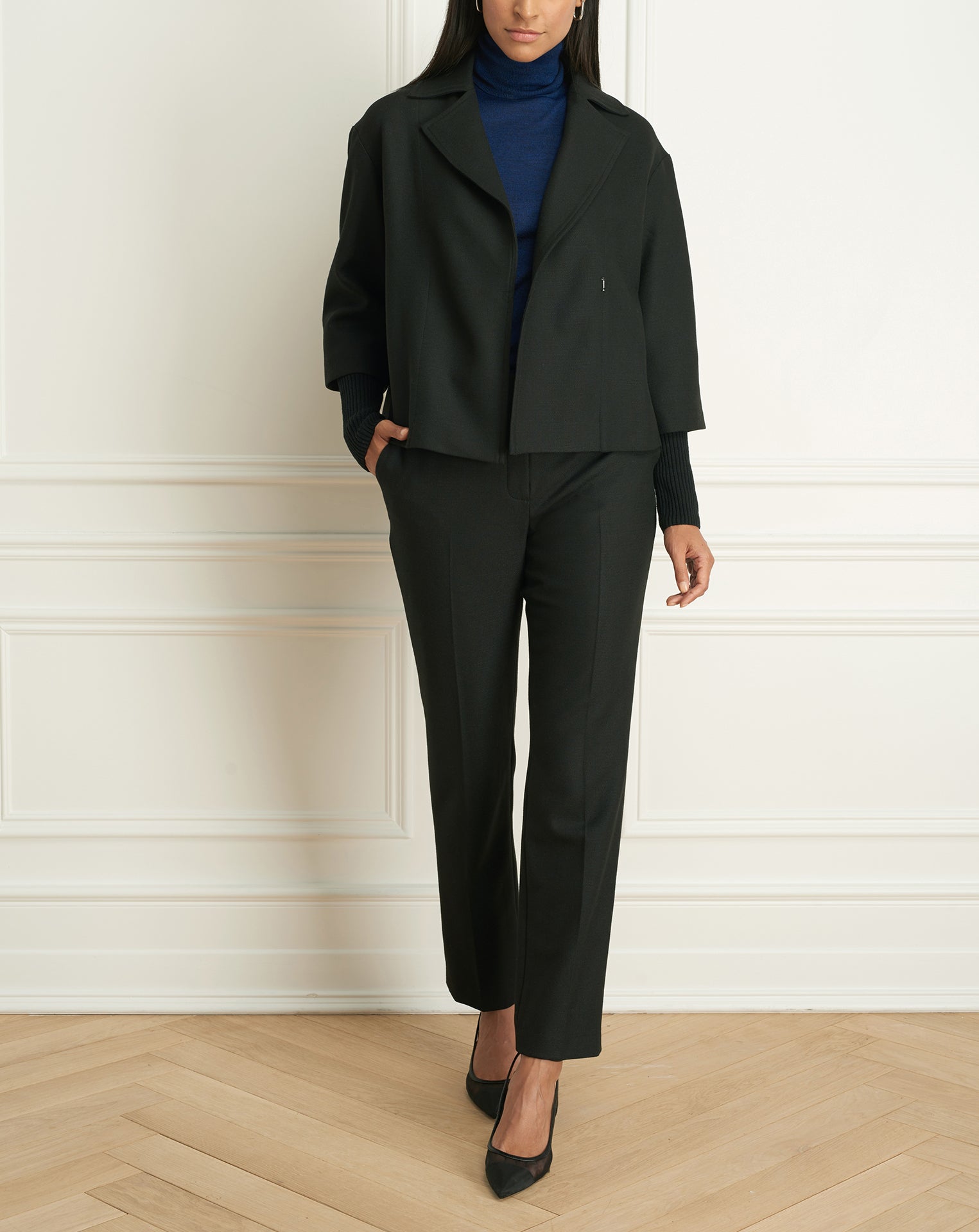 This fabric was imported from Italy. Mid-raise cigarette leg pant that goes with everything. If your are looking for a textured black cigarette leg pant this is the perfect fit and the perfect fabric for fall.