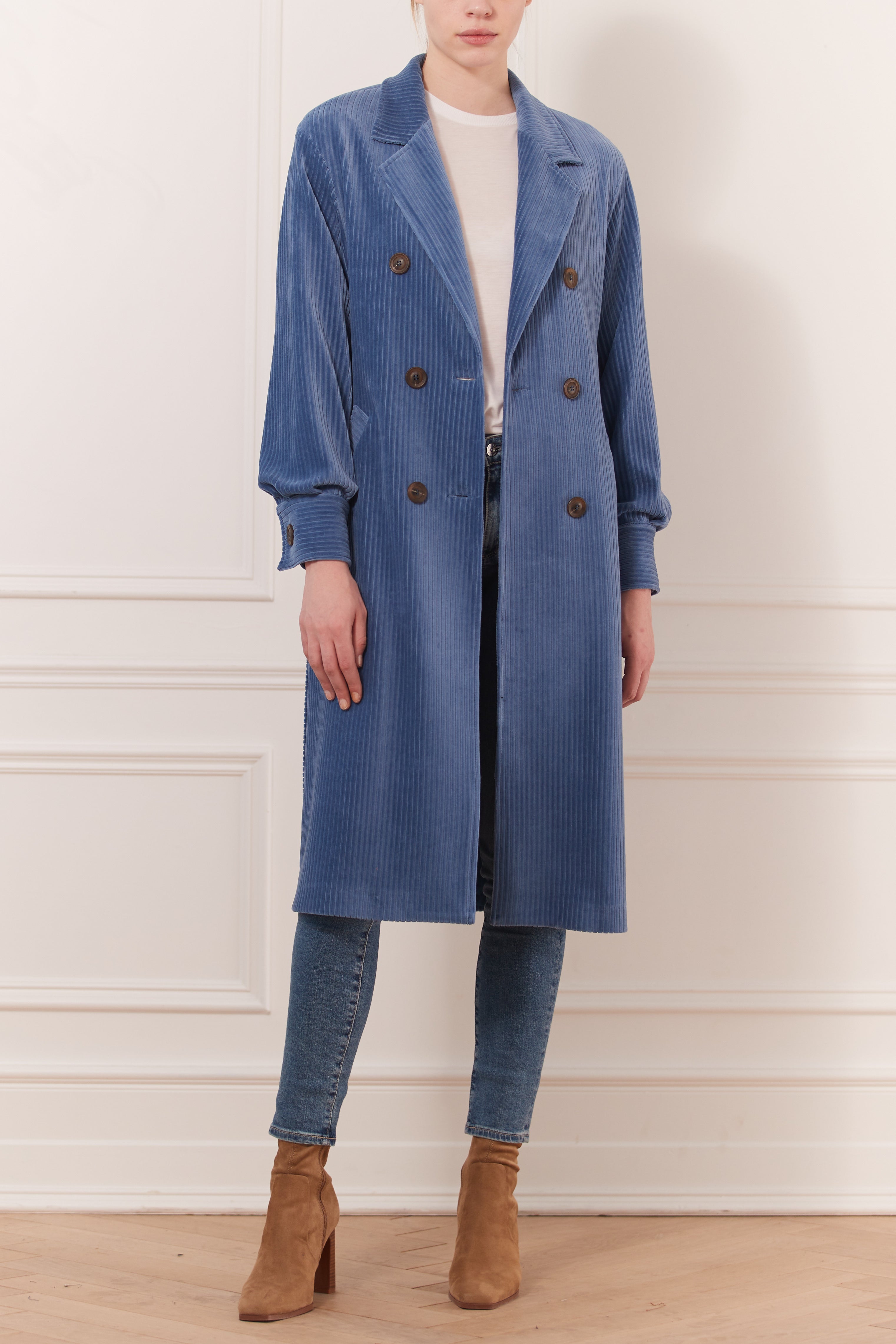 Long corduroy coat with puffed sleeves and belt at the waist. This unique piece is a classic for the beginning of the fall season. An elegant sophisticated and trendy mid-season coat. A favorite piece of the collection this season.