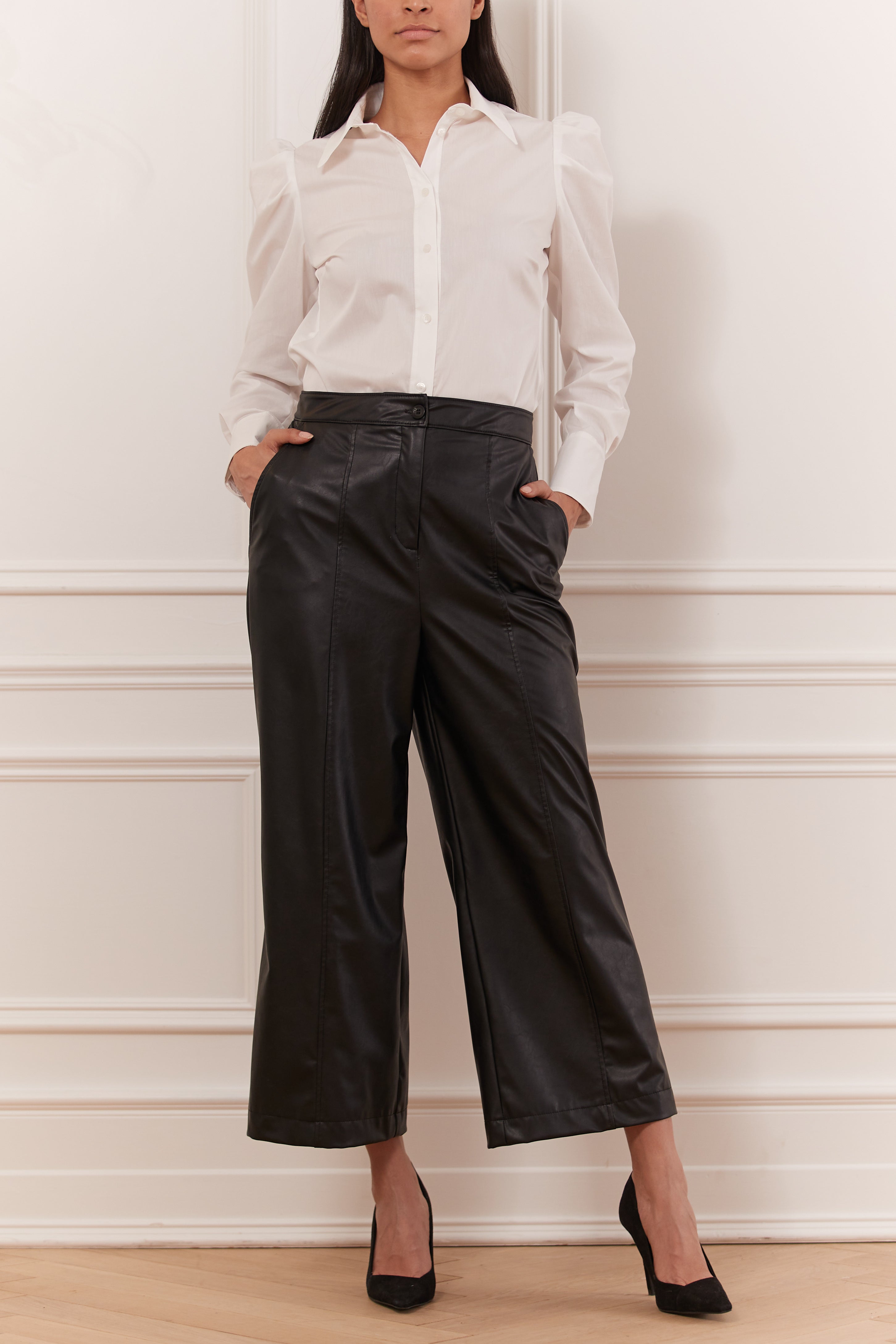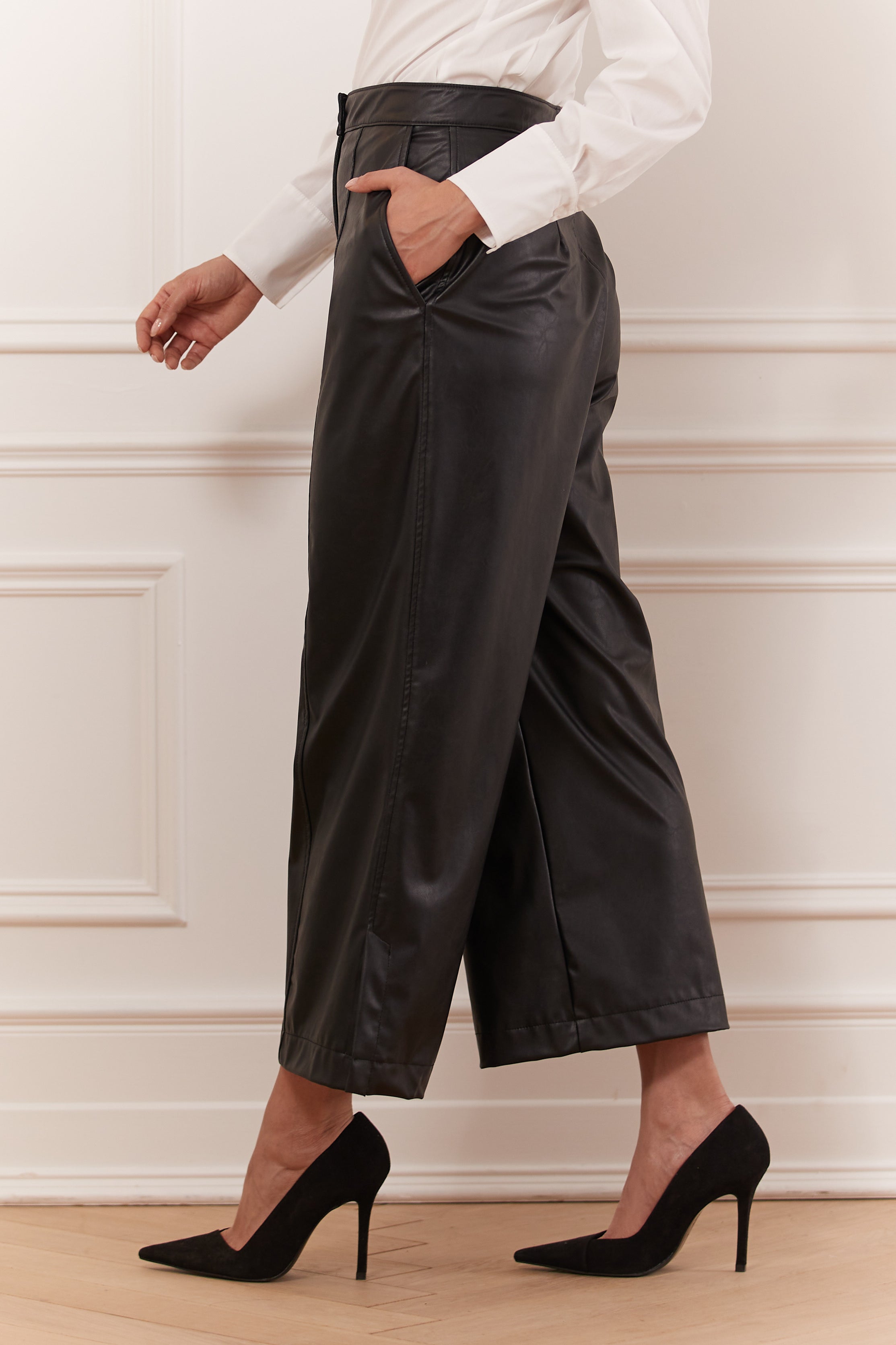 Faux leather culotte pant in black. High-rise. Cropped leg. This pants made in our new soft and stretchy faux leather fabric will be your favorite item this winter.