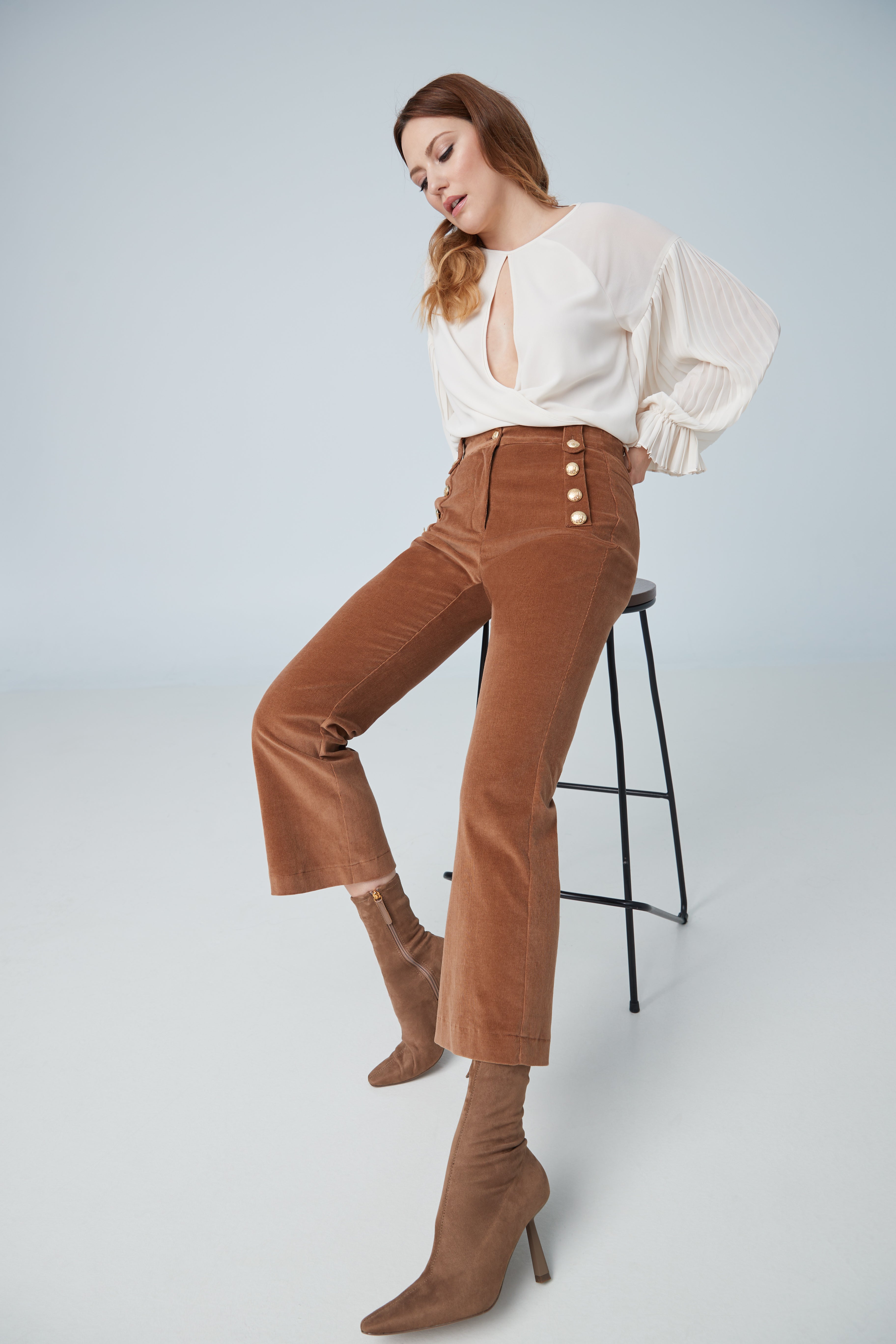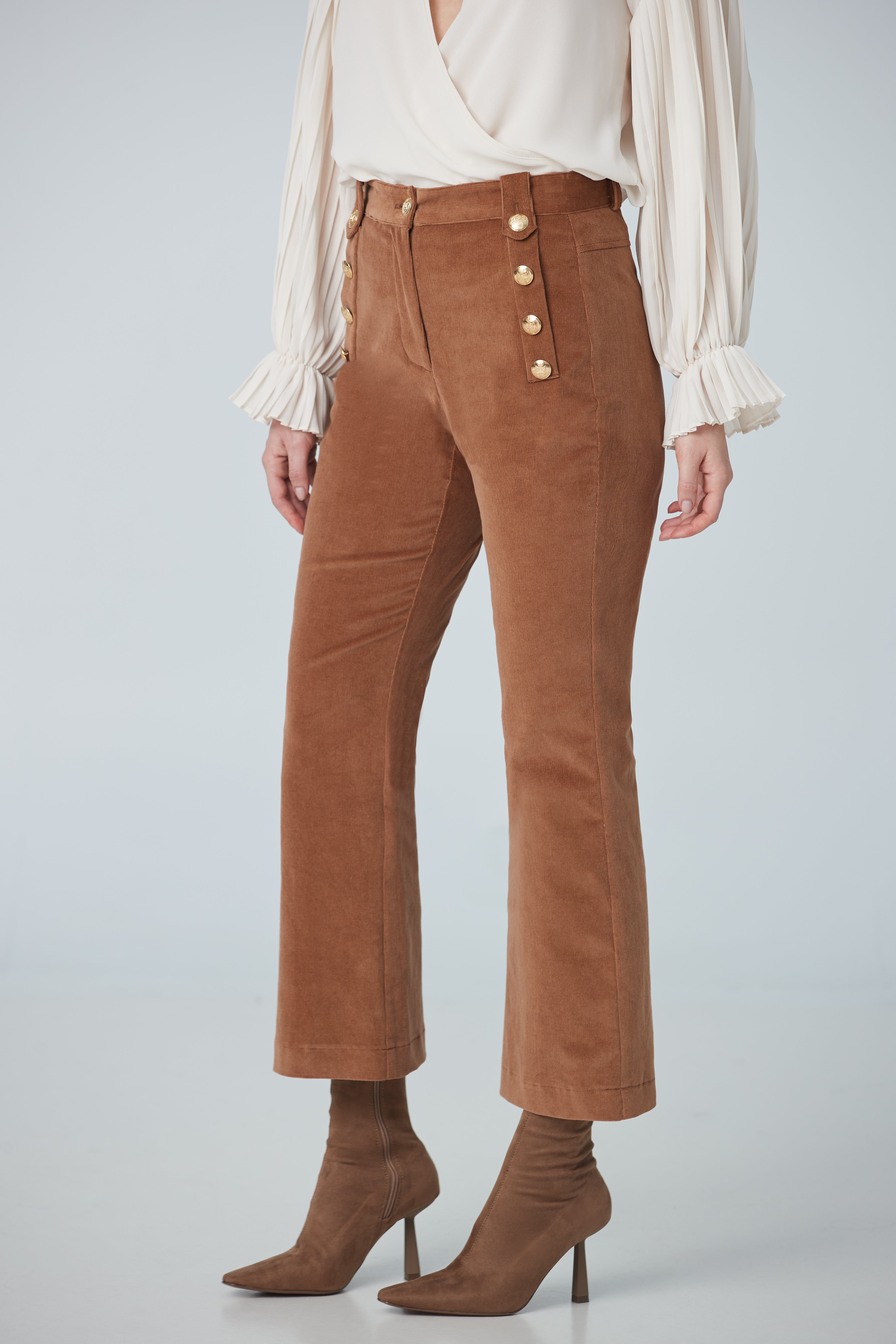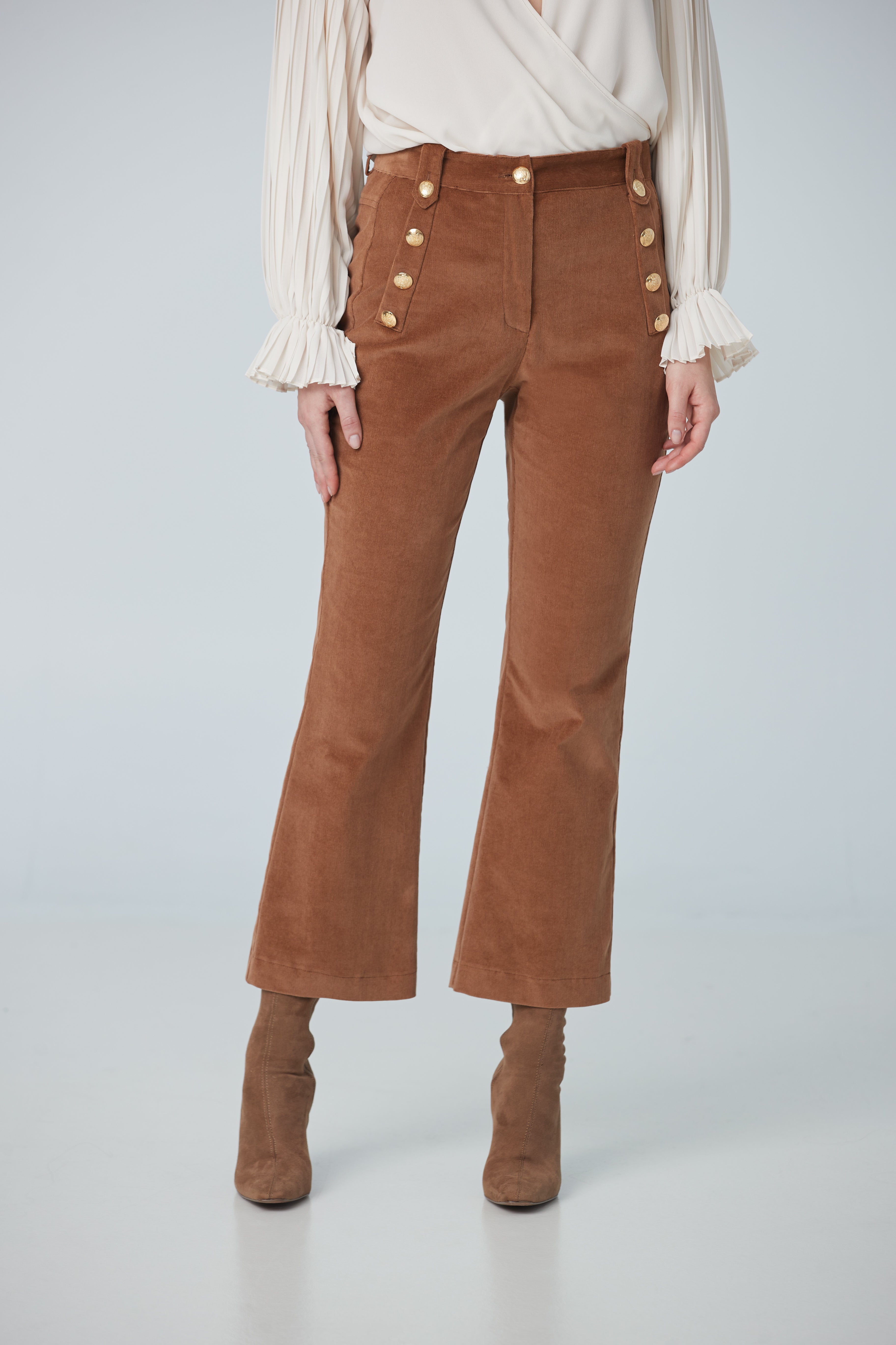 These mini corduroy sailor pants with front buttons are perfect with a blouse for work or a knit for a more casual look.