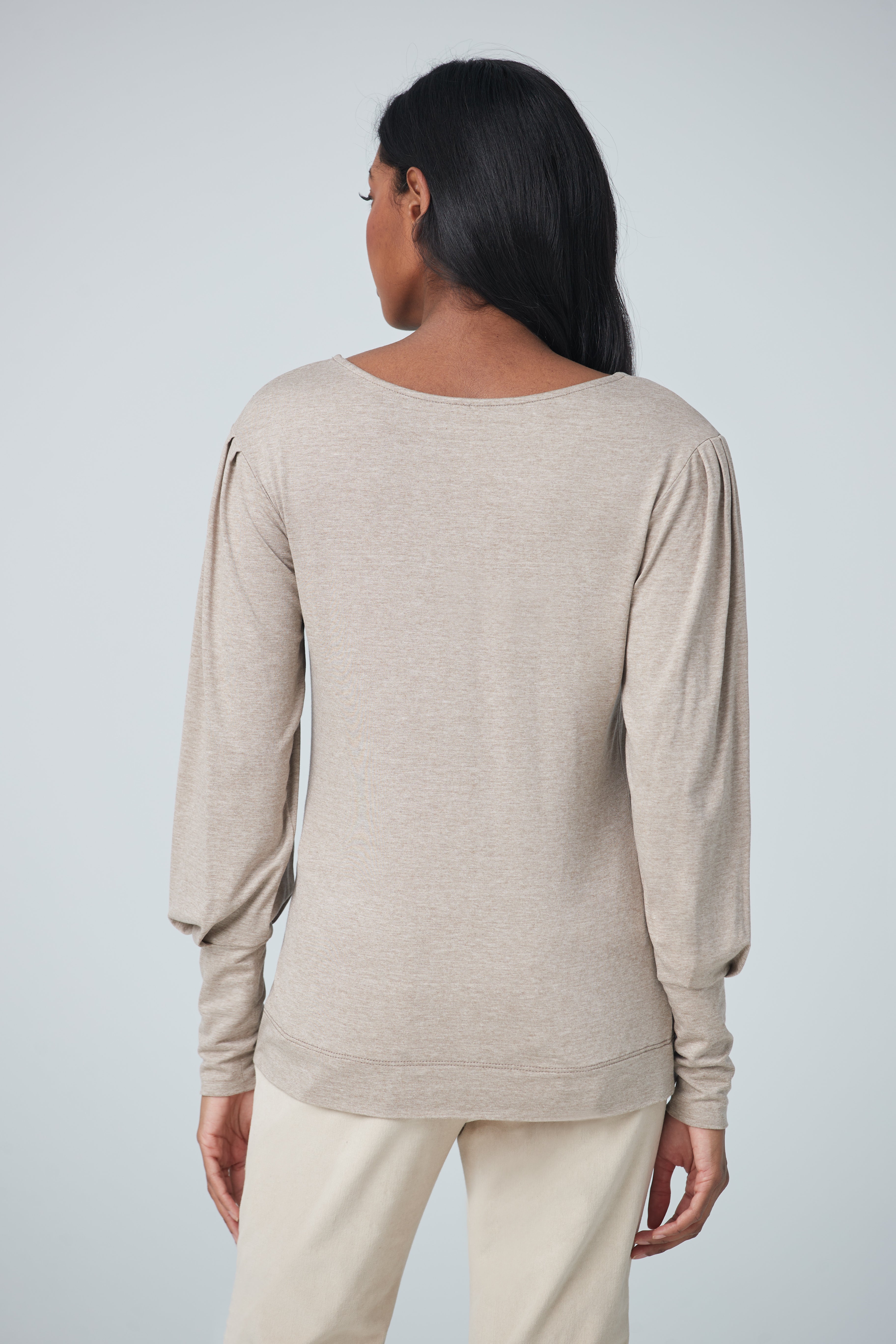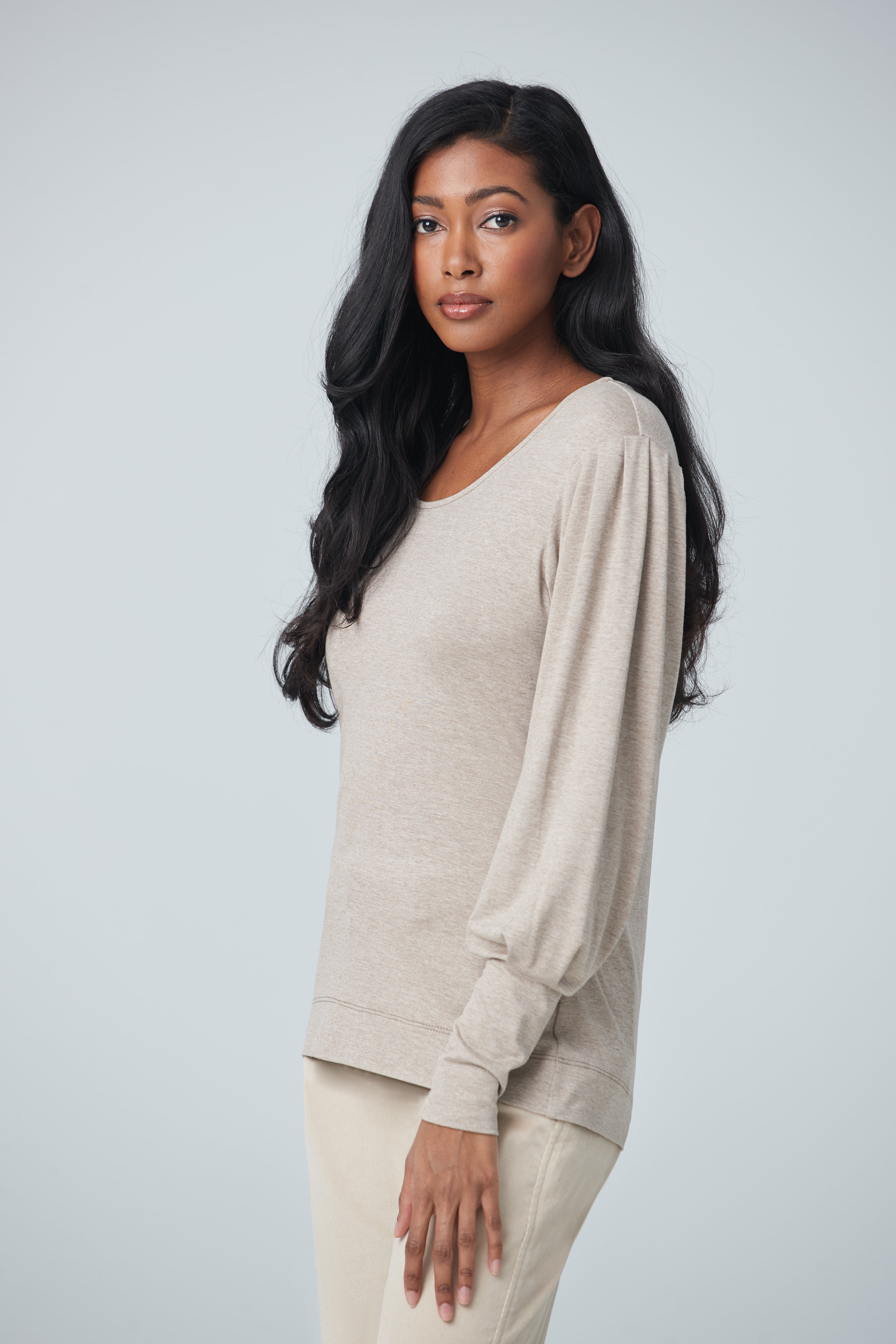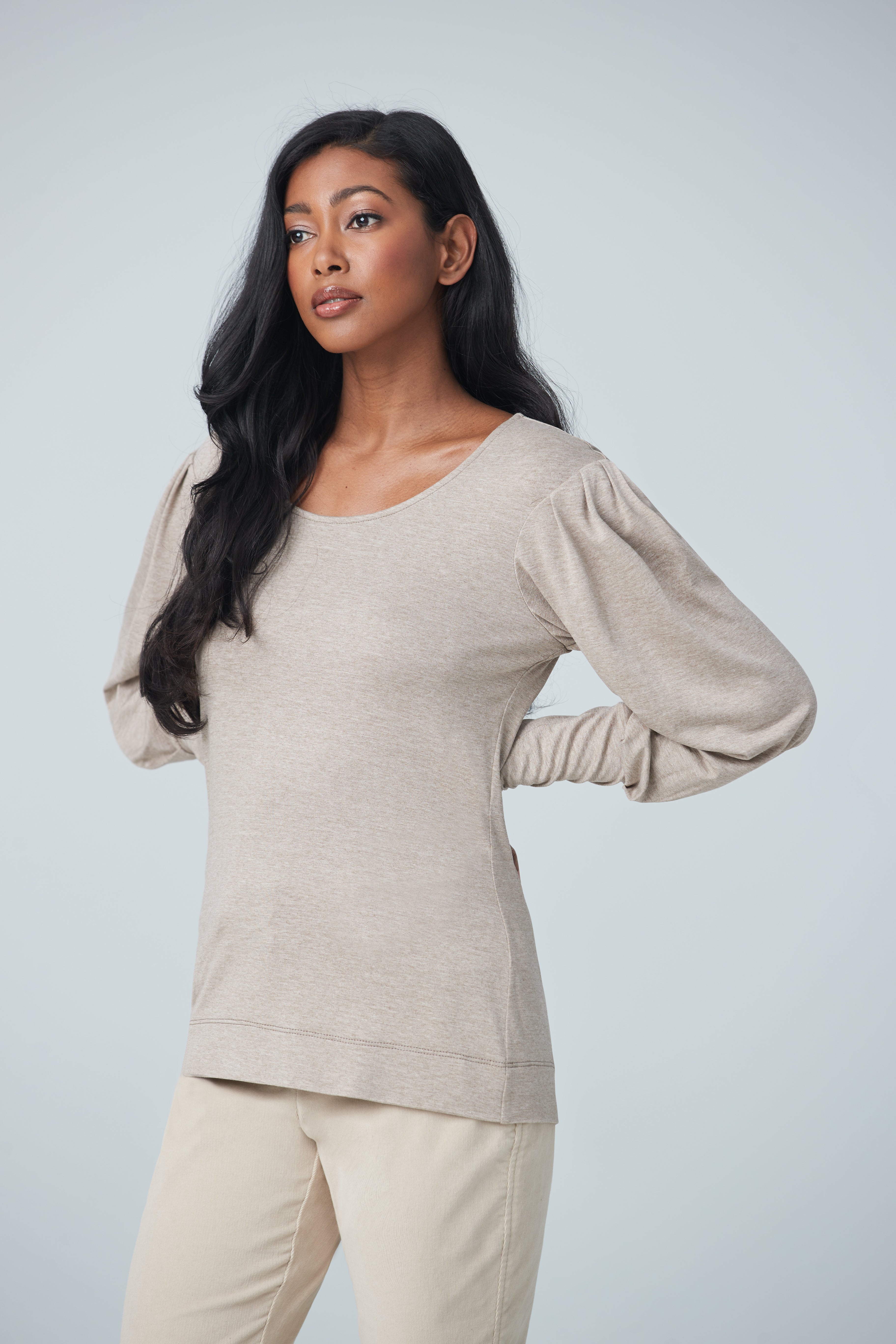Long sleeve crewneck with puffy sleeves and long cuffs. A classic and trendy long sleeve top with long cuffs for your comfort. Very comfortable and can be worn casually in the comfort of your home or at work.