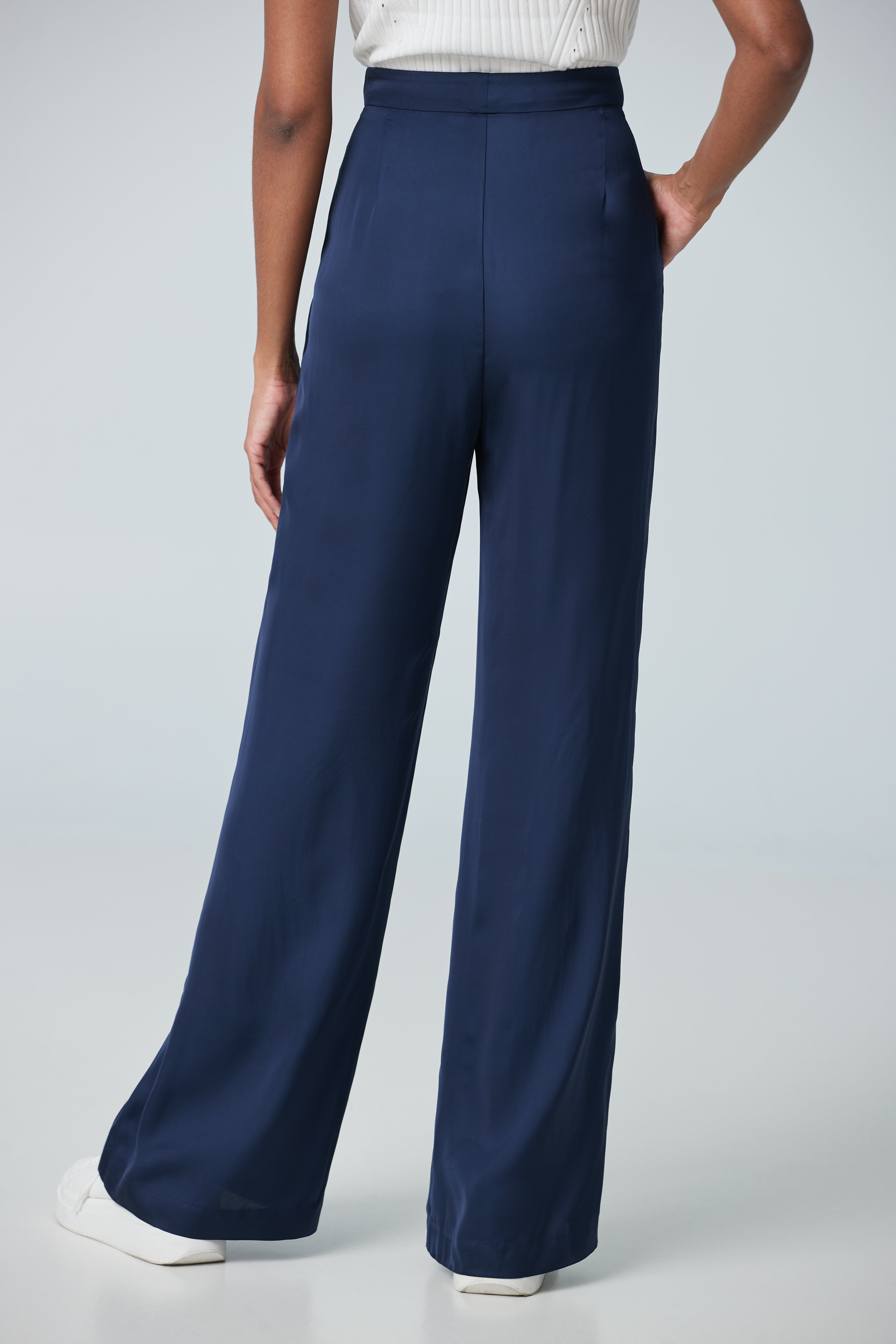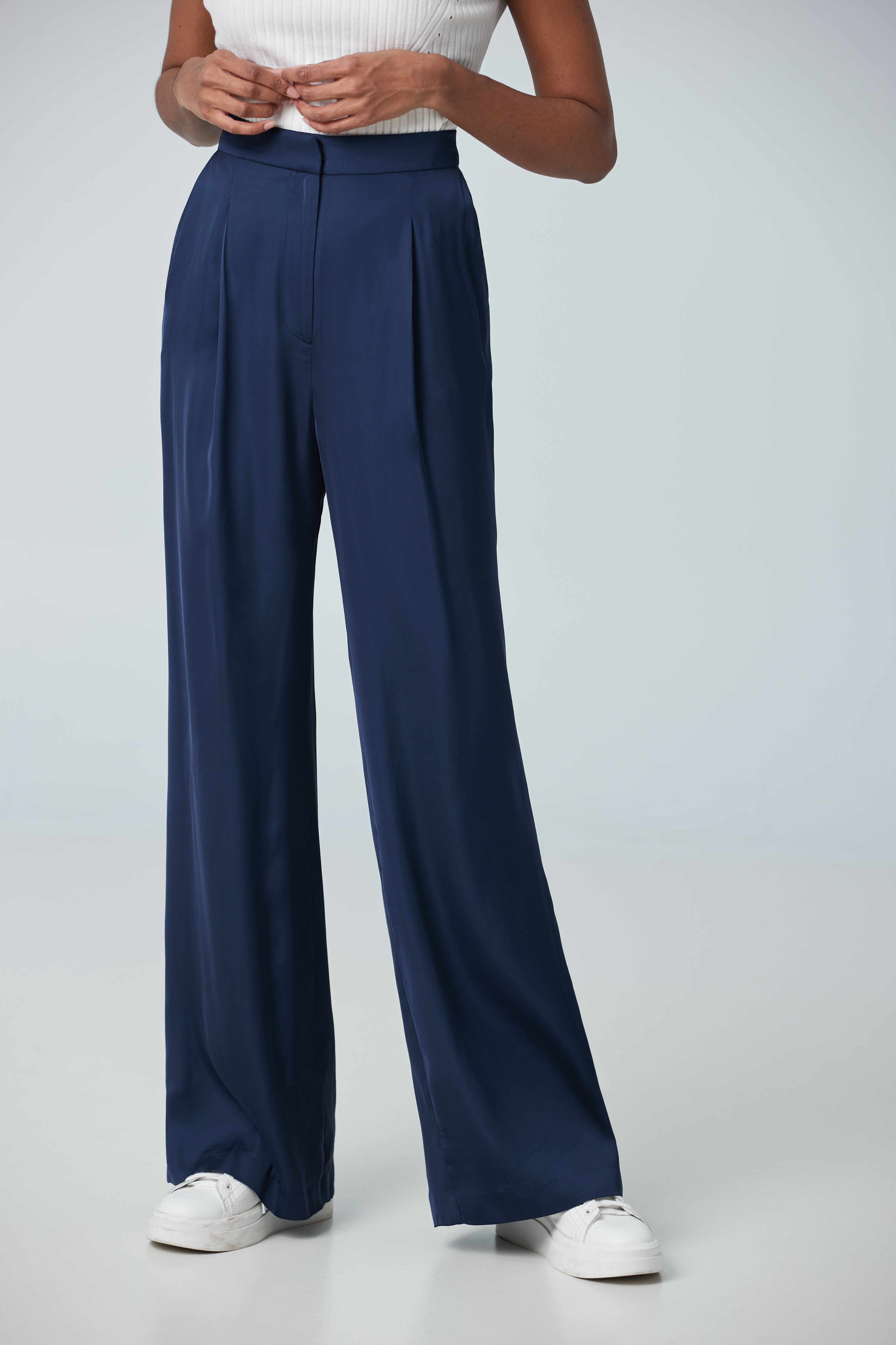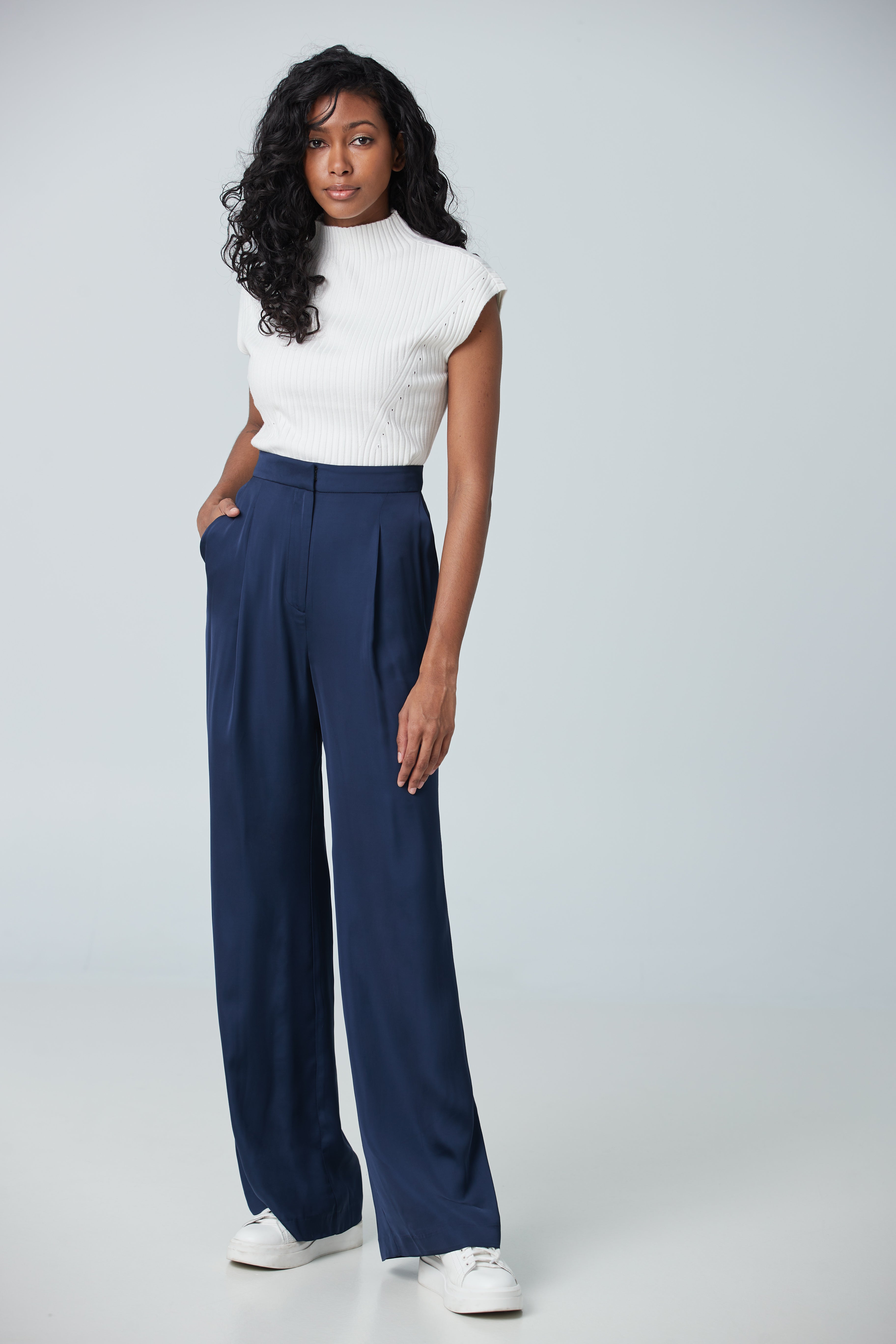 High waist pants made with a satin fabric imported from Portugal with pleat detailing pair with a suit or shirt for a work look.