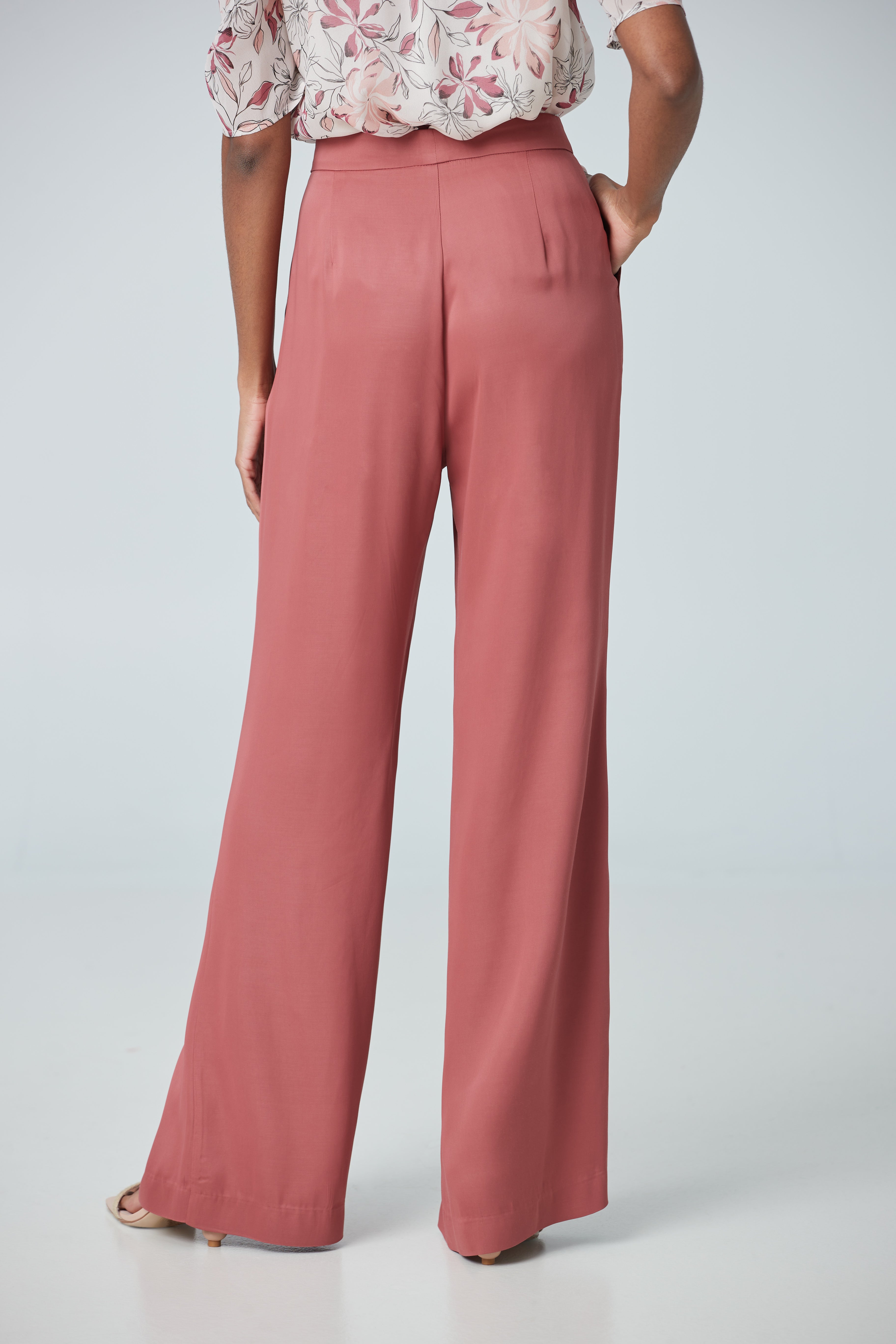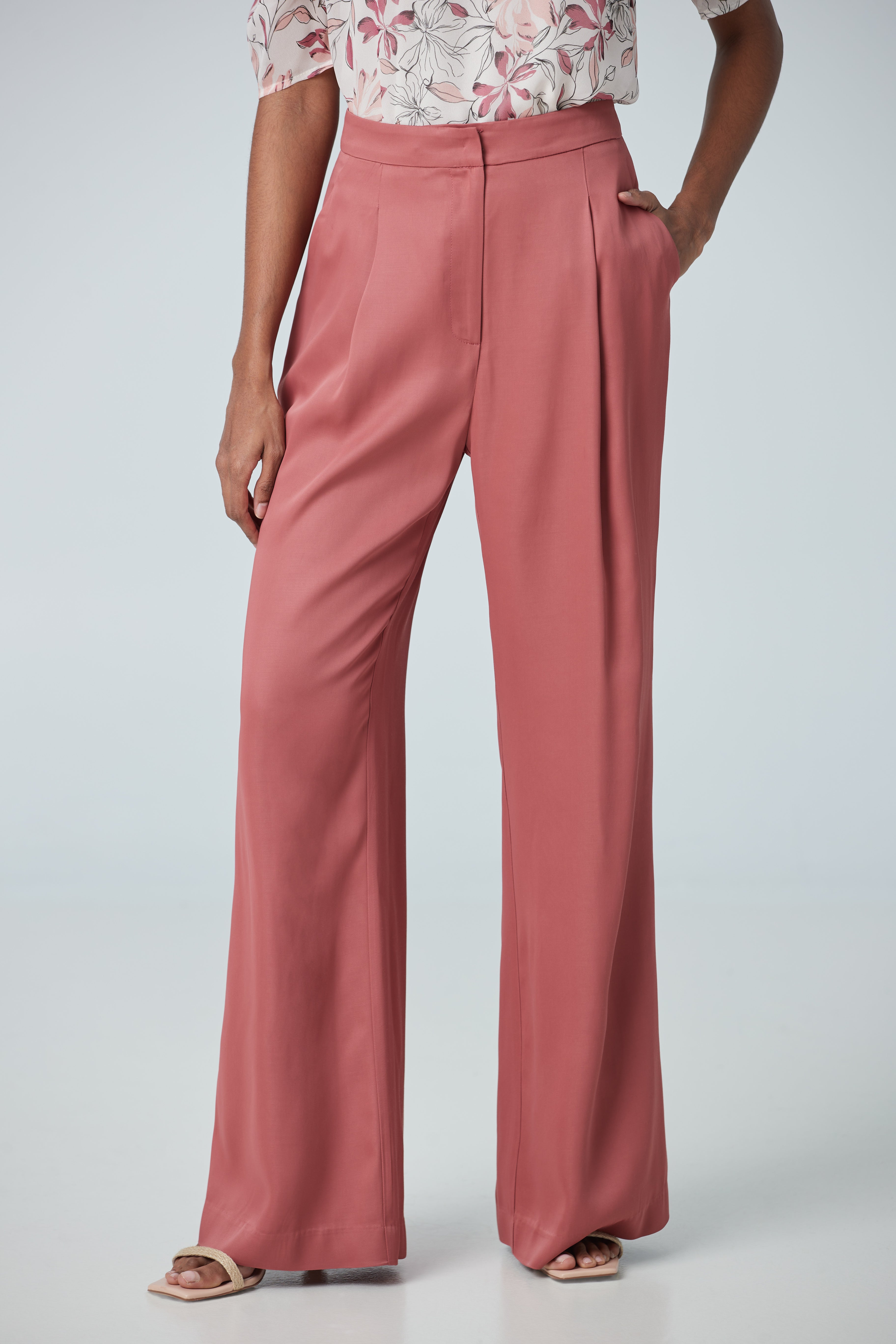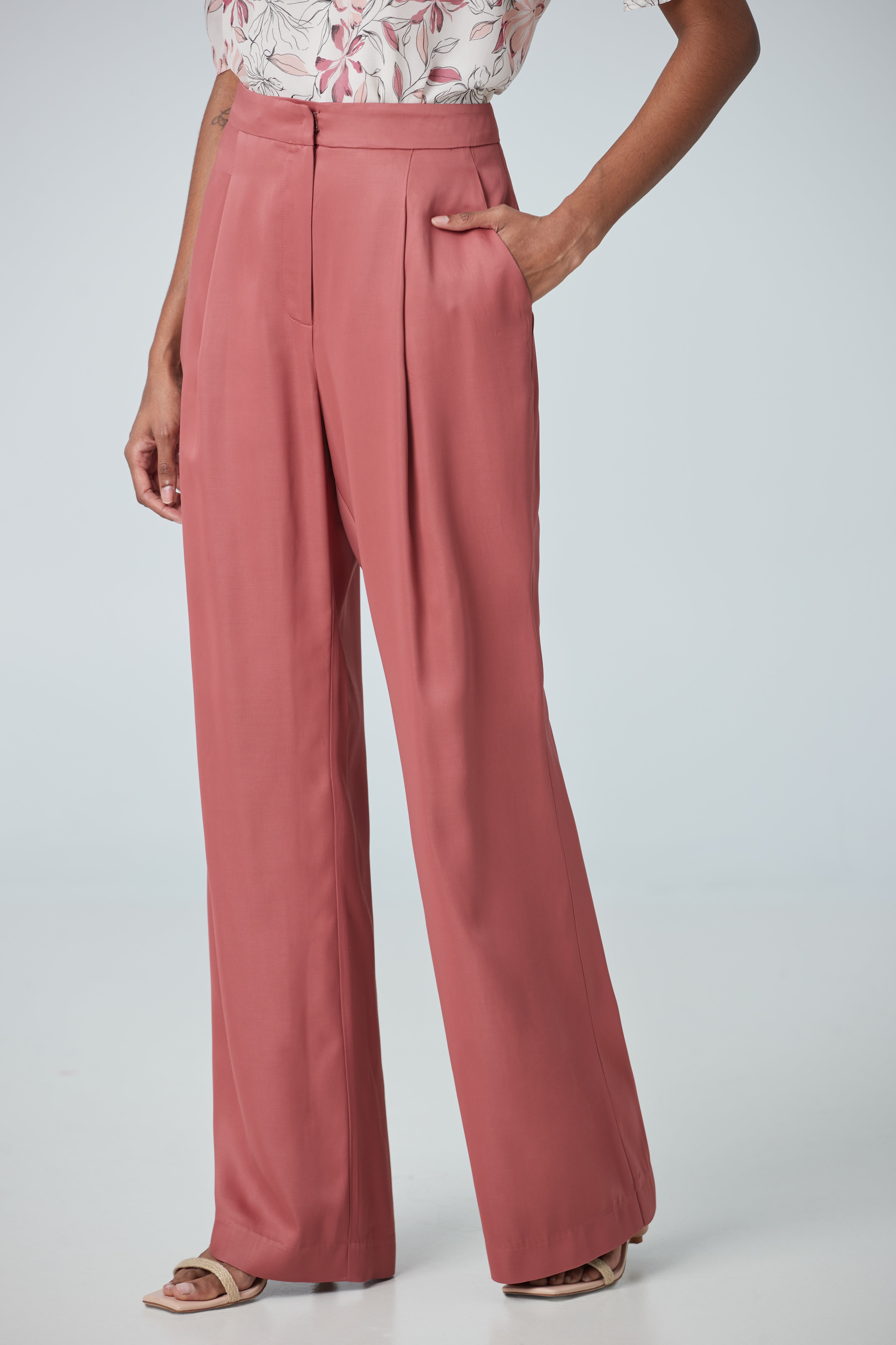 High waist pants made with a satin fabric imported from Portugal with pleat detailing pair with a suit or shirt for a work look.