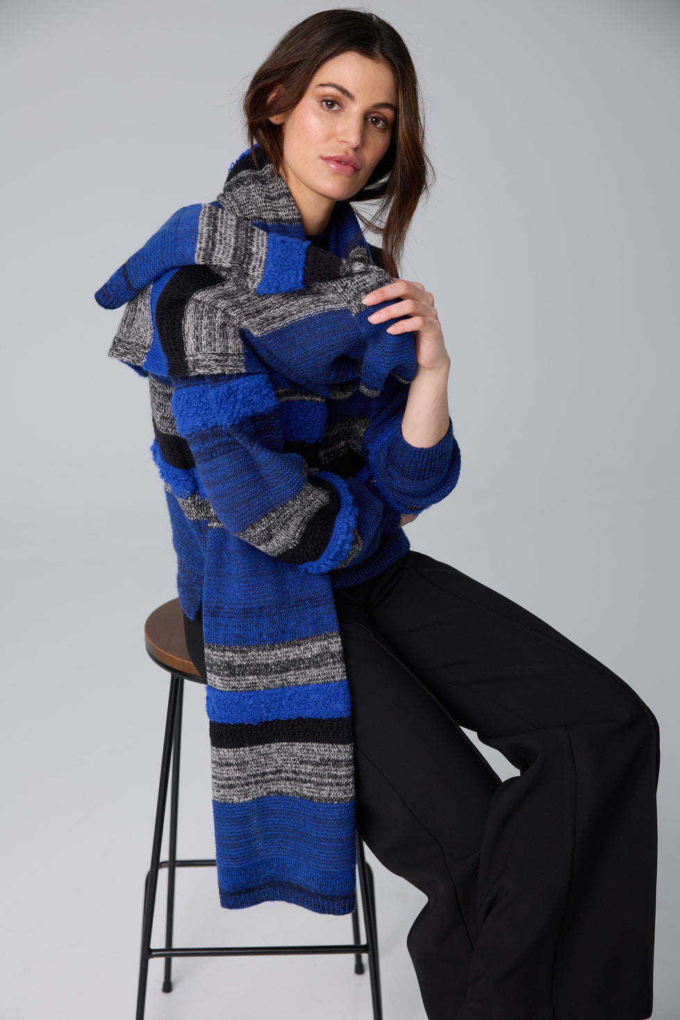 Keep yourself warm with this textured scarf. Perfect to match with the matching knit.