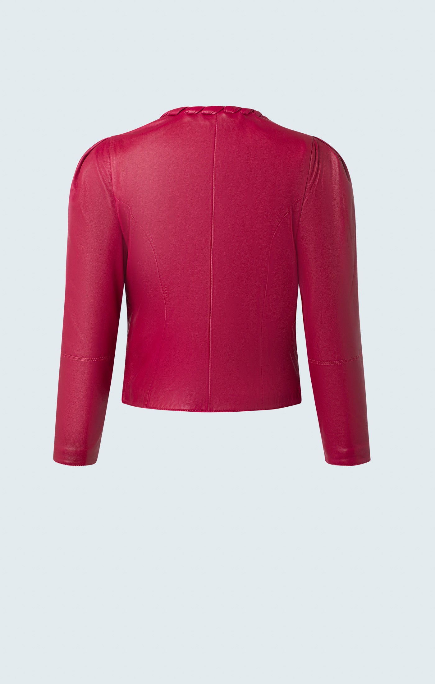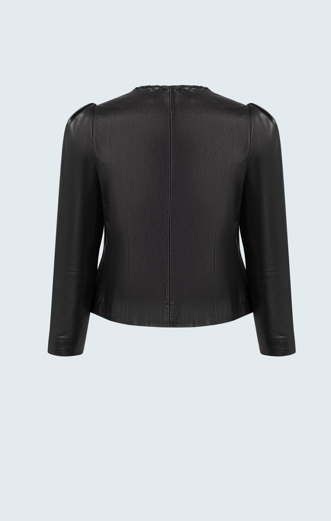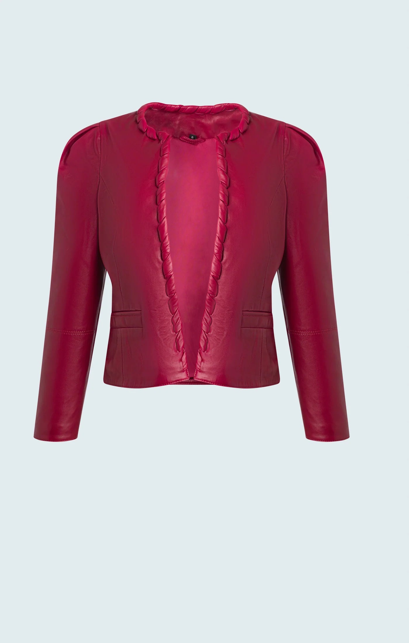 This lambskin leather cropped jacket with puffed sleeves is an essential for the arrival of fall. The braided details on the leather makes this piece sophisticated and unique.