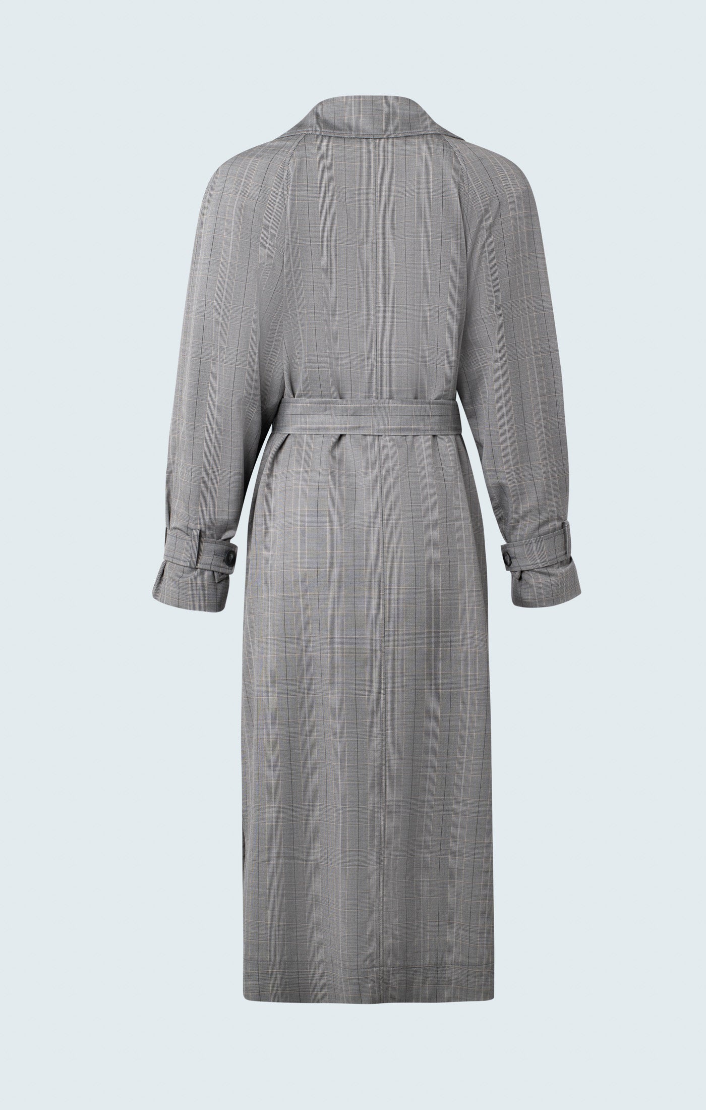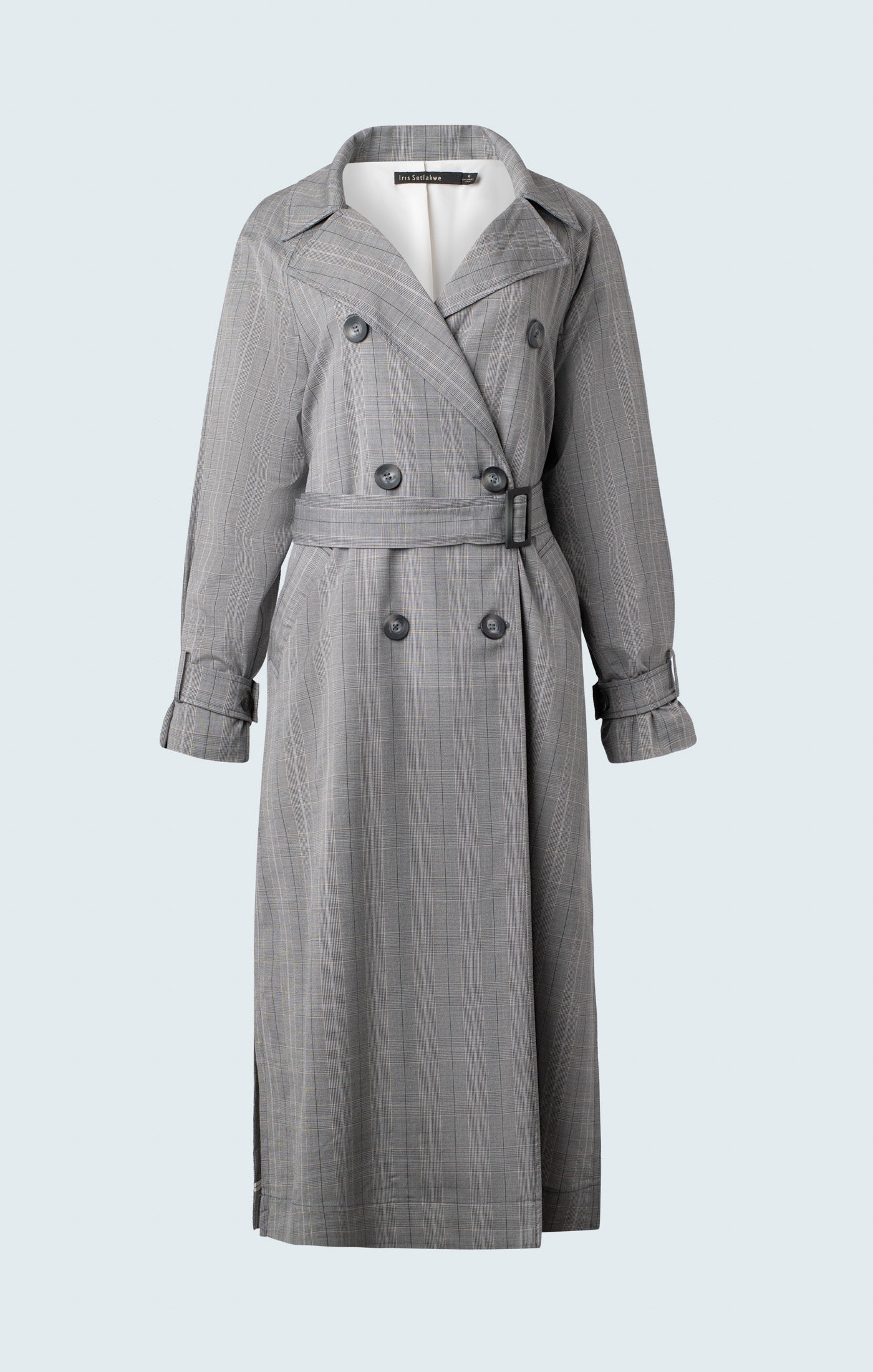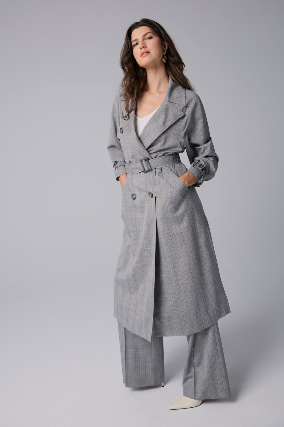 This trench is the perfect lightweight coat for weather transitions. Classic silhouette with a little twist. This timeless piece in grey plaid has the perfect cut that makes this piece unique.
