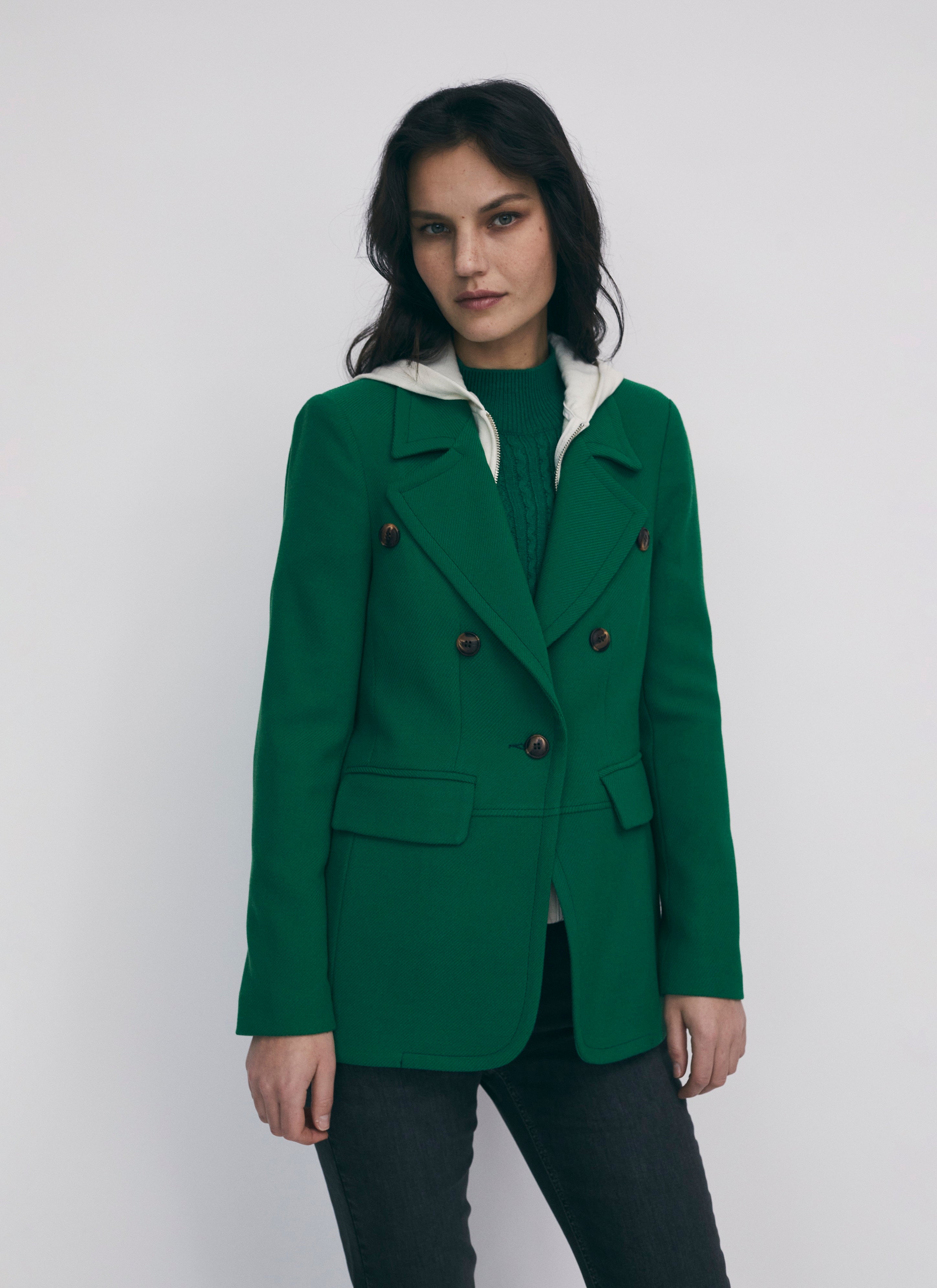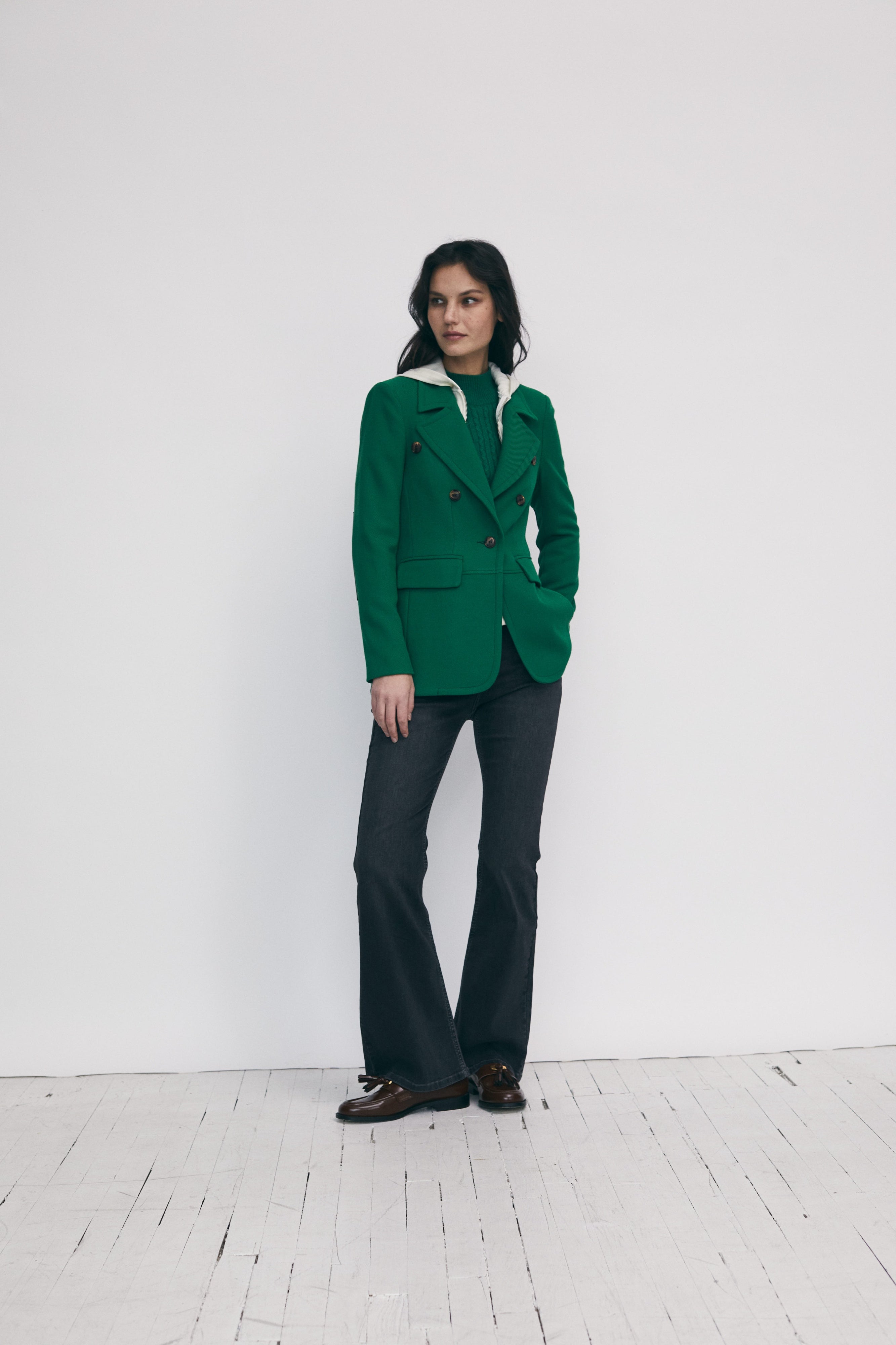 A stretchy sweater twill jacket with leather patches on the elbows. This amazing green blazer is a mix of edgy and classic together. This jacket is made in a special fabric from Italy. Can be paired with jeans or black pants for a power look.