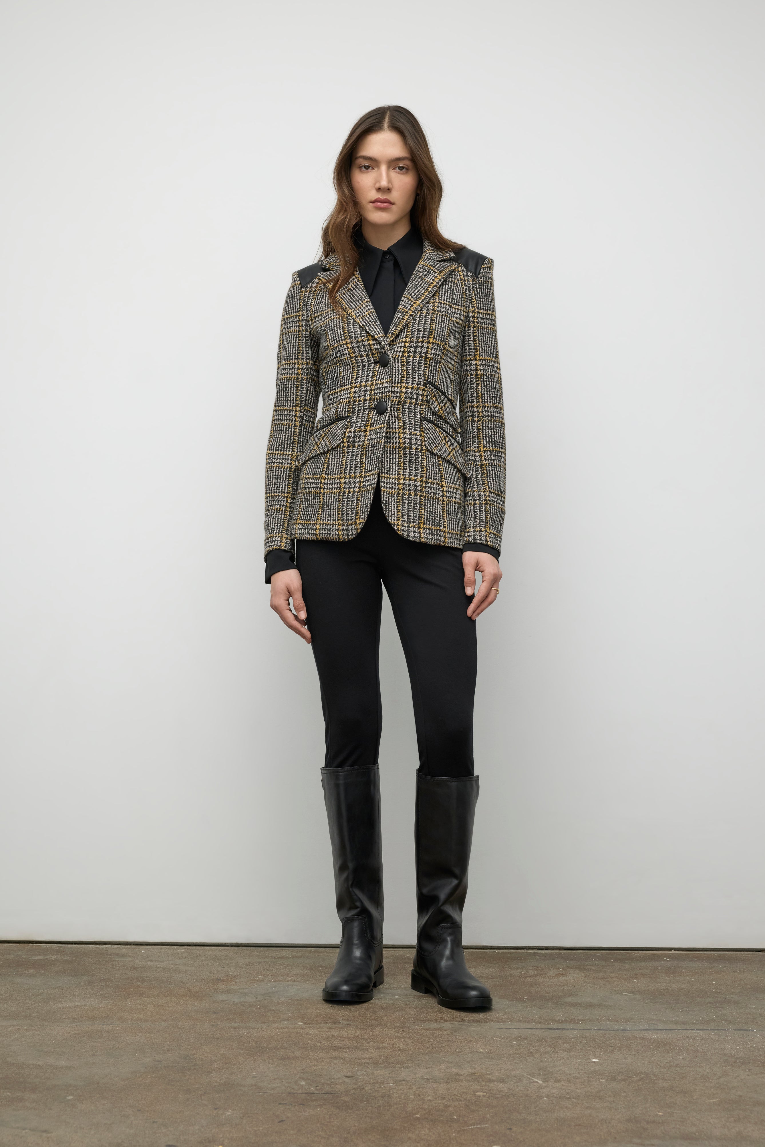 Slim-fit knit jacket in textured jacquard enhanced by leather details for a modern sophisticated touch. A distinctive piece that combines structure and refinement.