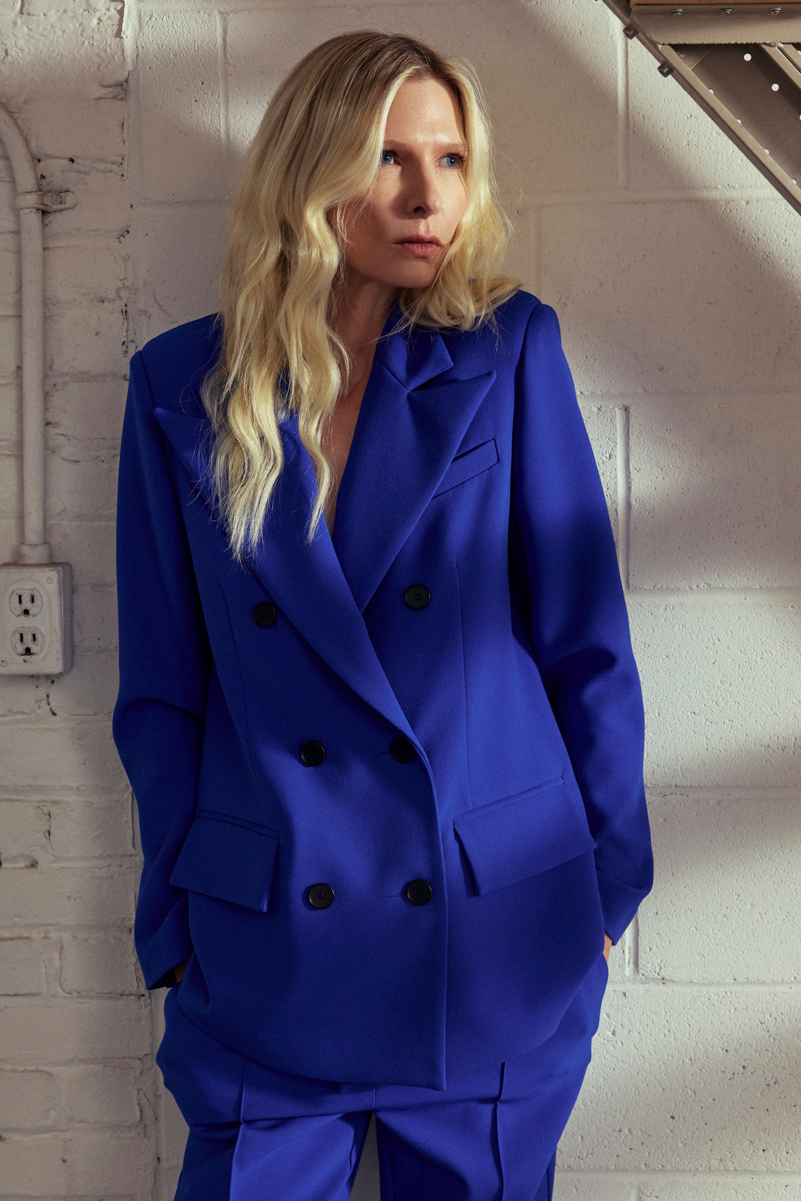 Long loose-fitting double-breasted jacket with figure-affirming collar. Its relaxed fit and structured design strike the perfect balance between modernity and elegance for a look that's both bold and refined.