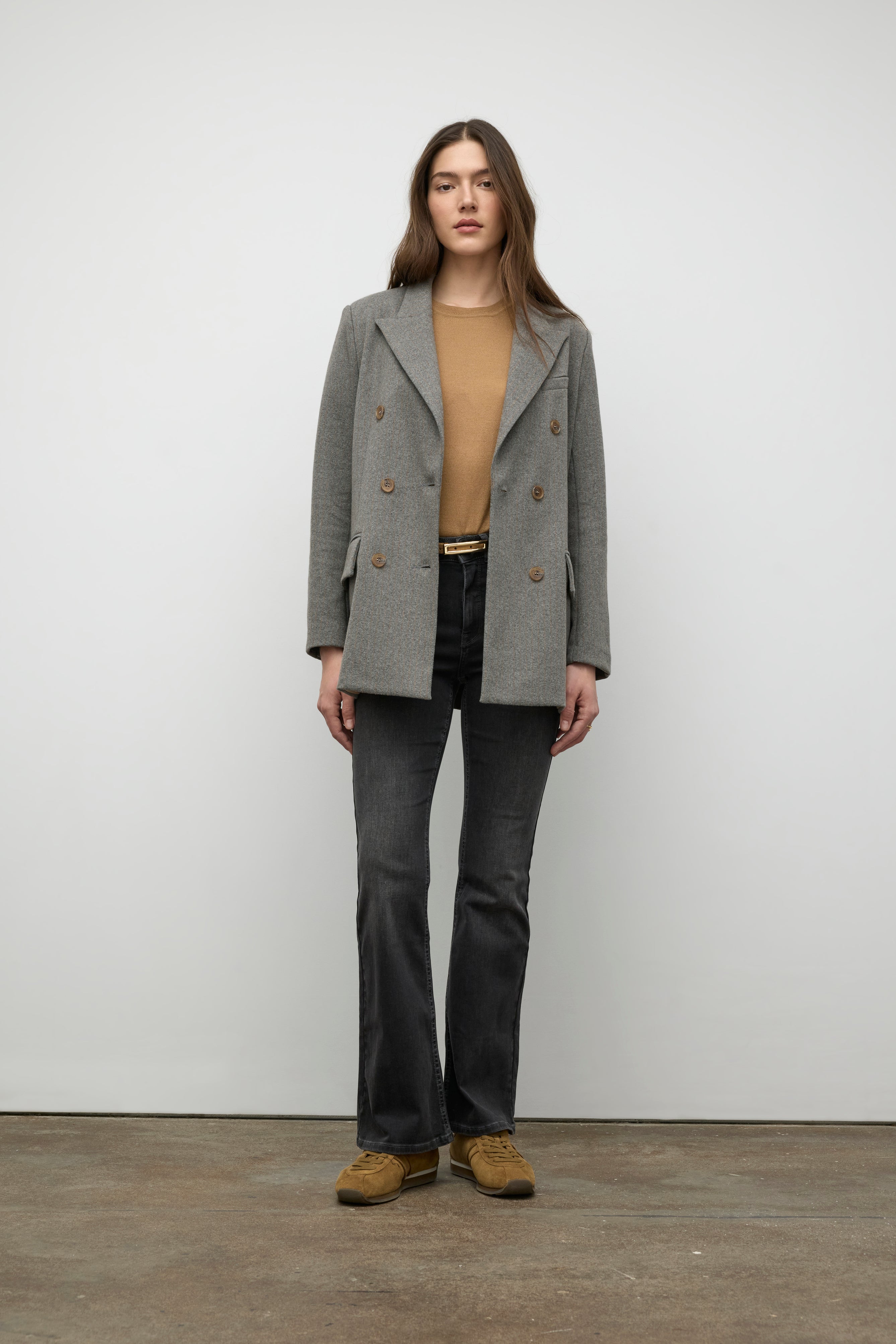Long jacket in double-breasted woven jersey combining structure and suppleness. Its elongated cut and textured fabric create a modern sophisticated silhouette perfect for an elegant office look or as an in-between-season coat.