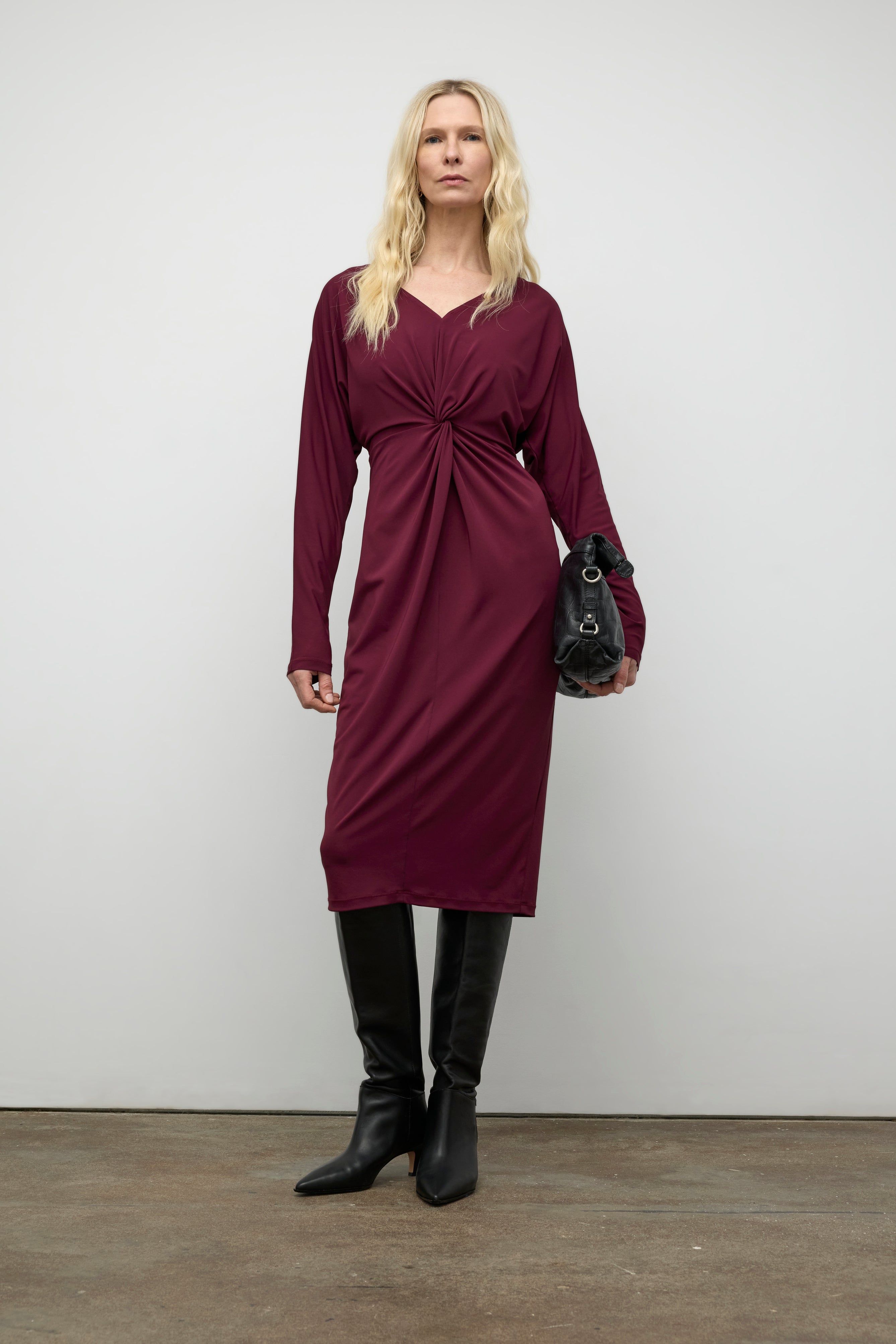 Long-sleeved mid-length dress in matte jersey enhanced by an elegant bow detail at the front. A feminine comfortable piece ideal for an effortlessly refined look.