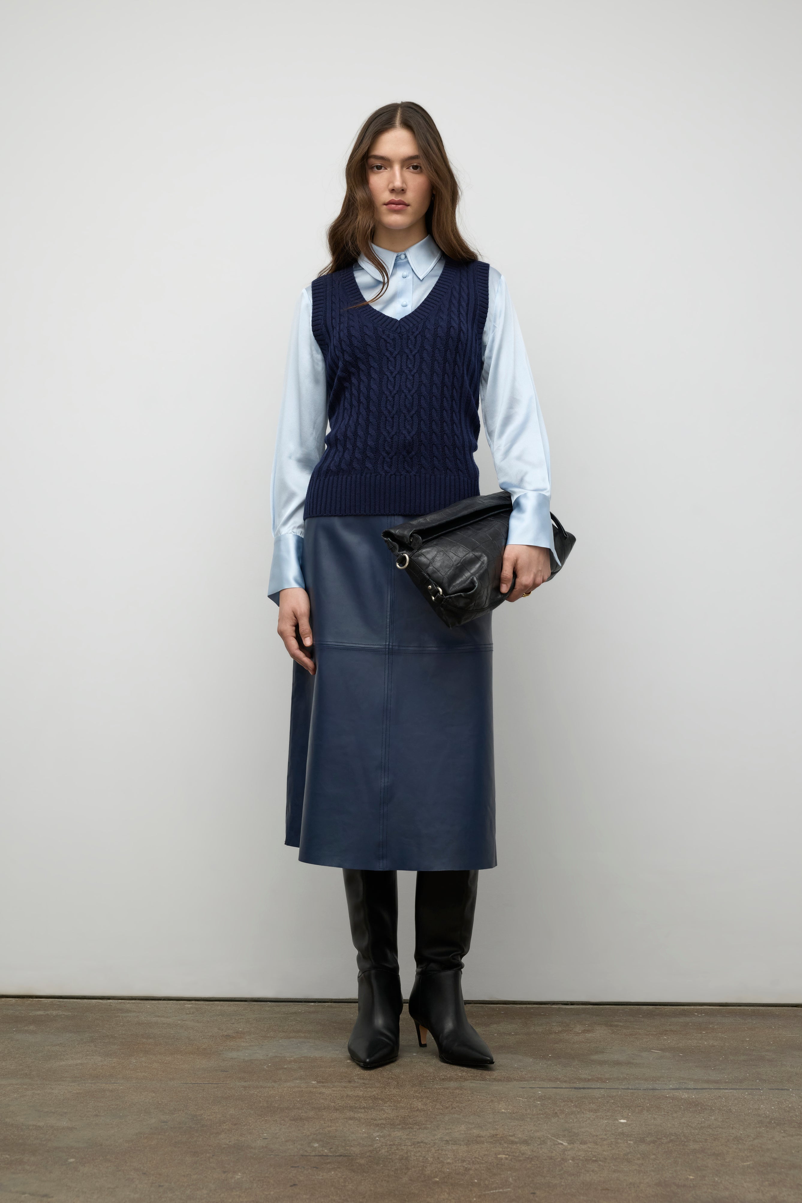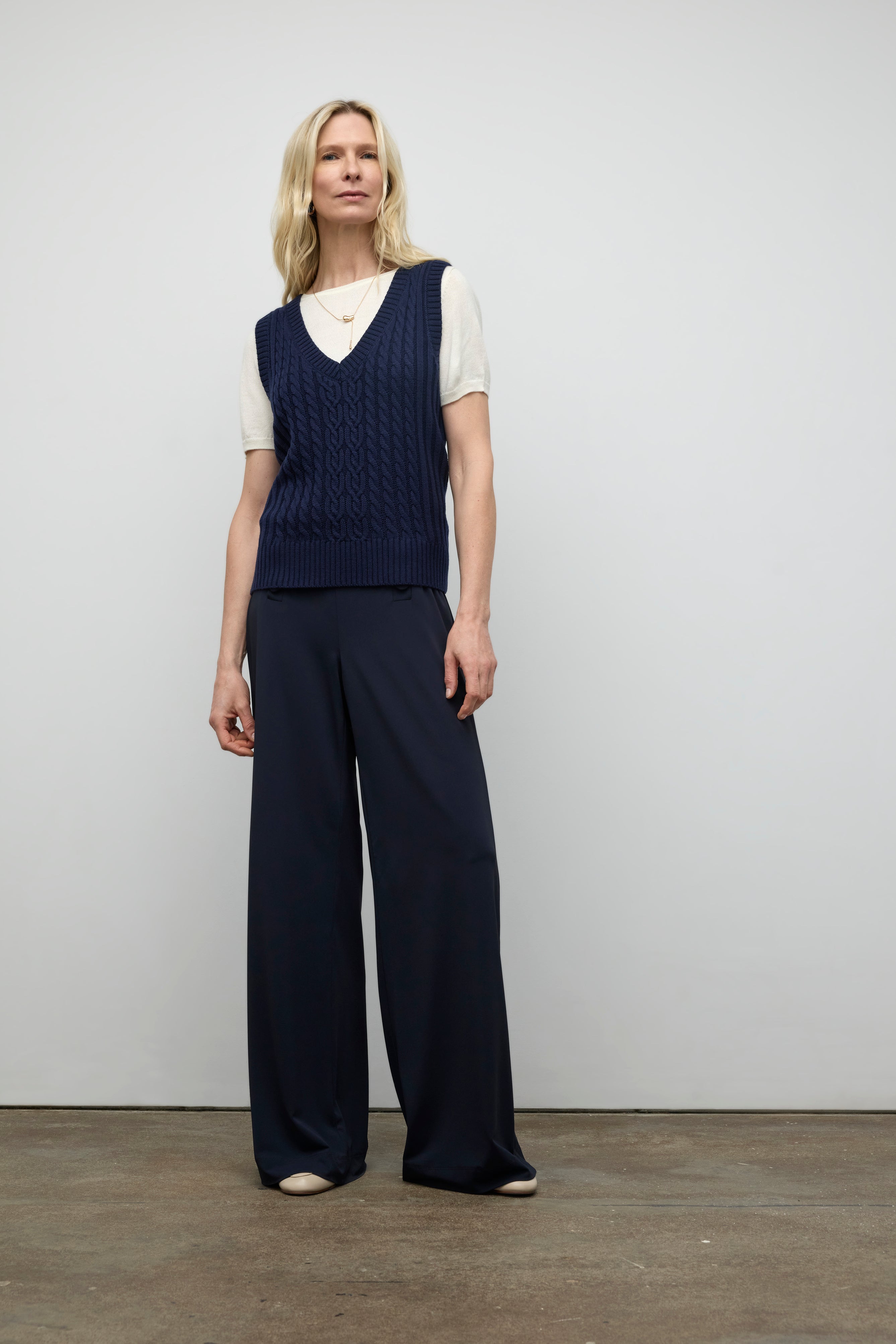 Sleeveless V-neck knit adorned with cabled motifs for a classic timeless texture. Perfect layered or worn on its own it adds a touch of warmth and casual elegance.