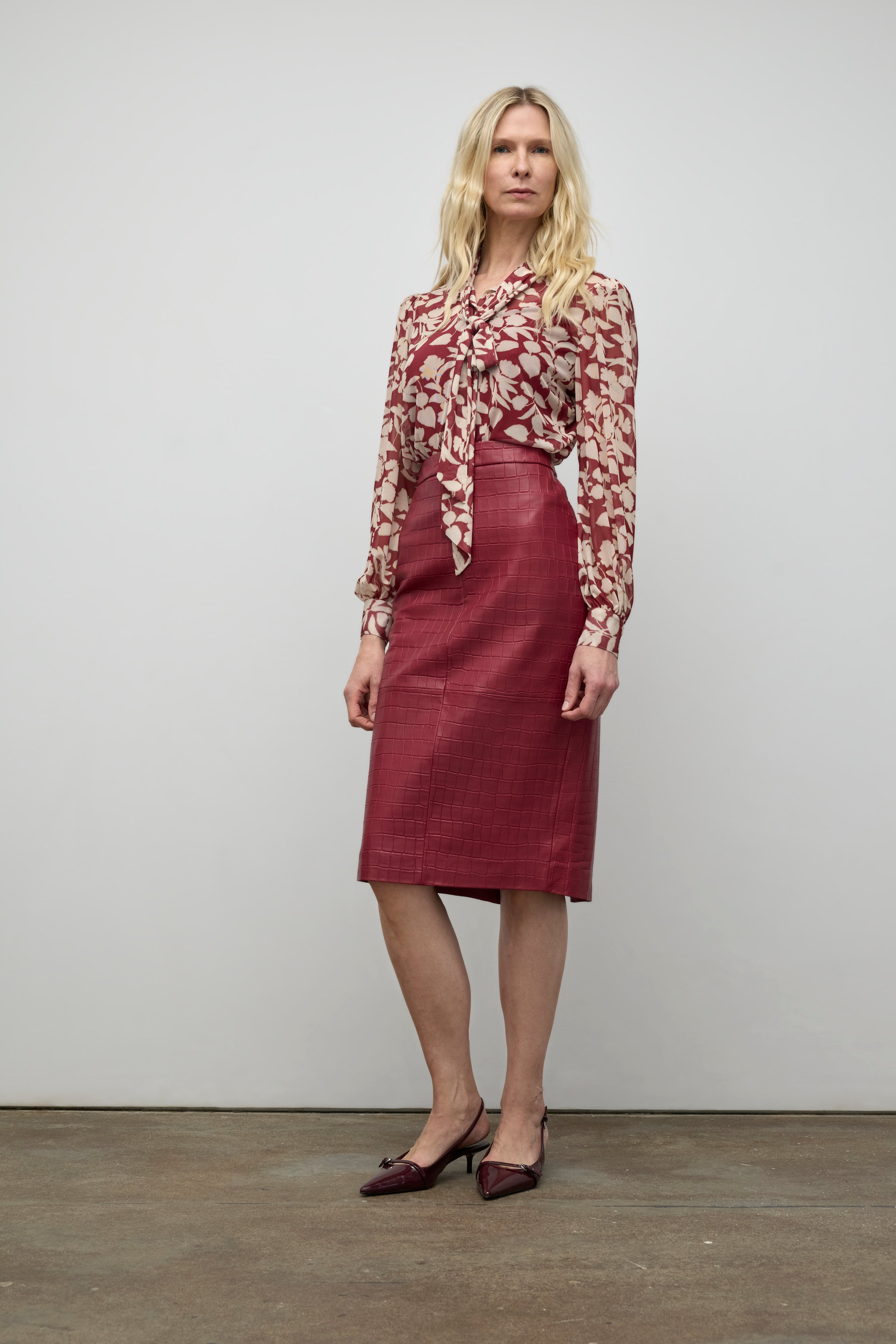 Crocodile-print leather pencil skirt cut to hug the figure with elegance. A sophisticated bold piece that adds a touch of character to your outfits.