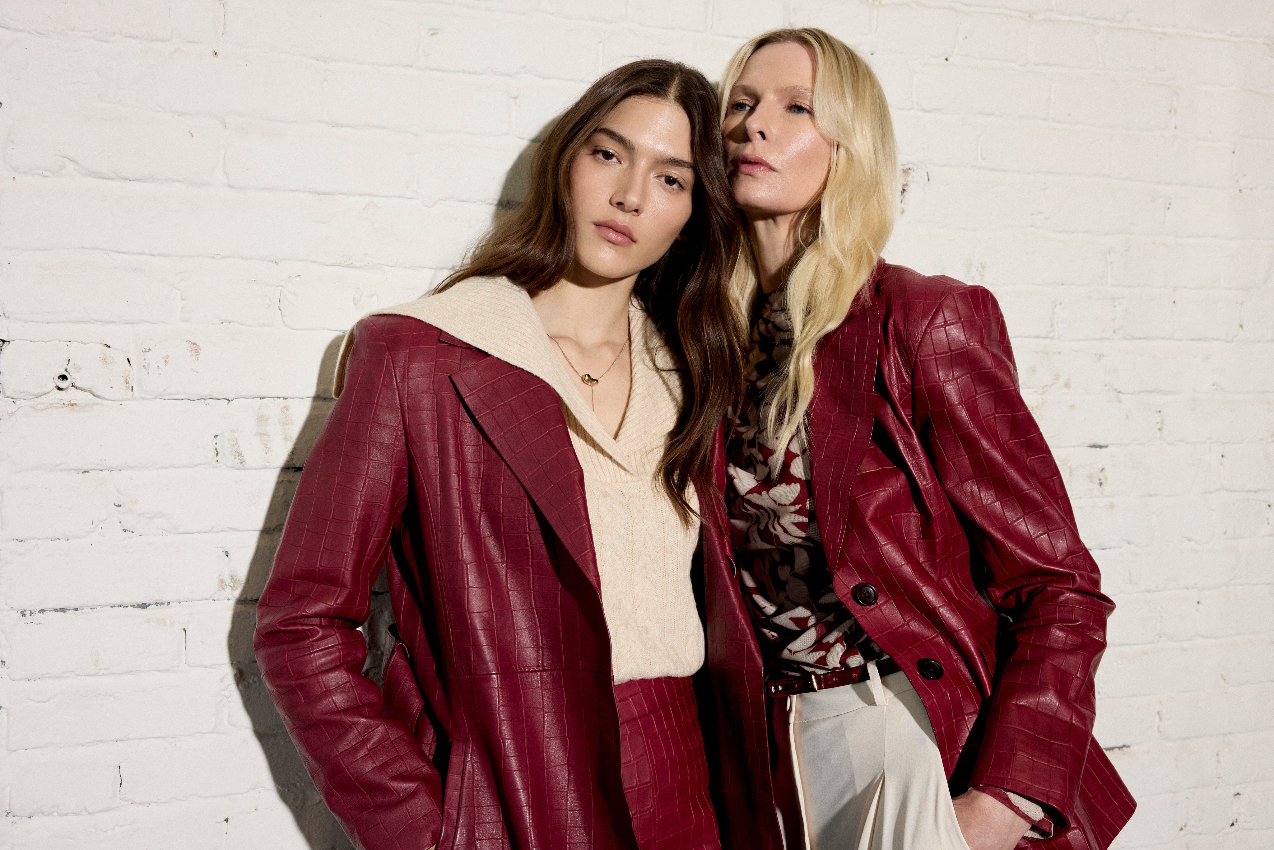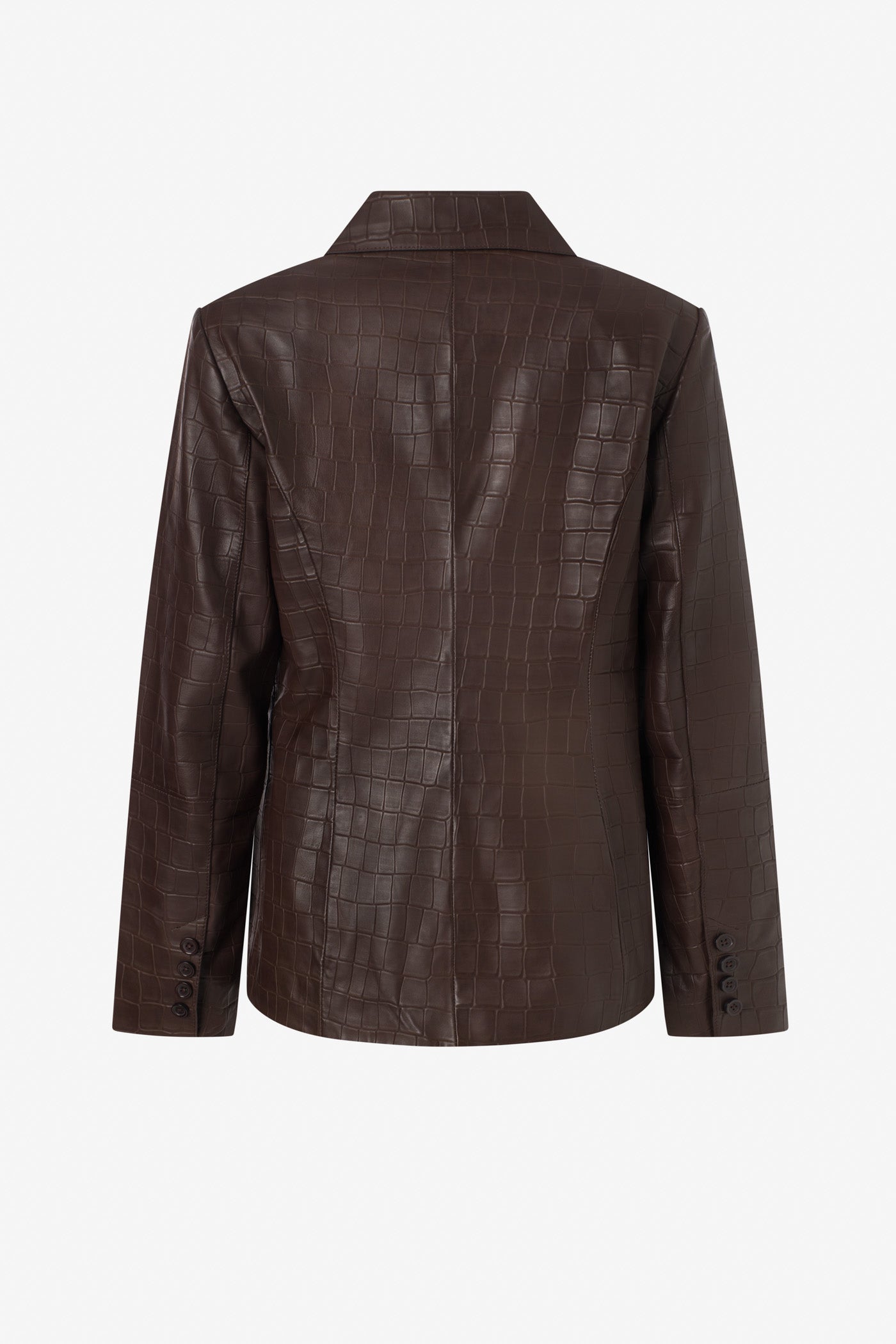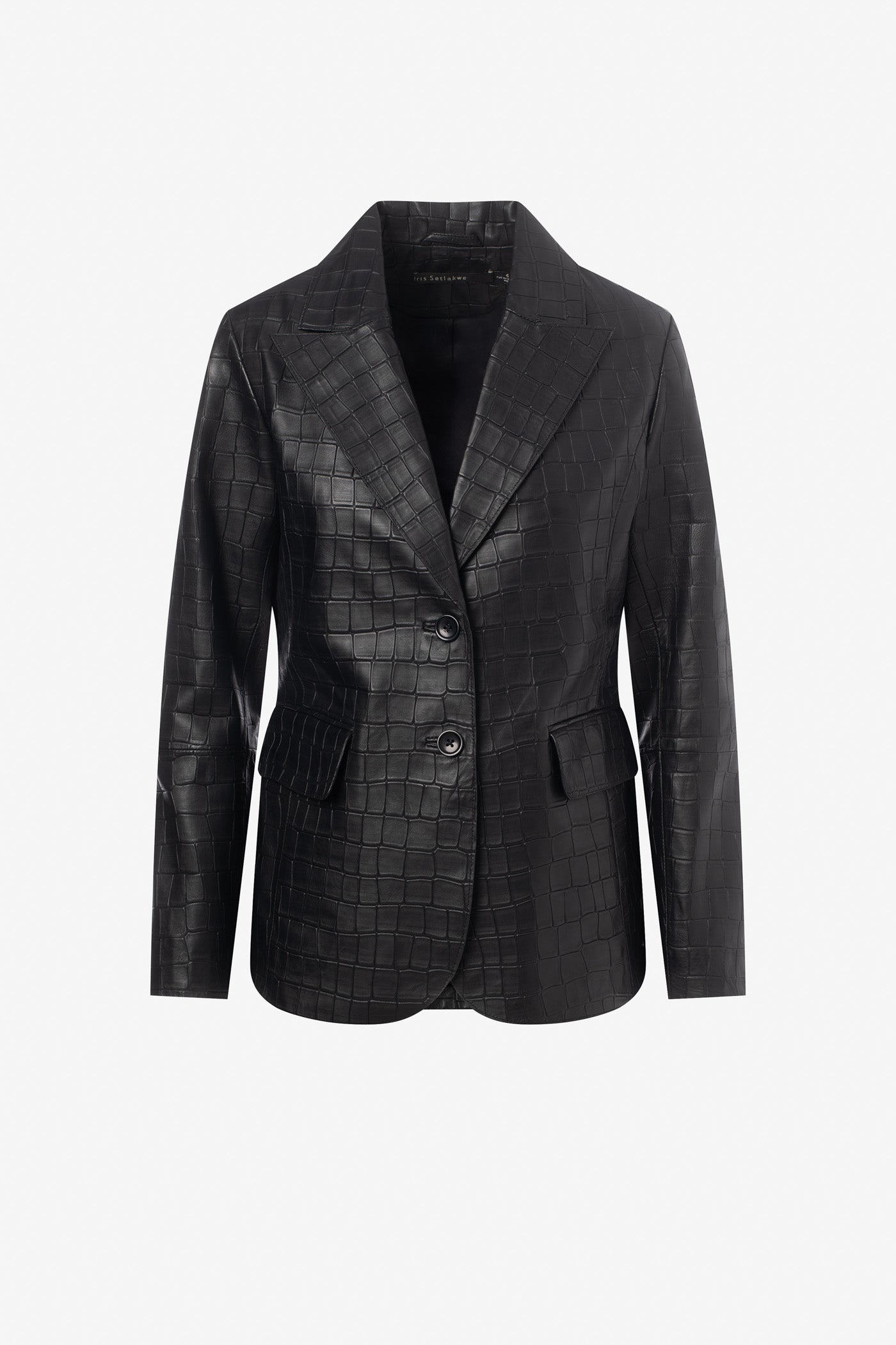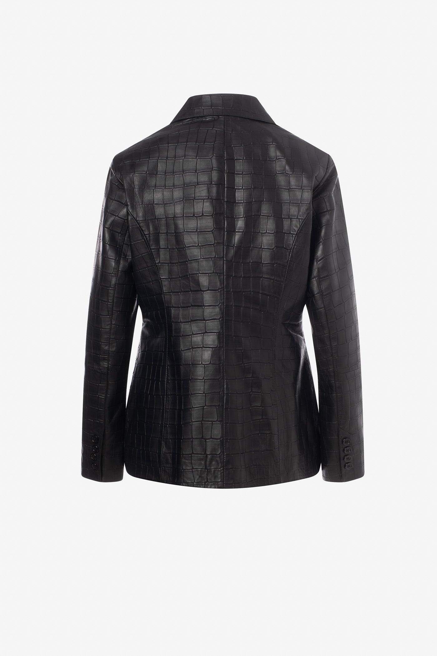 Fitted jacket in crocodile-print leather fastened with two buttons for a bold structured silhouette. A statement piece that combines luxury texture and contemporary elegance.