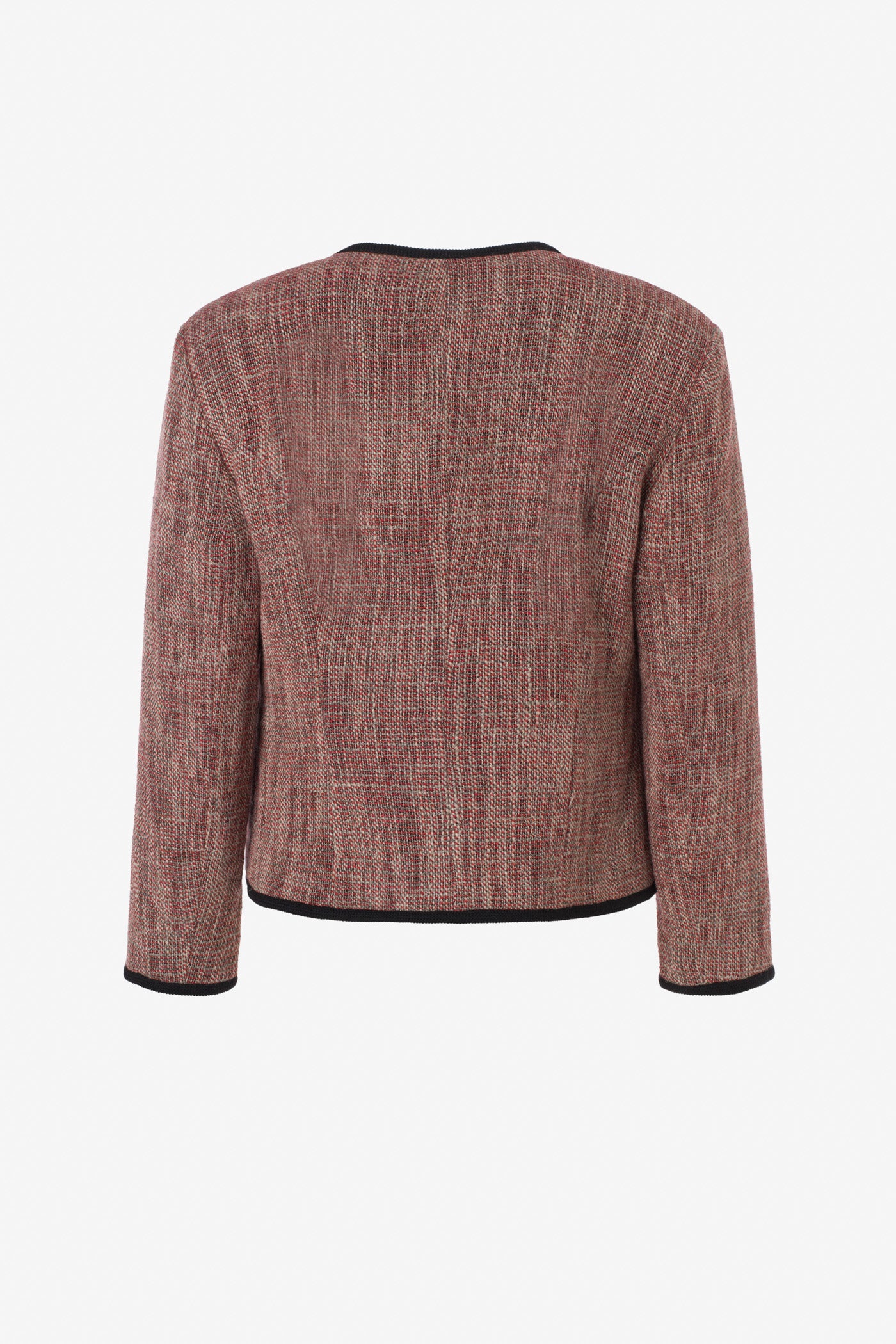 Short jacket made from blended yarns offering a rich texture and structured look. Enhanced by black stitching details and patch pockets it combines character and refinement for a modern polished look.