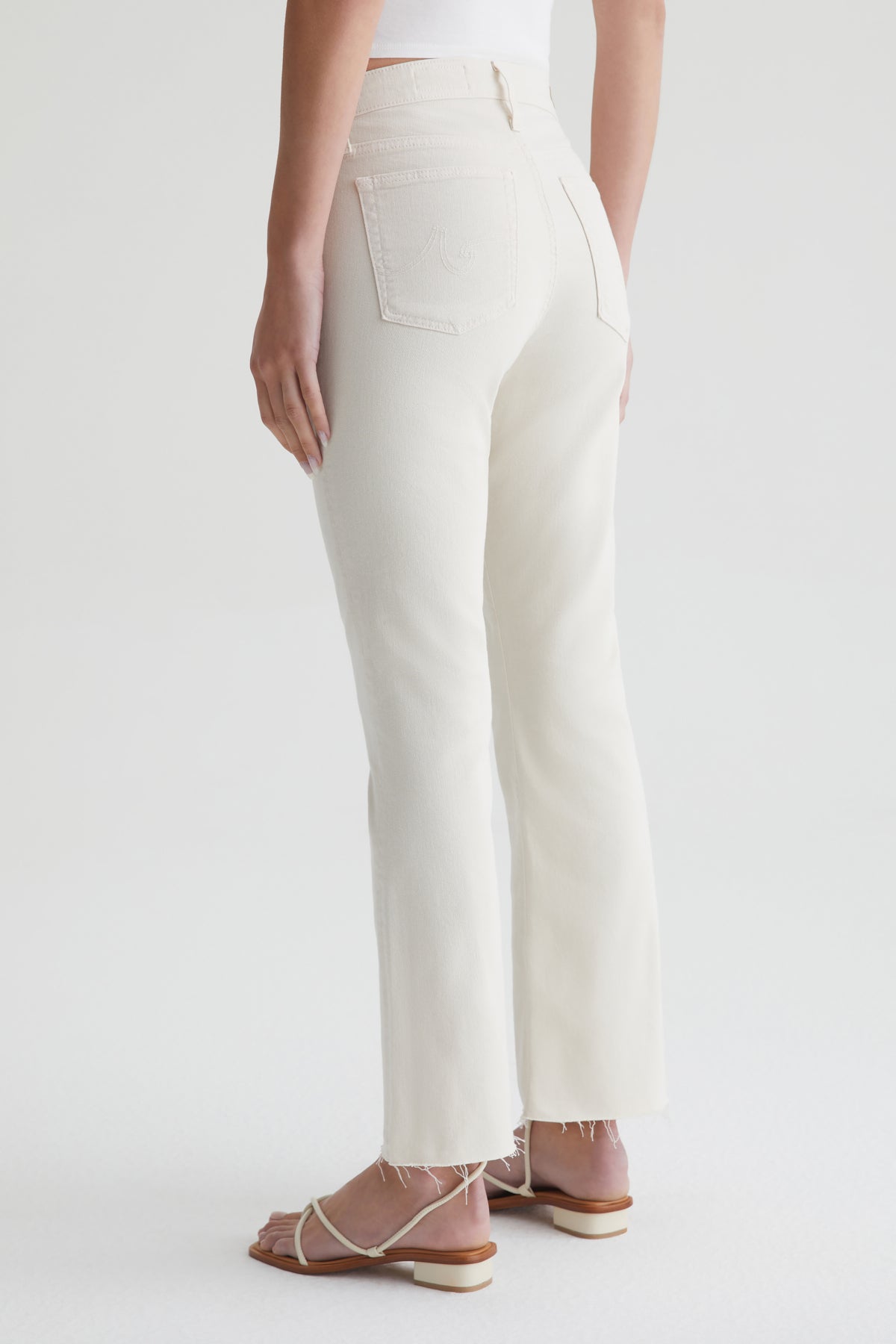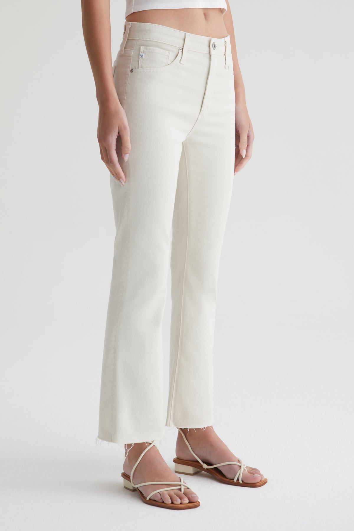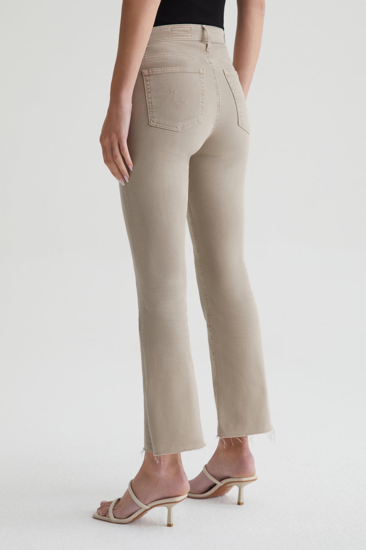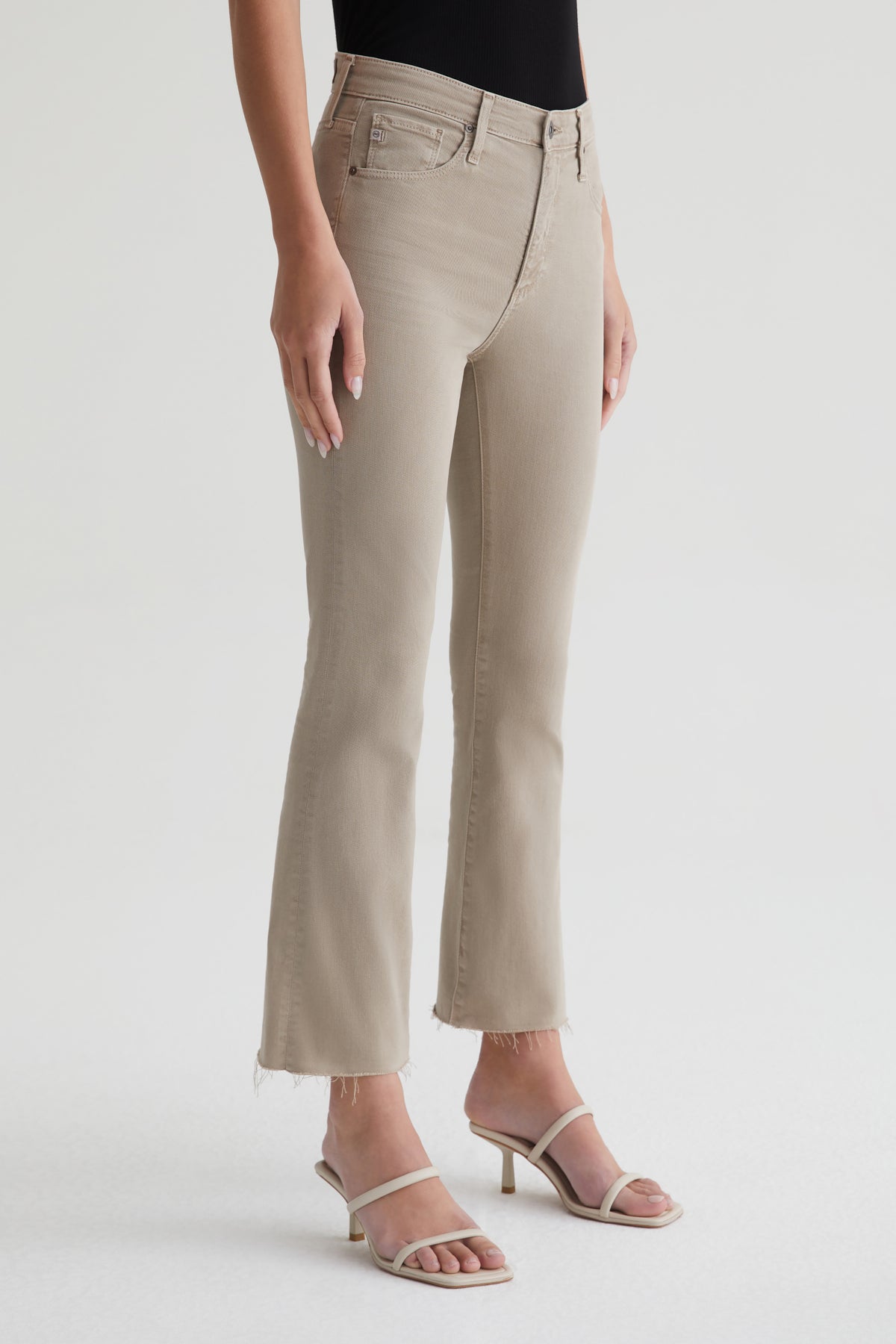 The Farrah Boot Crop jean is a high-rise cropped bootcut silhouette that's been sulfur-dyed for a faded khaki shade. The pair has a skinny fit through the legs before opening into subtly flared raw hems. Made from our exclusive AG Cloud Soft Denim™, these women’s bootcut jeans are designed in 8.7 oz. Hyper Soft Bull Denim, a left-hand twill fabric that allows the yarns to gently relax and untwist for a supple, velvety-soft feel. It's designed to get even softer as you wear it. Superstretch construction offers added comfort and enhanced recovery.