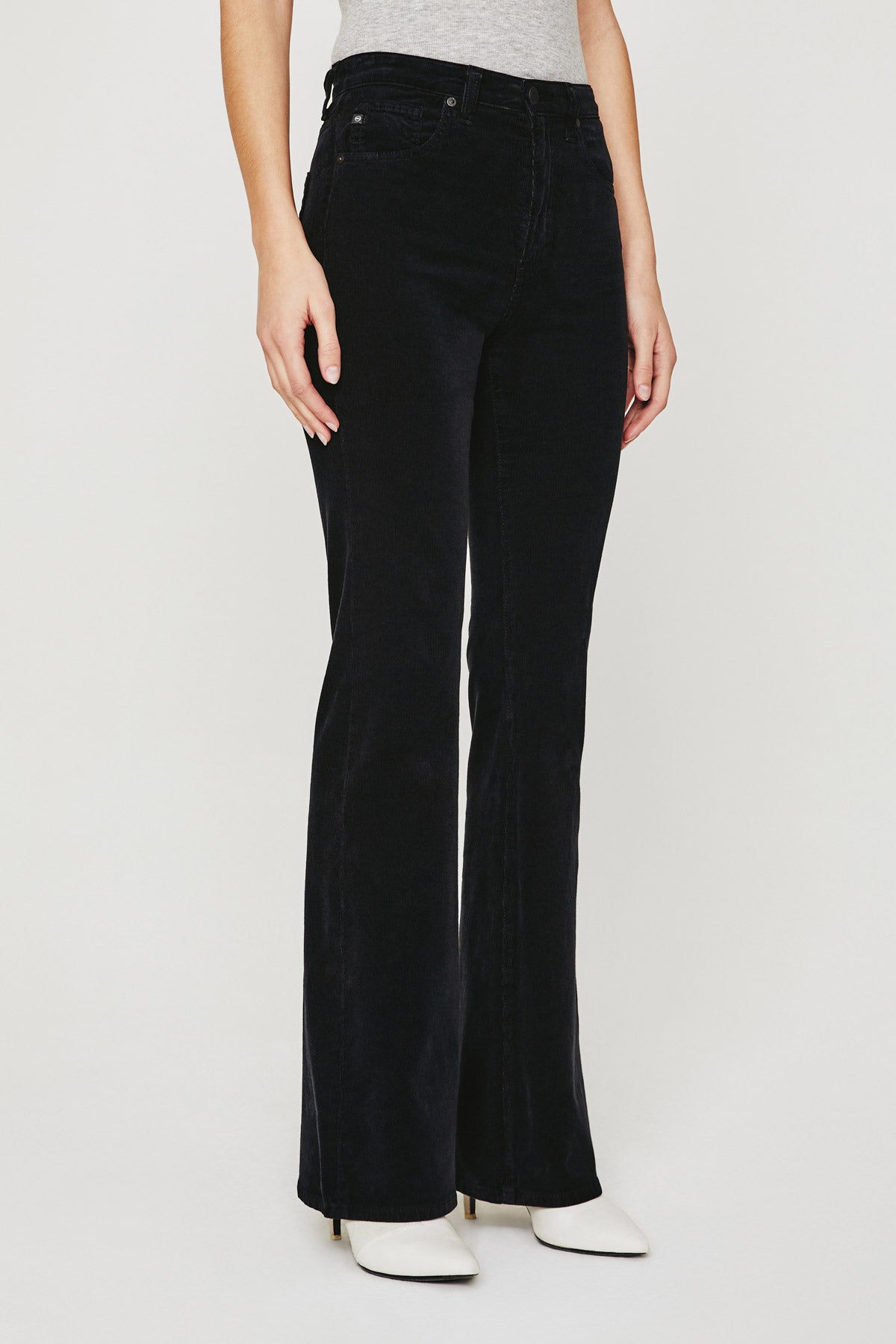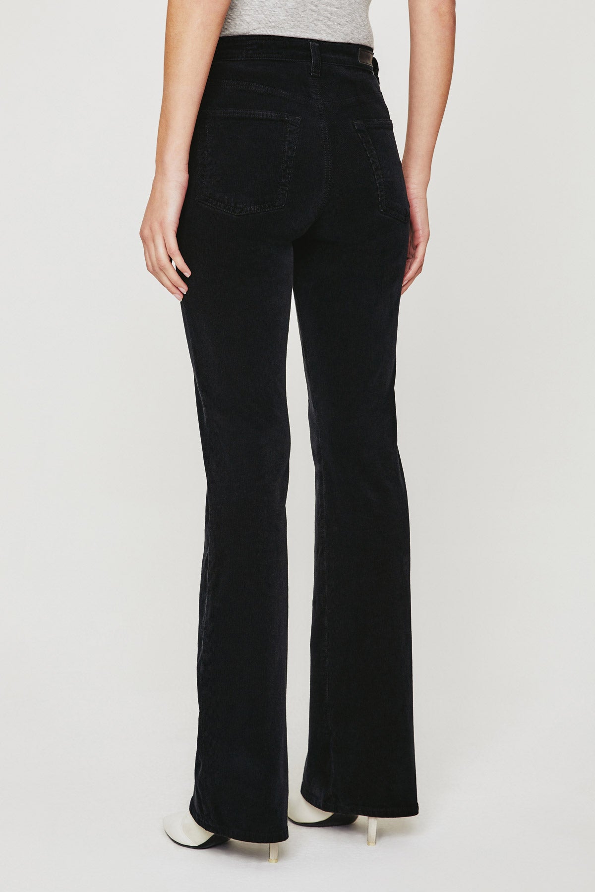 The Farrah Boot is a high-rise bootcut silhouette crafted from 7.5 oz. Opulent Stretch Velvet in classic black. The pair sits high on the waist and has a skinny fit through the leg before opening into a subtly flared hem.
