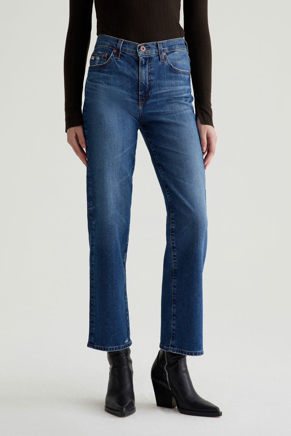 Brinley is our new mid-rise straight jean, done here in a dark blue wash with marigold contrast stitching and a 15-year AG-ed™ finish. Fading, whiskering, and hits of distressing near the hems. These five-pocket women's jeans sit right at the natural waist and fall to the perfect straight-leg silhouette for year-round styling. This pair comes in 11 oz. Lead Denim with comfort stretch.