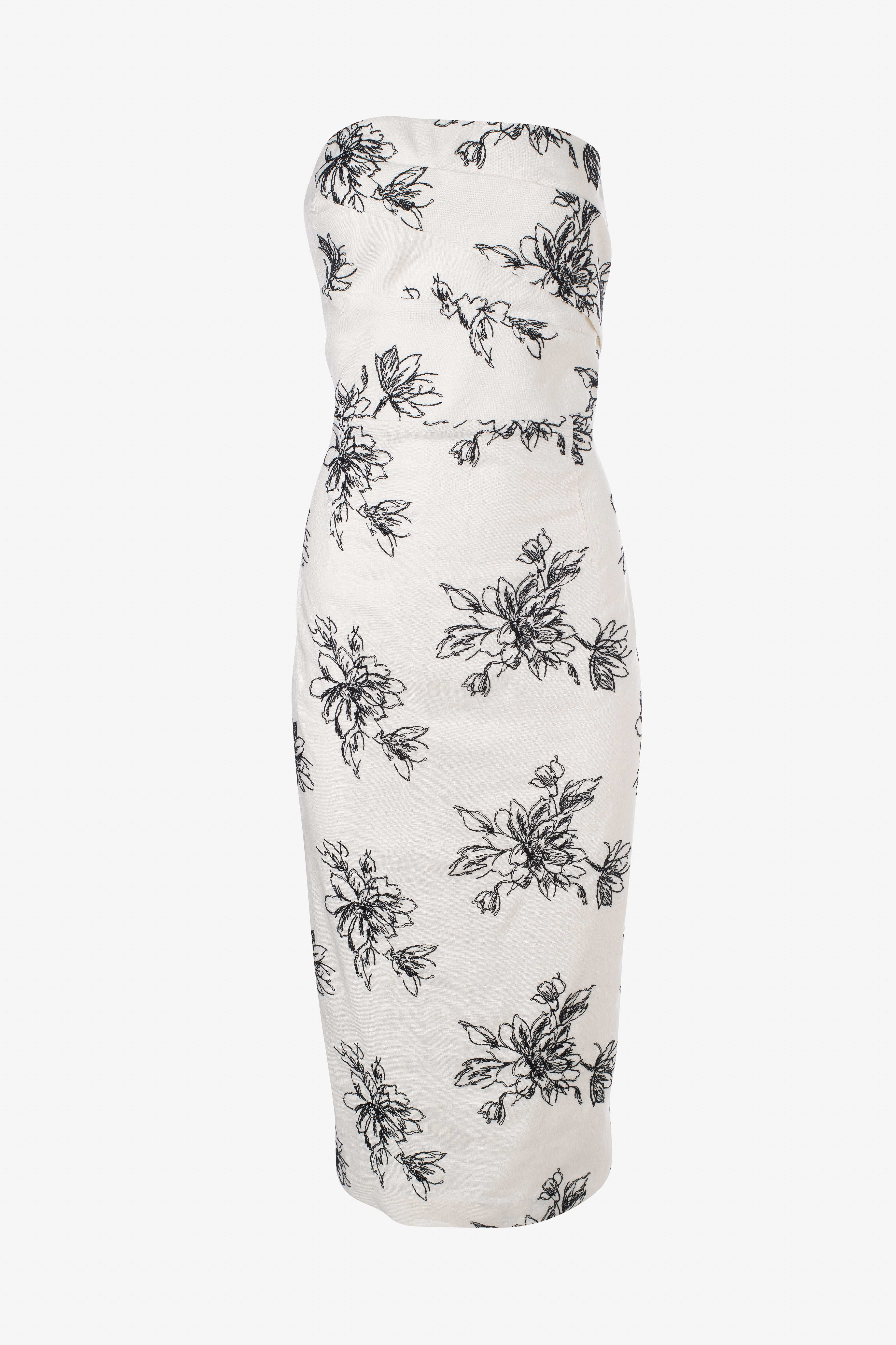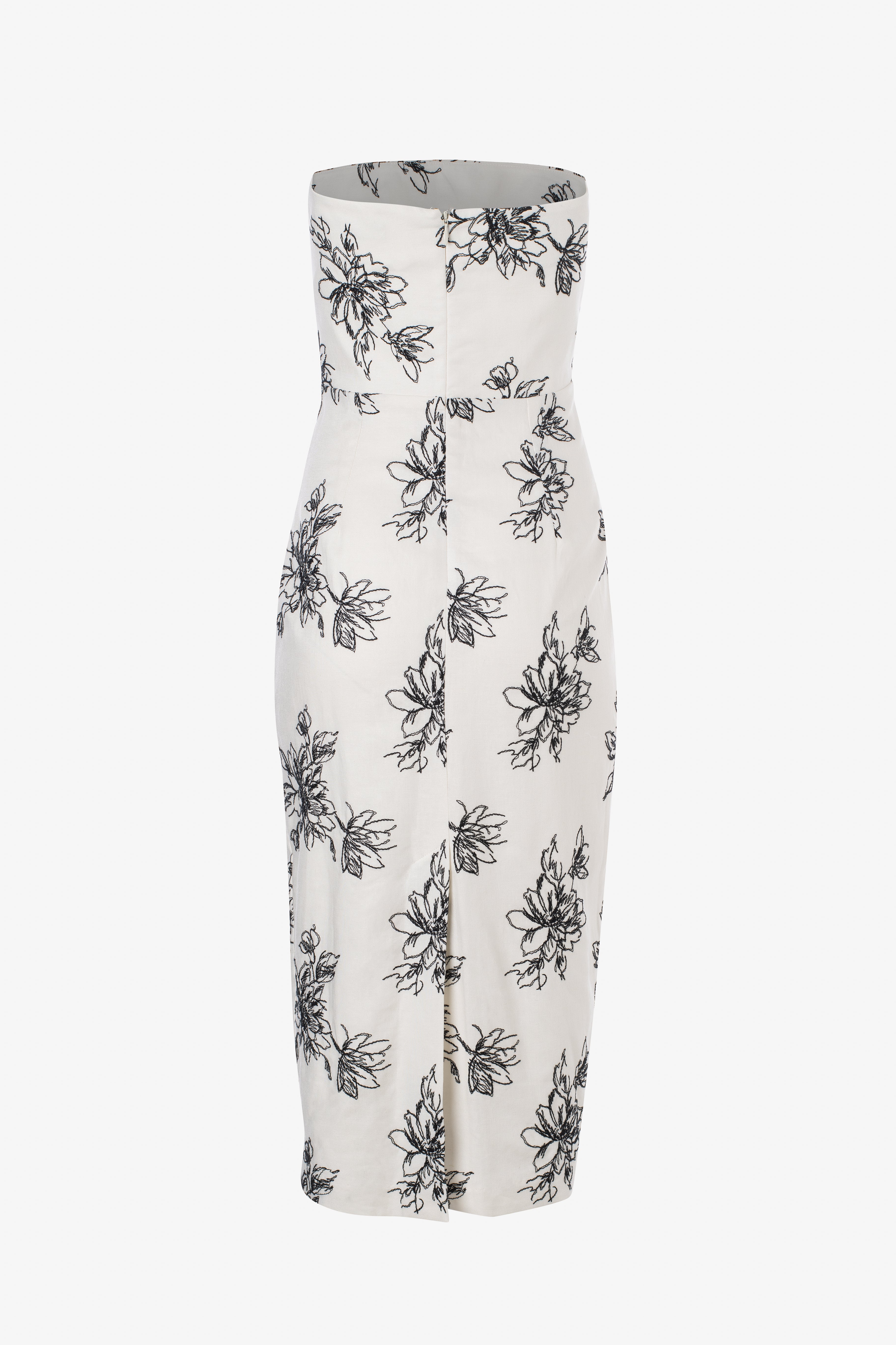 This embroidered mid-length strapless dress combines femininity and refinement. Its structured bodice enhances the silhouette, while the delicate embroidery adds a touch of luxury and elegance. Ideal for special occasions.