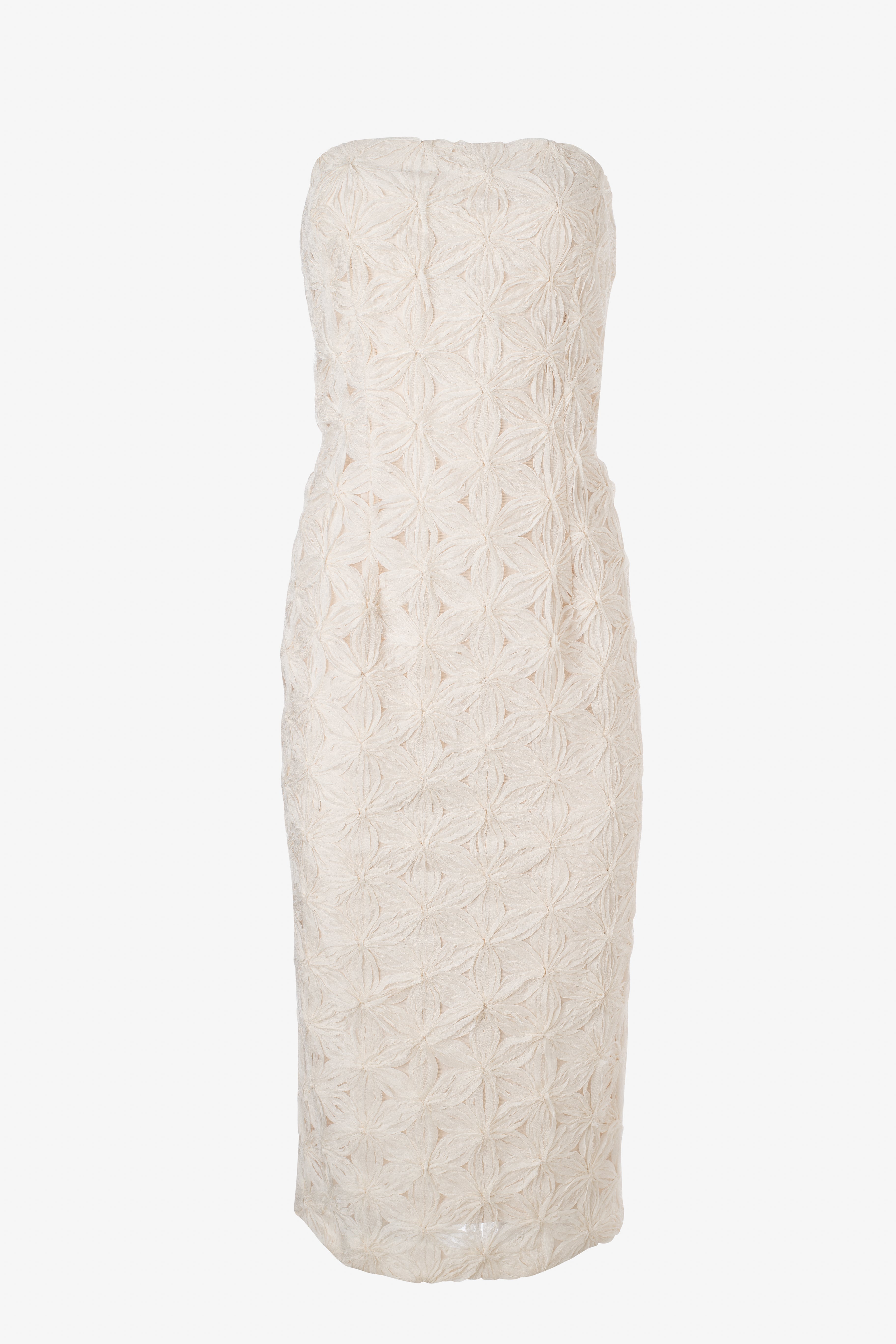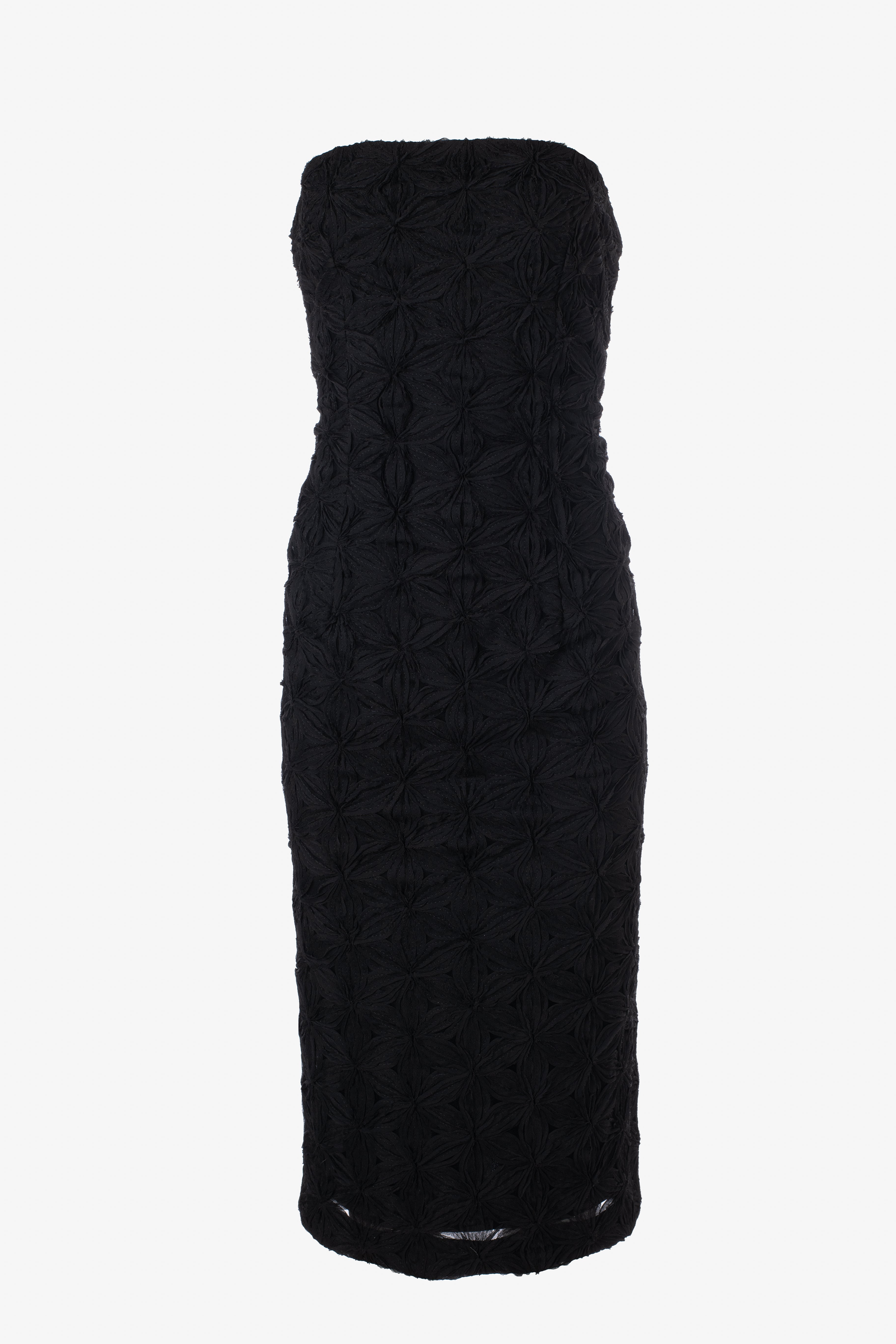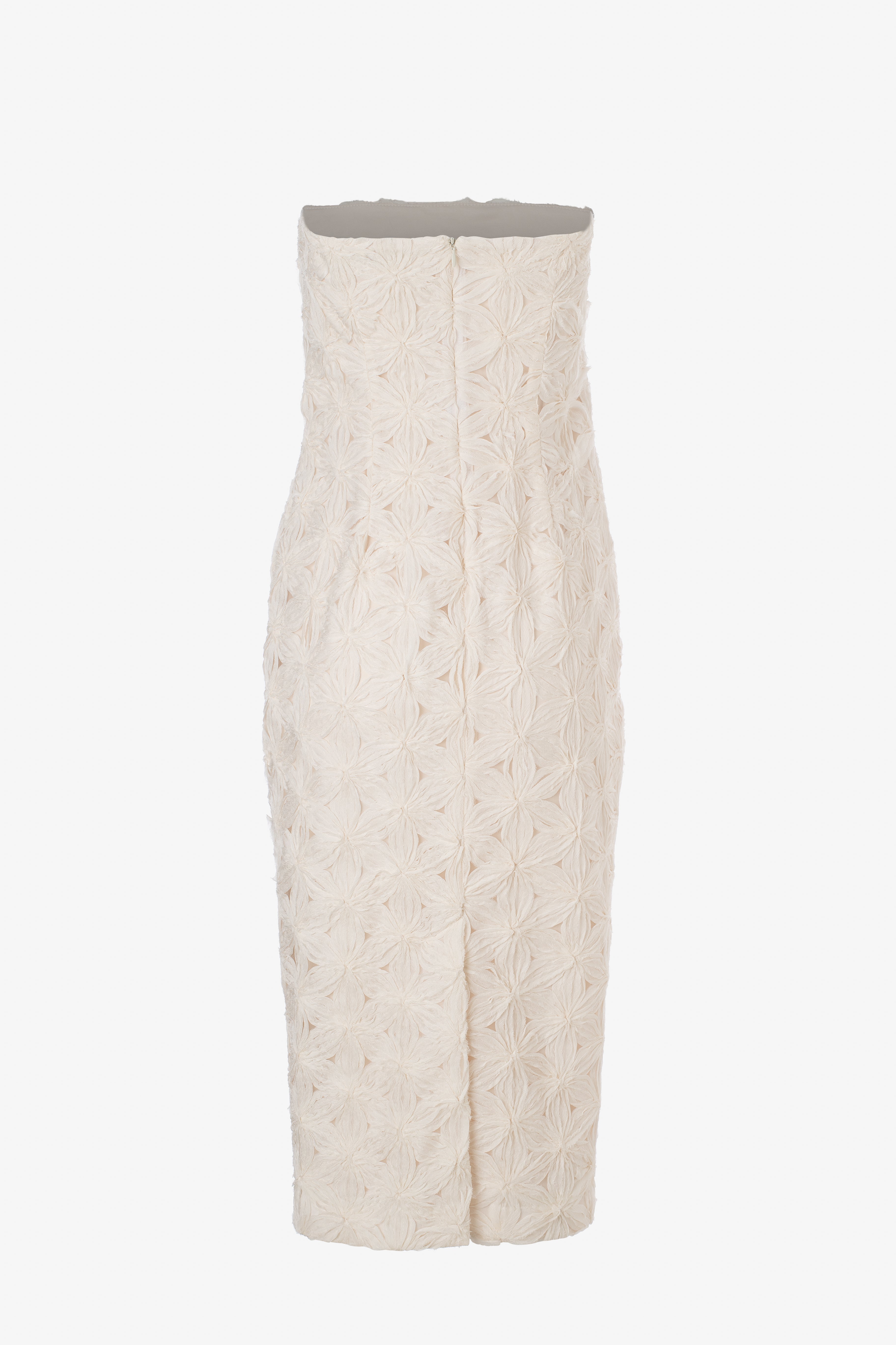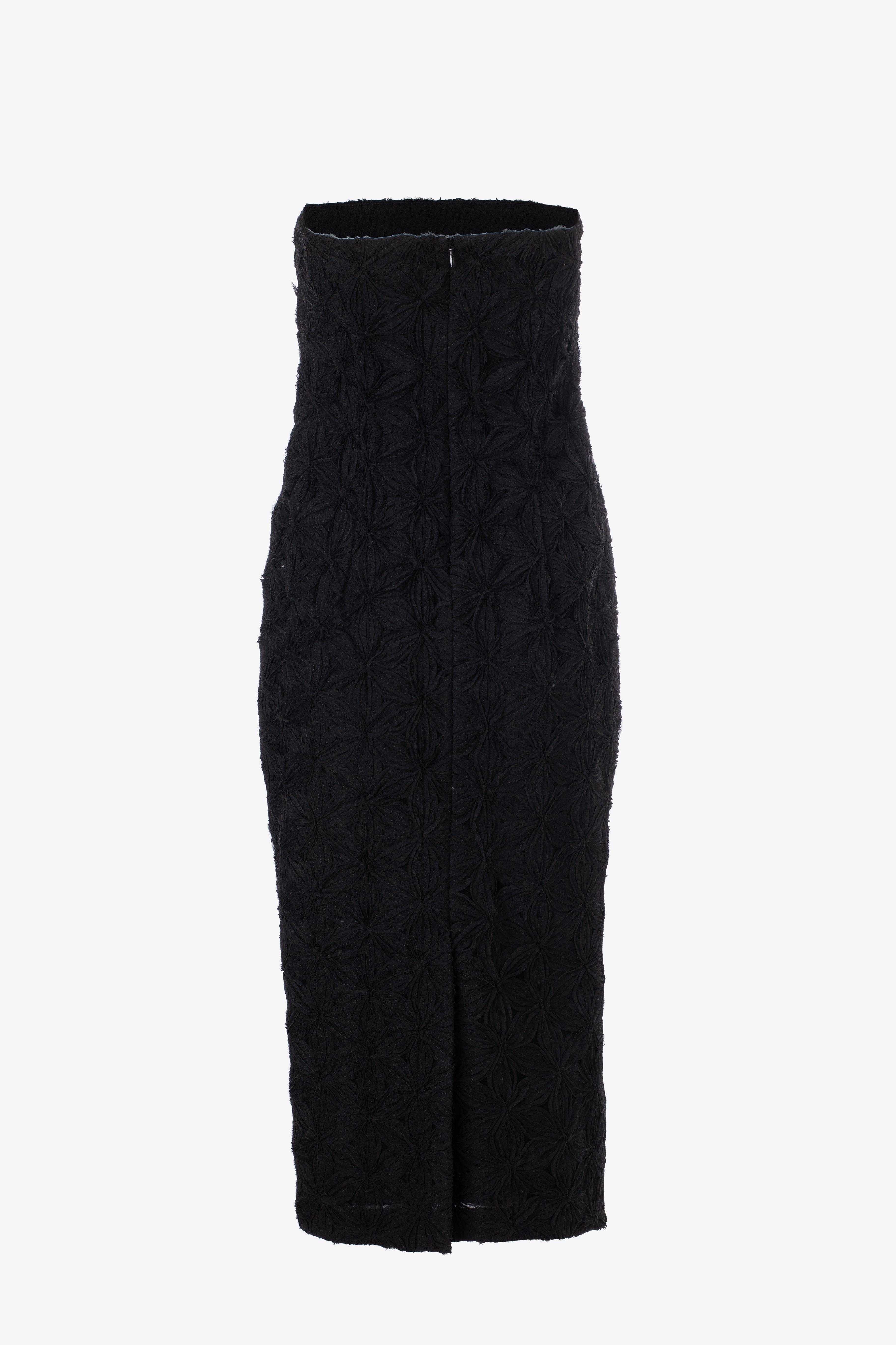 This mid-length strapless dress seduces with its textured floral fabric, which adds relief and romance to the silhouette. Its sleek design highlights the shoulders and exudes modern elegance.
