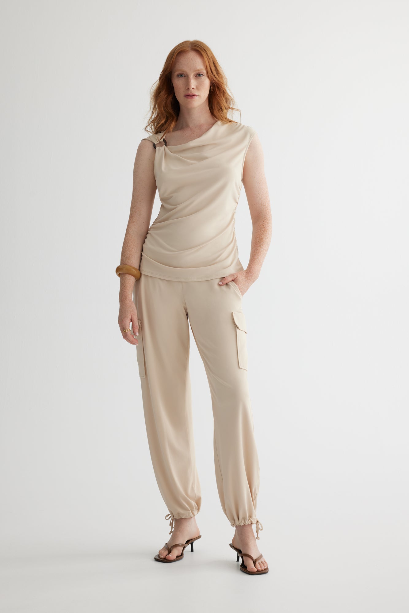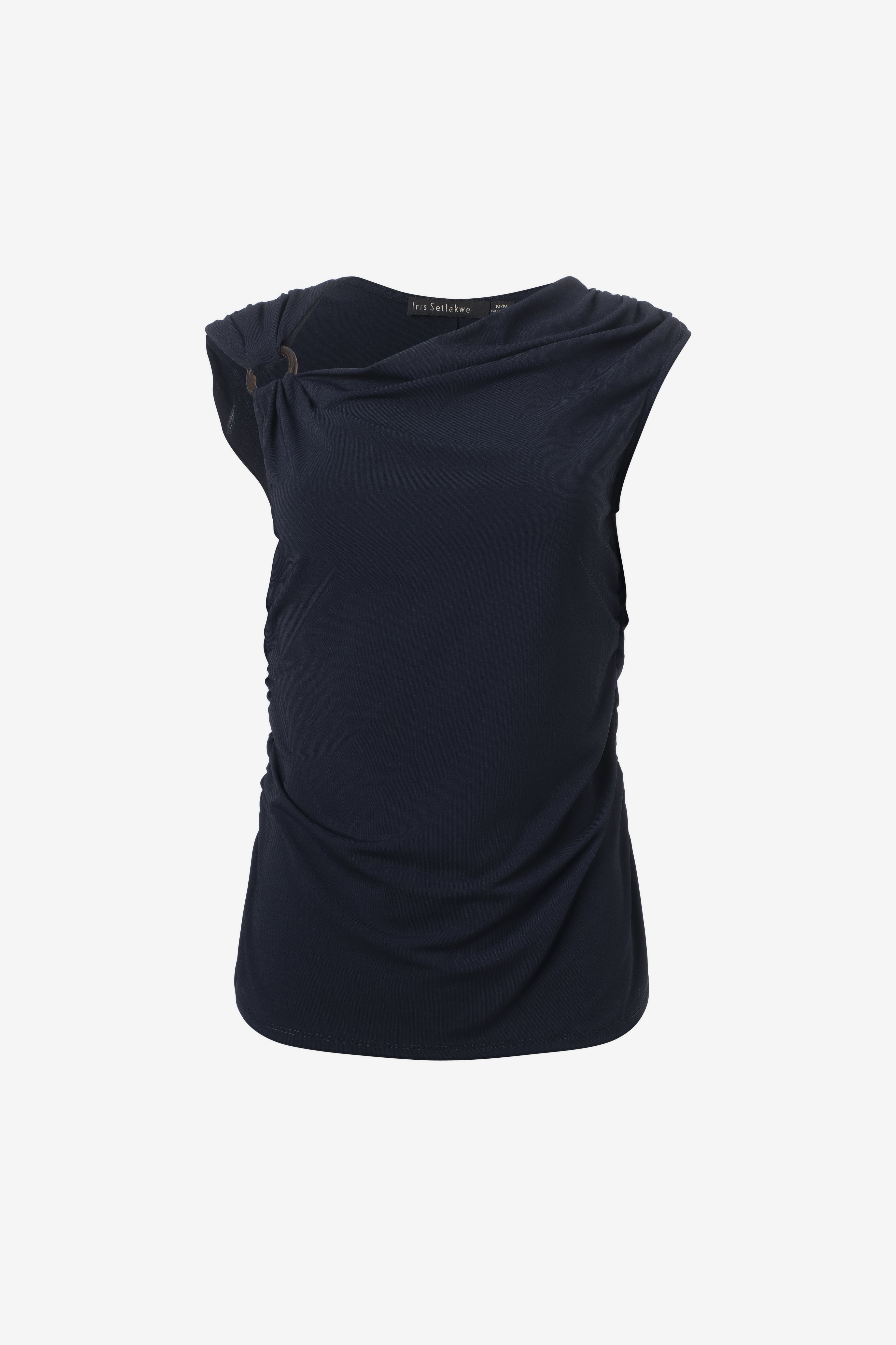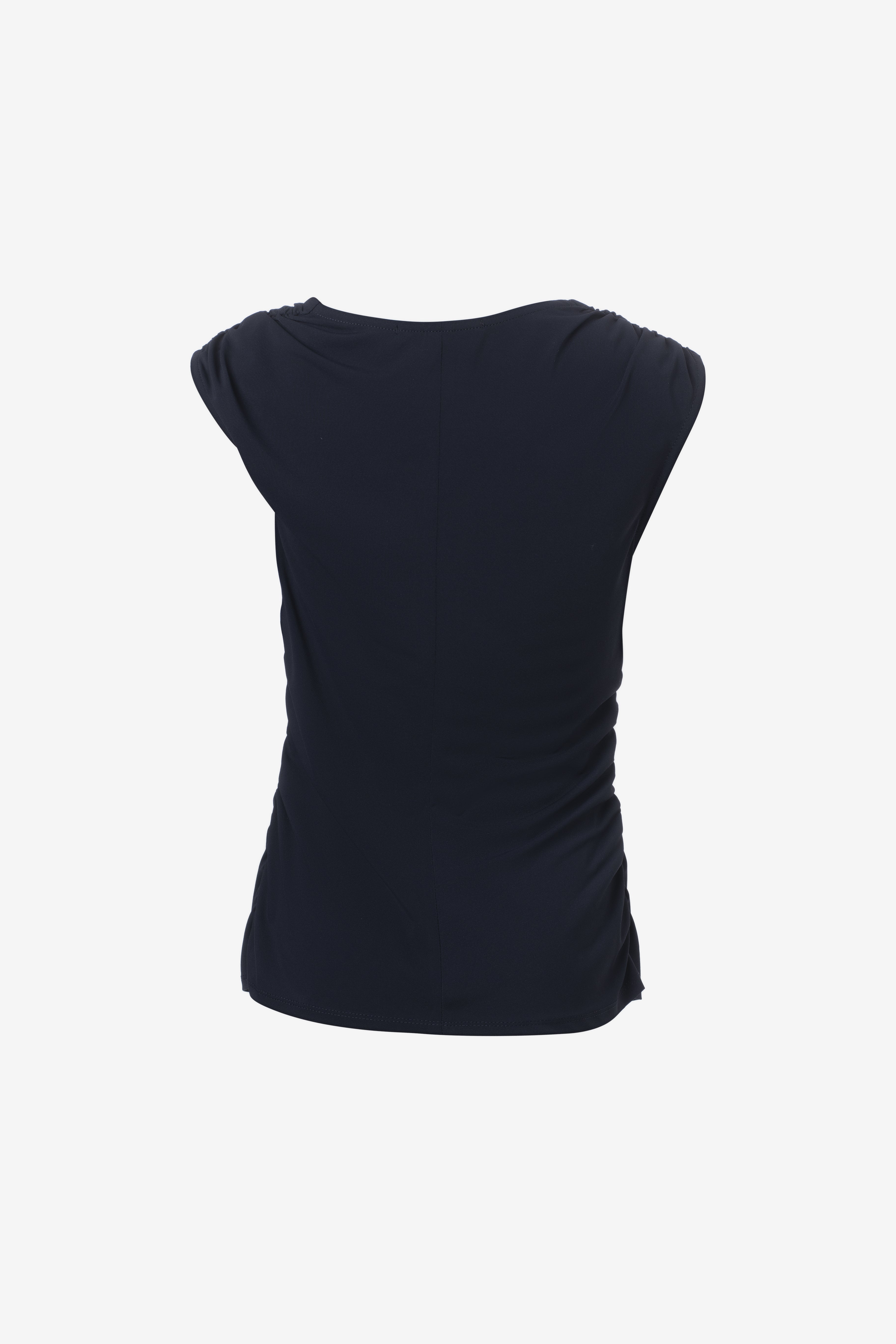 This pleated top is made from our classic matte jersey fabric. The asymmetrical sleeves and jewel detail on the right add delicacy to this piece.