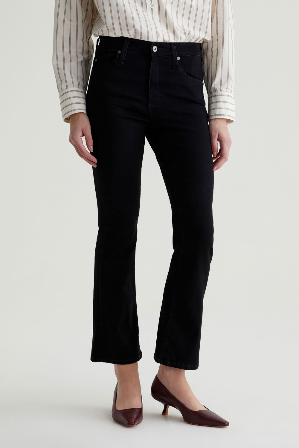 The Farrah Boot is a mid-rise bootcut jean featuring a deep, dark shade of black. Cut from 9 oz. True Vant Denim with figure-flattering stretch, the pair sits right at the natural waist and has a skinny fit through the legs before opening into a subtle flare at the hems.